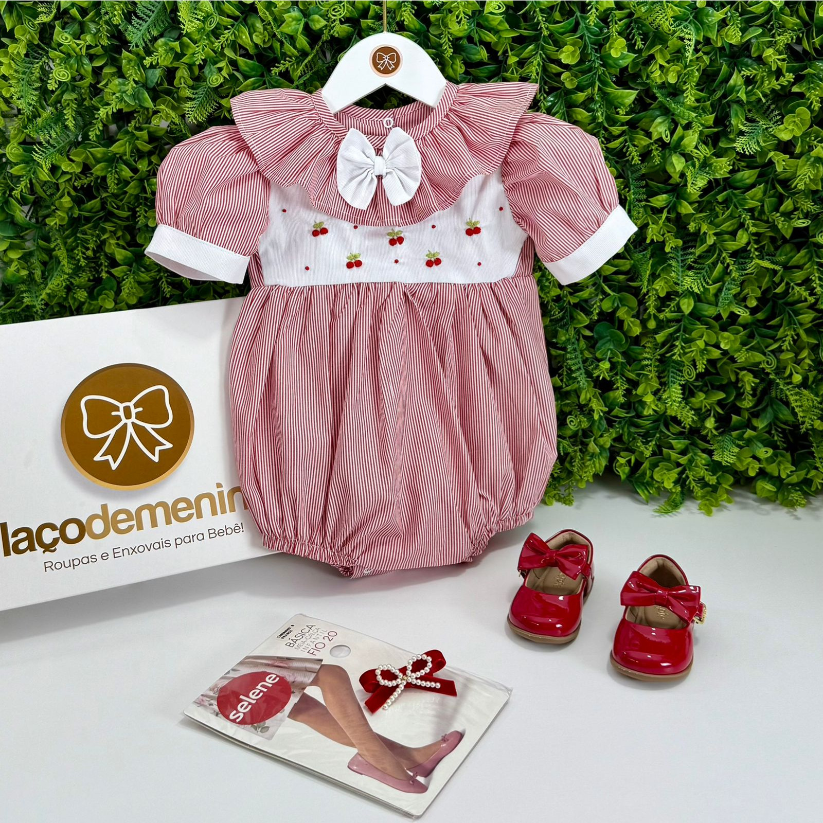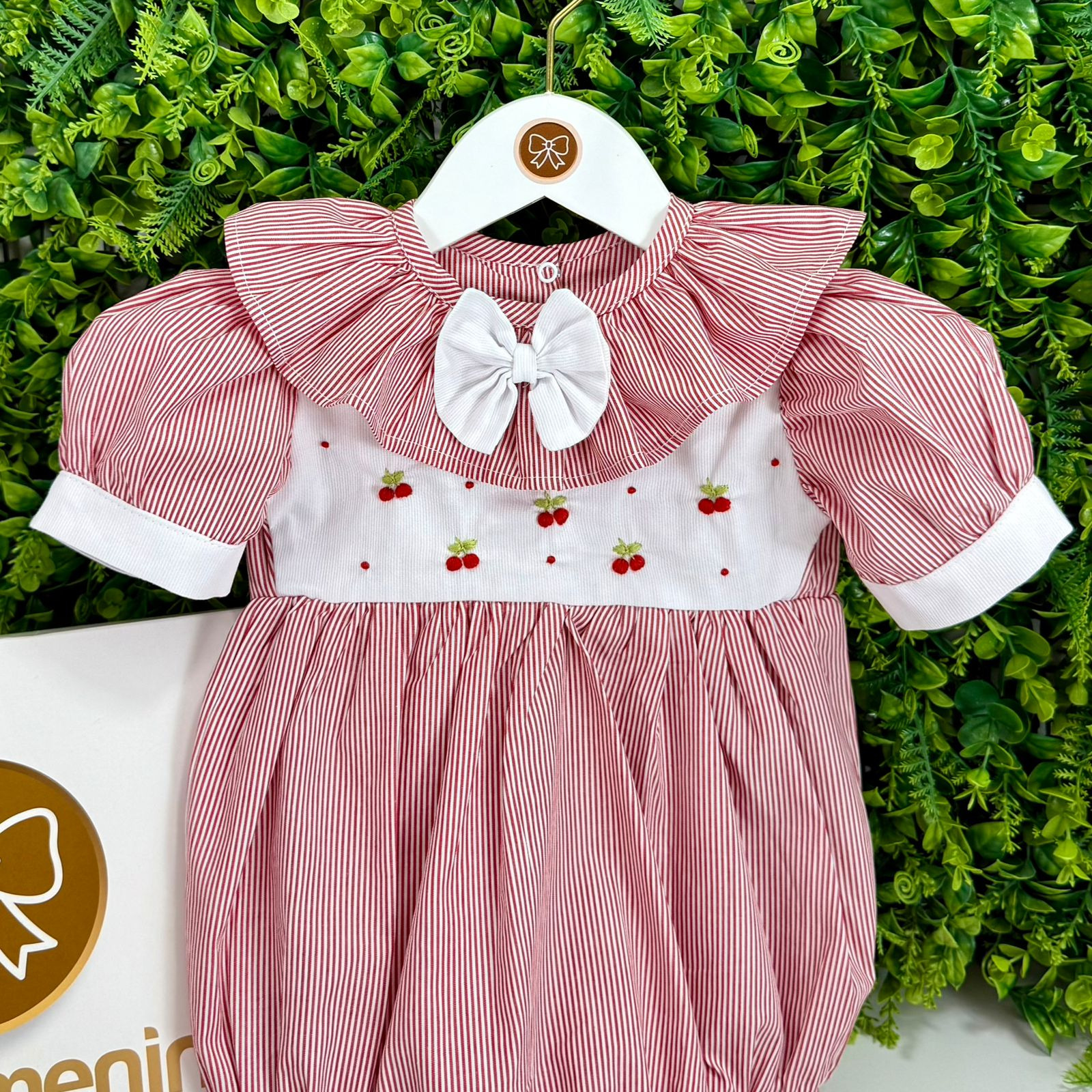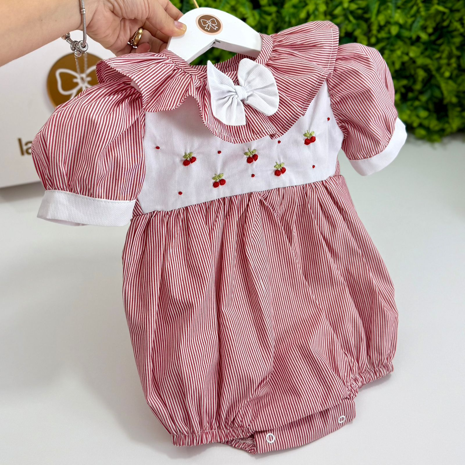 Pimpão infantil em tecido 100% algodão com estampa de listras vermelhas. Possui delicado bordado manual de cerejinha no busto e laço aplicado na golinha, trazendo charme e delicadeza à peça. Fechamento com botões imantados no fundo e nas costas, garantindo praticidade na hora de vestir.