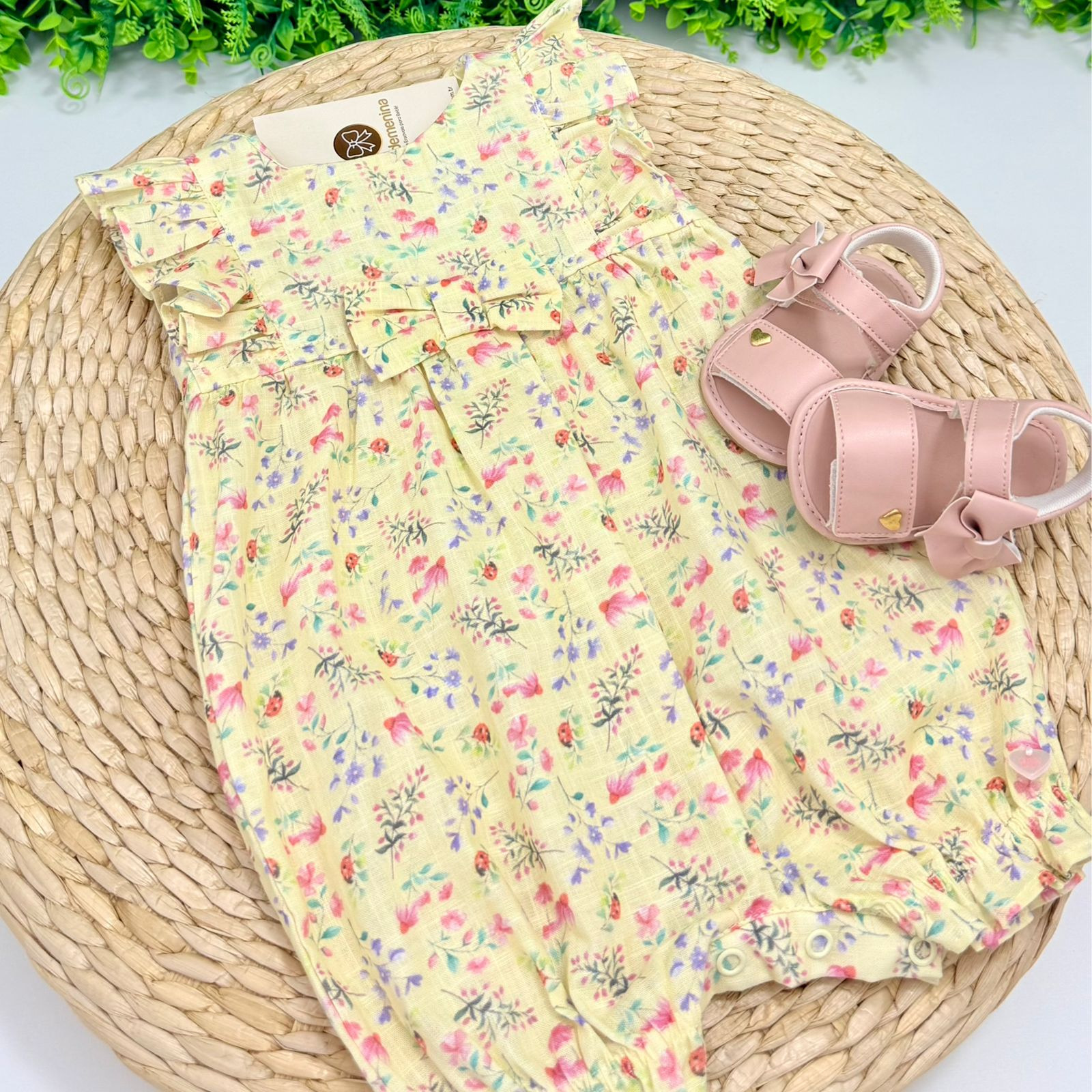 Um macacão encantador, pensado para vestir sua bebê com muito conforto e charme. Produzido em tecido macio e respirável, ele apresenta uma estampa floral suave sobre fundo amarelo claro, ideal para compor looks leves e delicados.