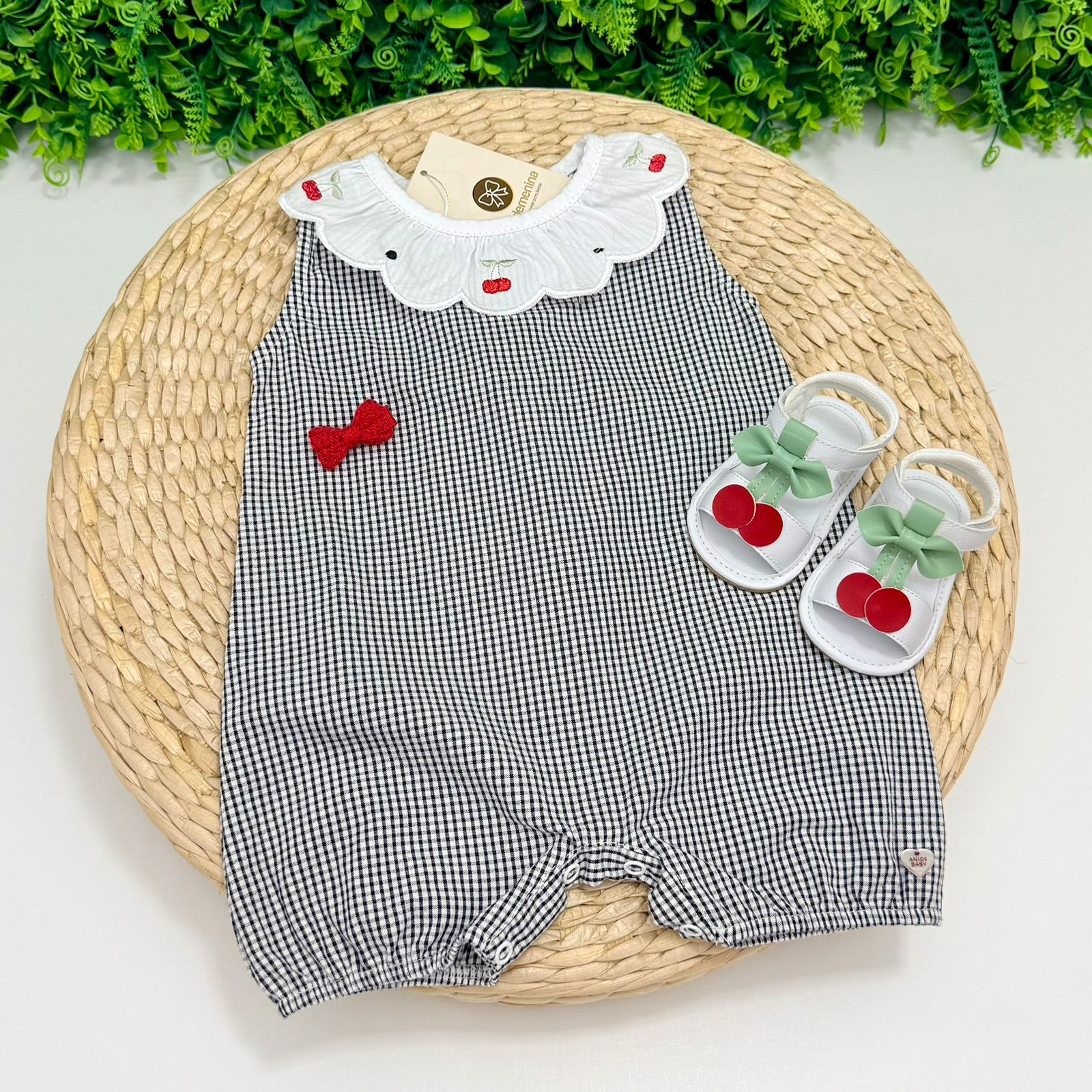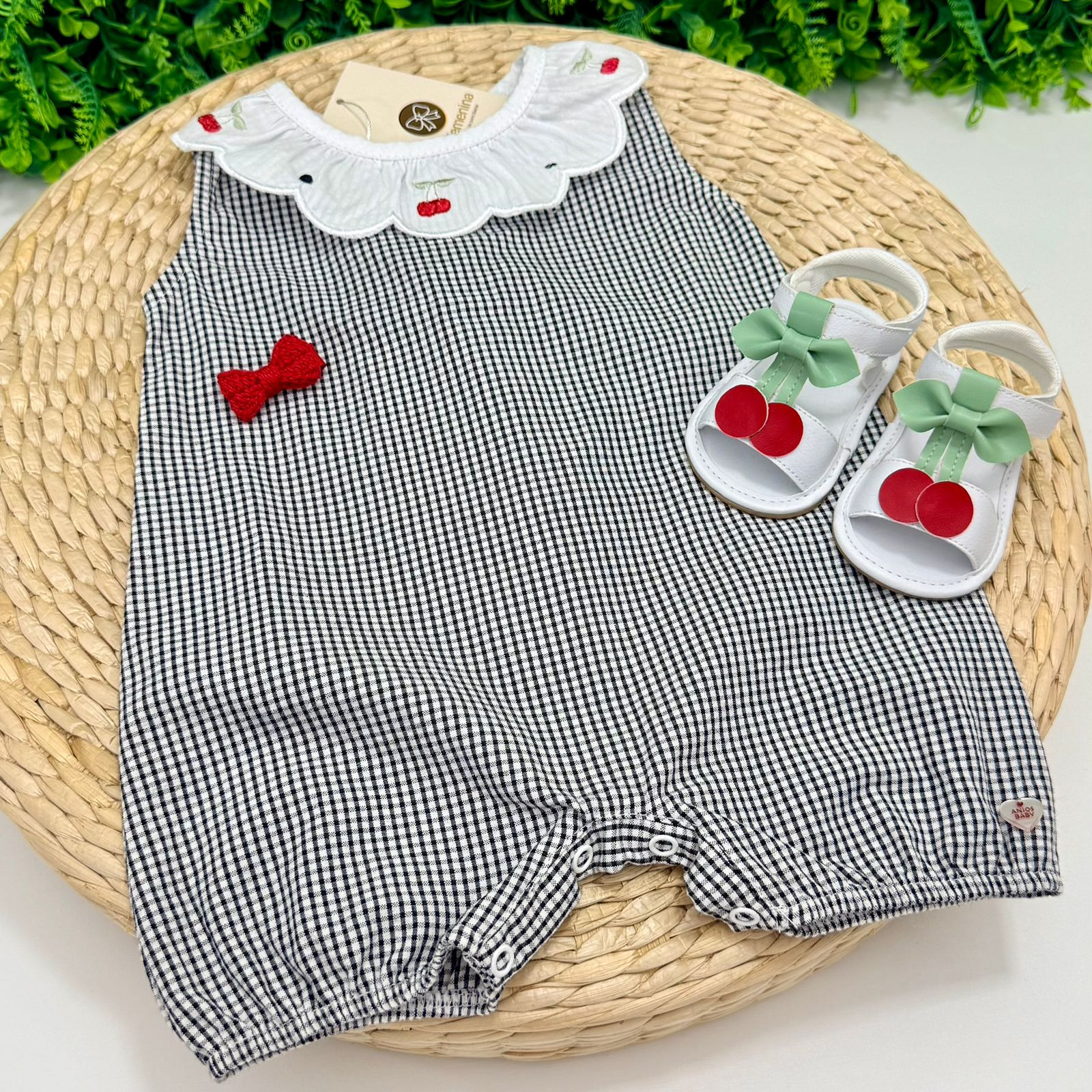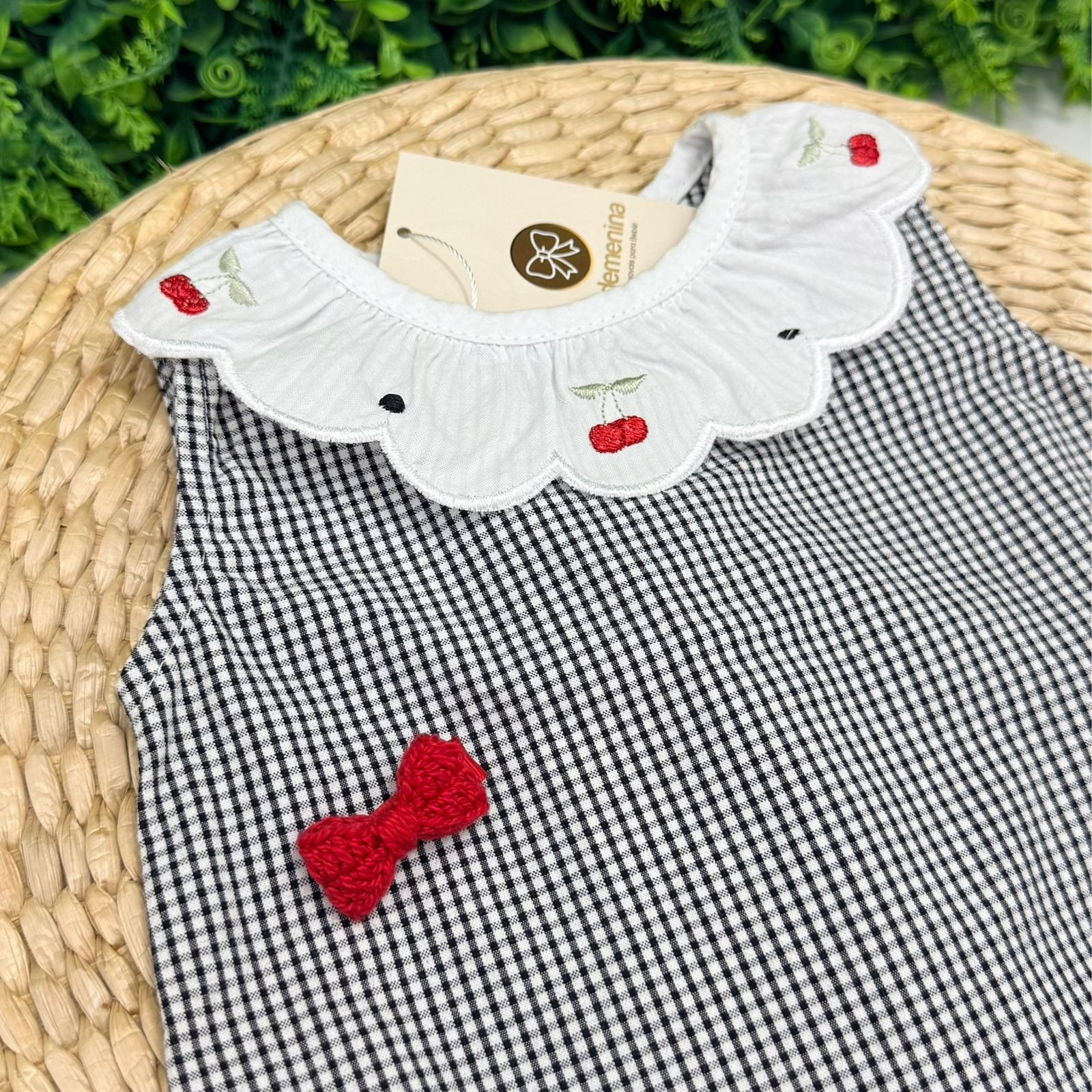Romper confeccionado em tecido leve e confortável, com estampa xadrez clássica em preto e branco. Possui gola branca bordada com cerejinhas, acabamento impecável. Modelo prático, com fechamento entre as pernas, pensado para garantir conforto e liberdade nos movimentos