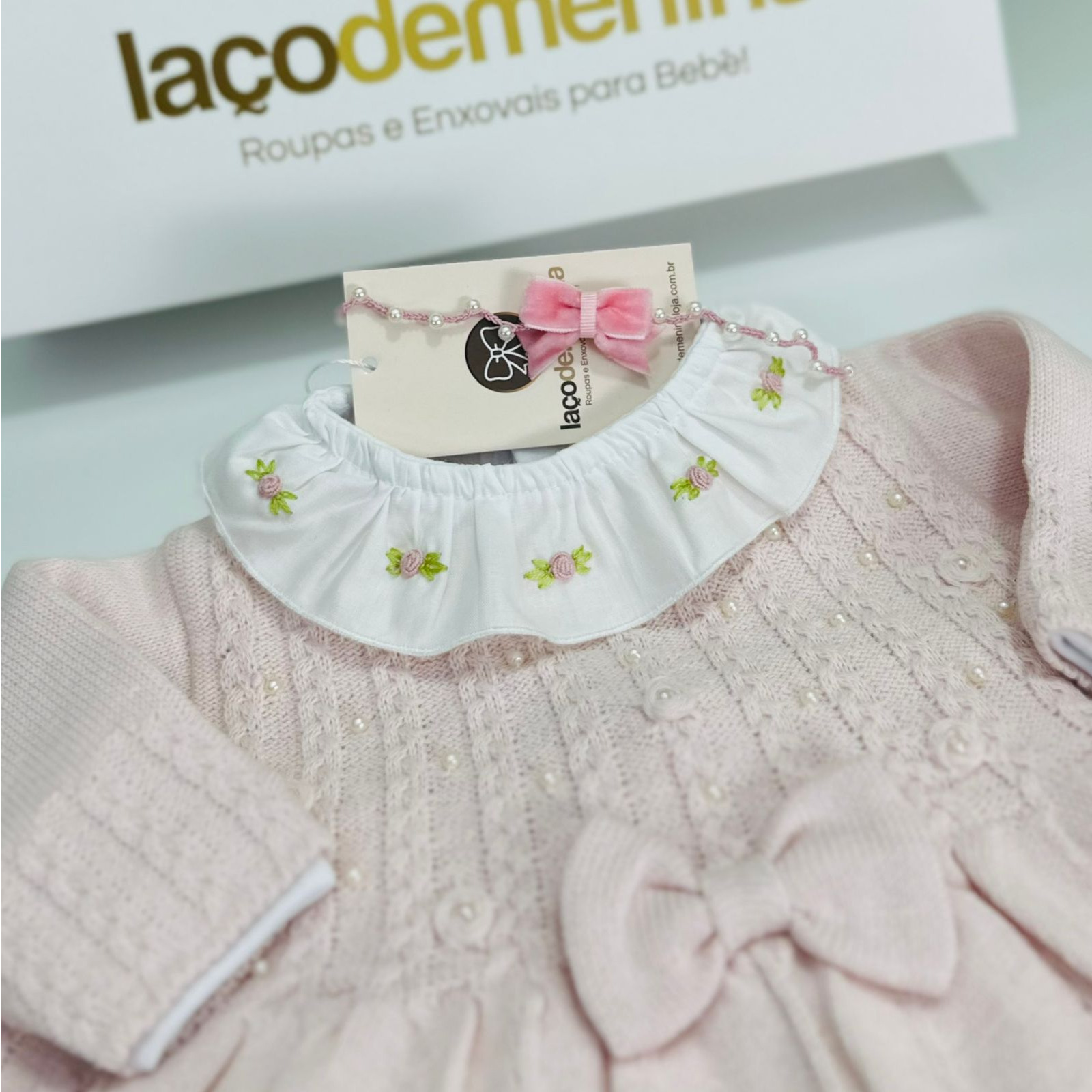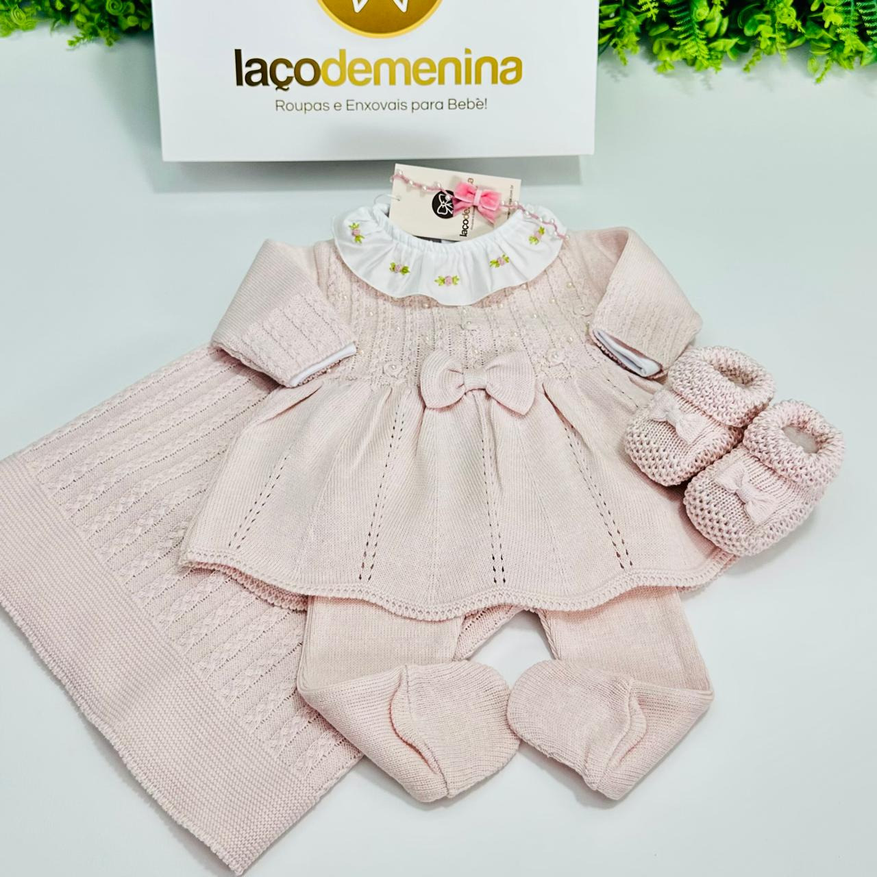 Saída de maternidade confeccionada em linha antialérgica de tricô, composta por 50% algodão e 50% acrílica.
