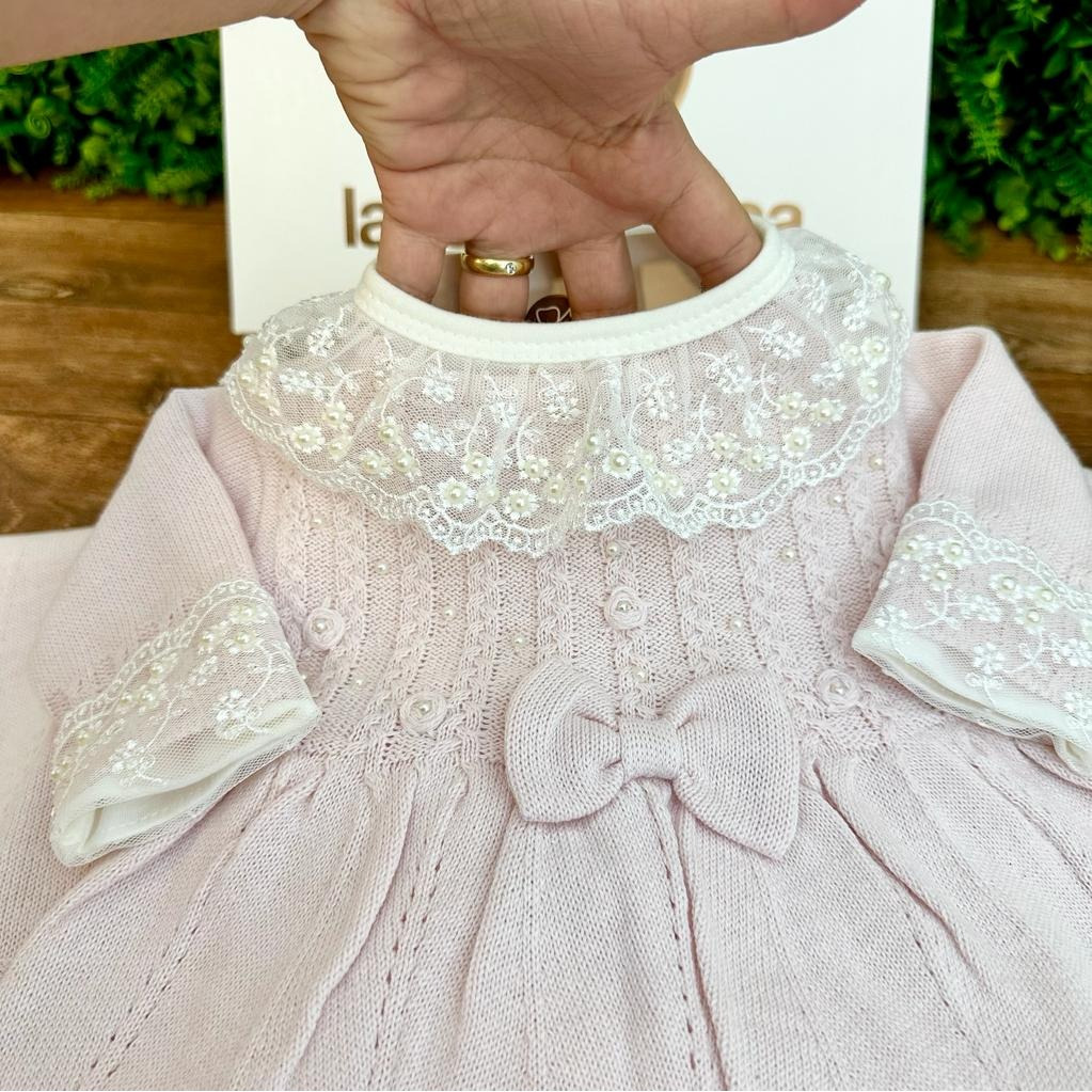 Saída de maternidade confeccionada em linha antialérgica de tricô, com composição de 50% algodão e 50% acrílica.