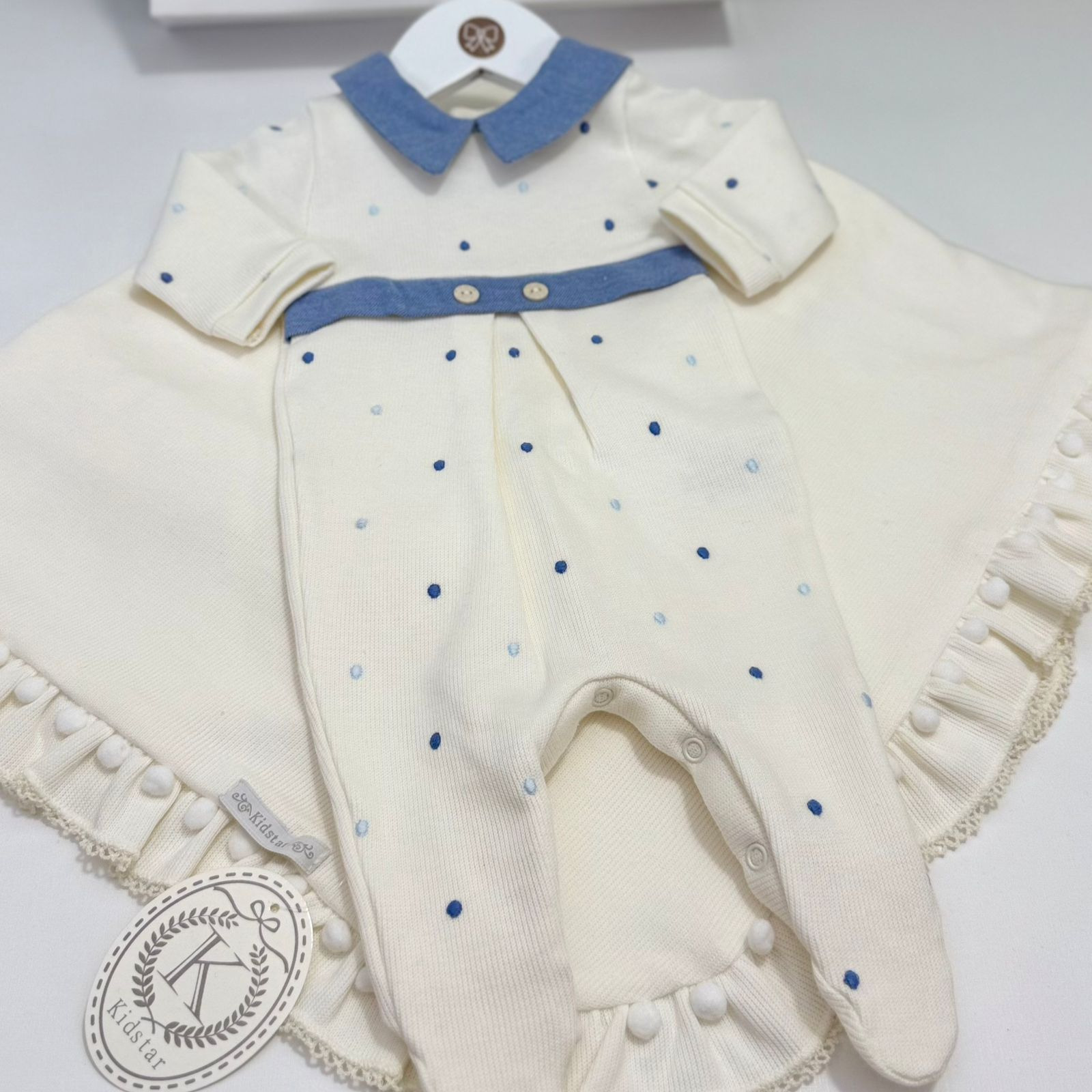 Saída maternidade masculina confeccionada em tricotil 100% algodão na delicada cor off-white. O conjunto inclui um macacão com bordado de poá ao longo de todo o comprimento e botões imantados na parte inferior, que facilitam a troca de fraldas com praticidade. Acompanha uma manta na mesma tonalidade, criando uma combinação charmosa e acolhedora para esse momento tão especial!