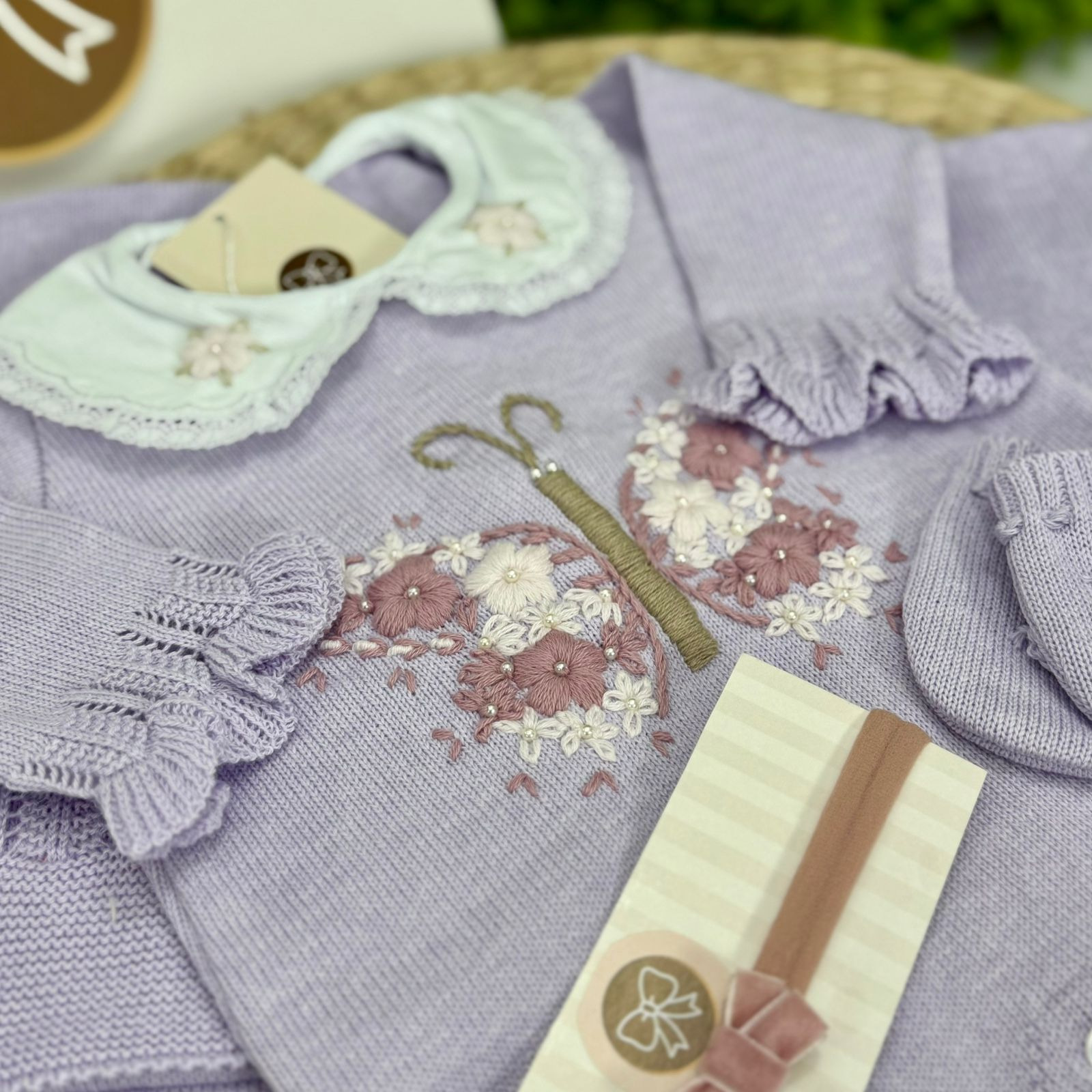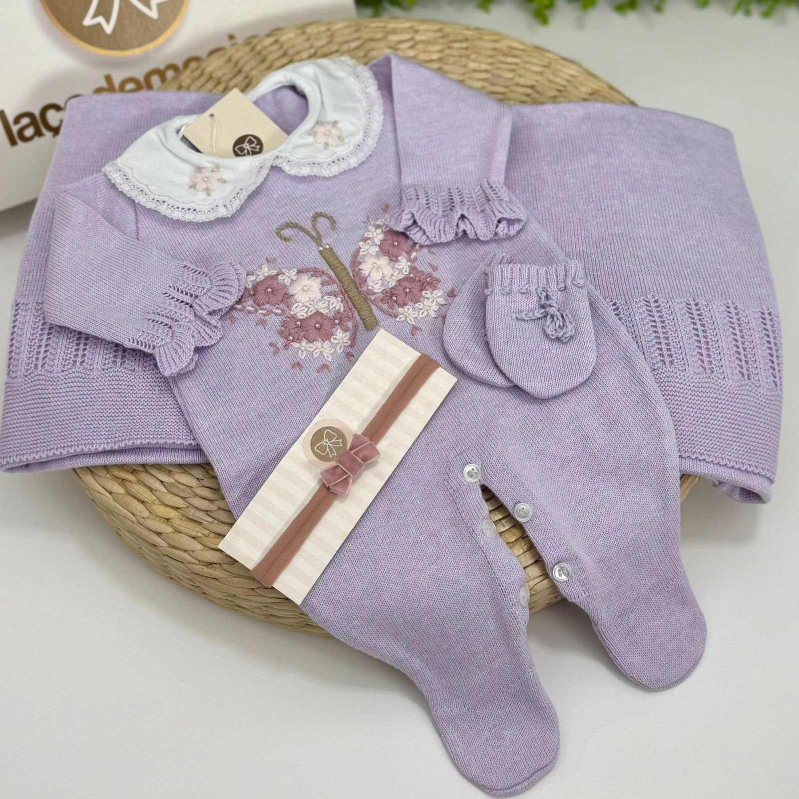 Conjunto de saída maternidade bordada em linha de tricô antialérgica 50% algodão 50% acrílico na cor lavanda.