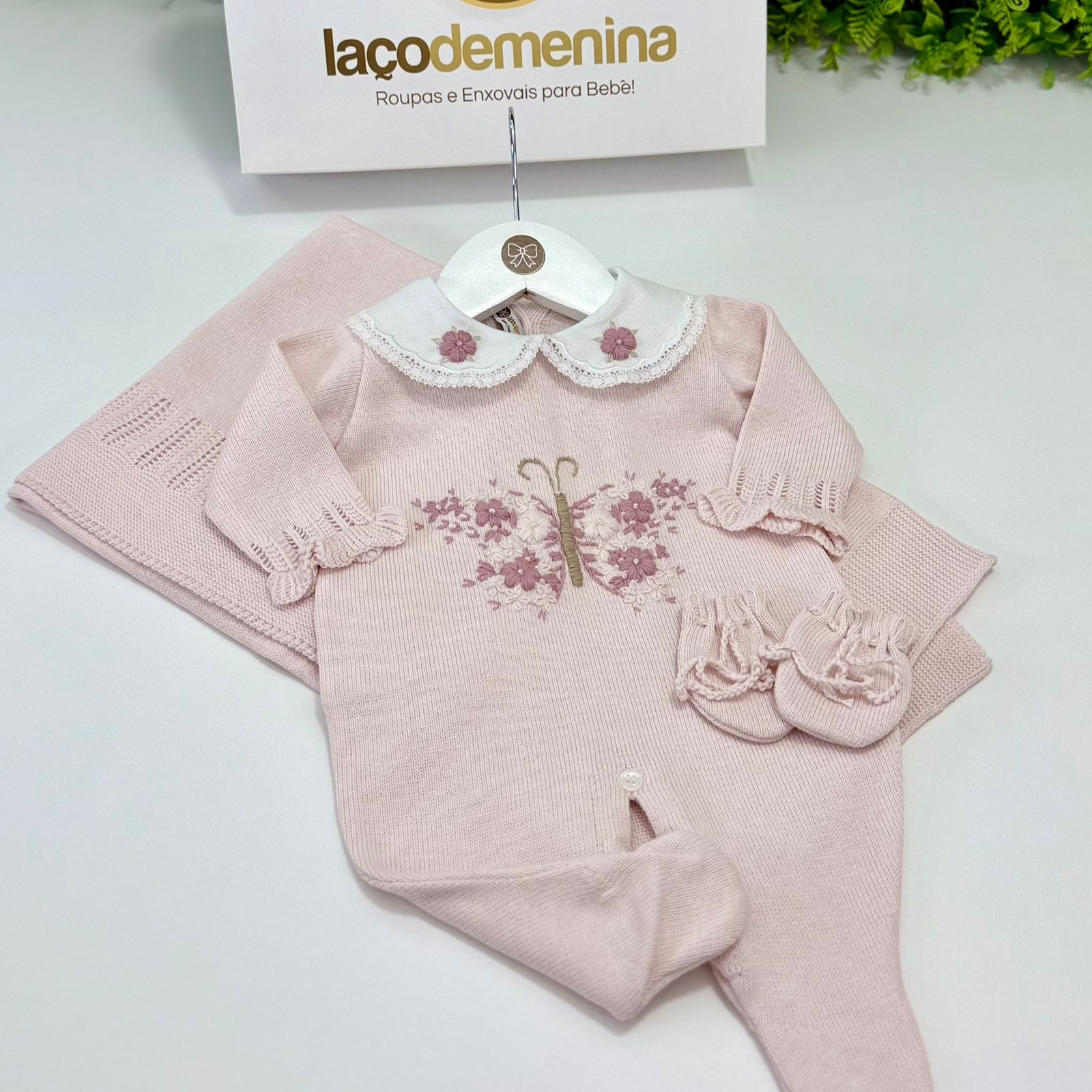 Composto por: Um macacão com pezinho, delicadamente bordado na gola e no busto. Para maior praticidade na hora da troca, conta com botões na parte inferior e nas costas. Acompanha uma manta na mesma tonalidade, garantindo conforto e um toque de carinho para a bebê e um par de luvinhas.