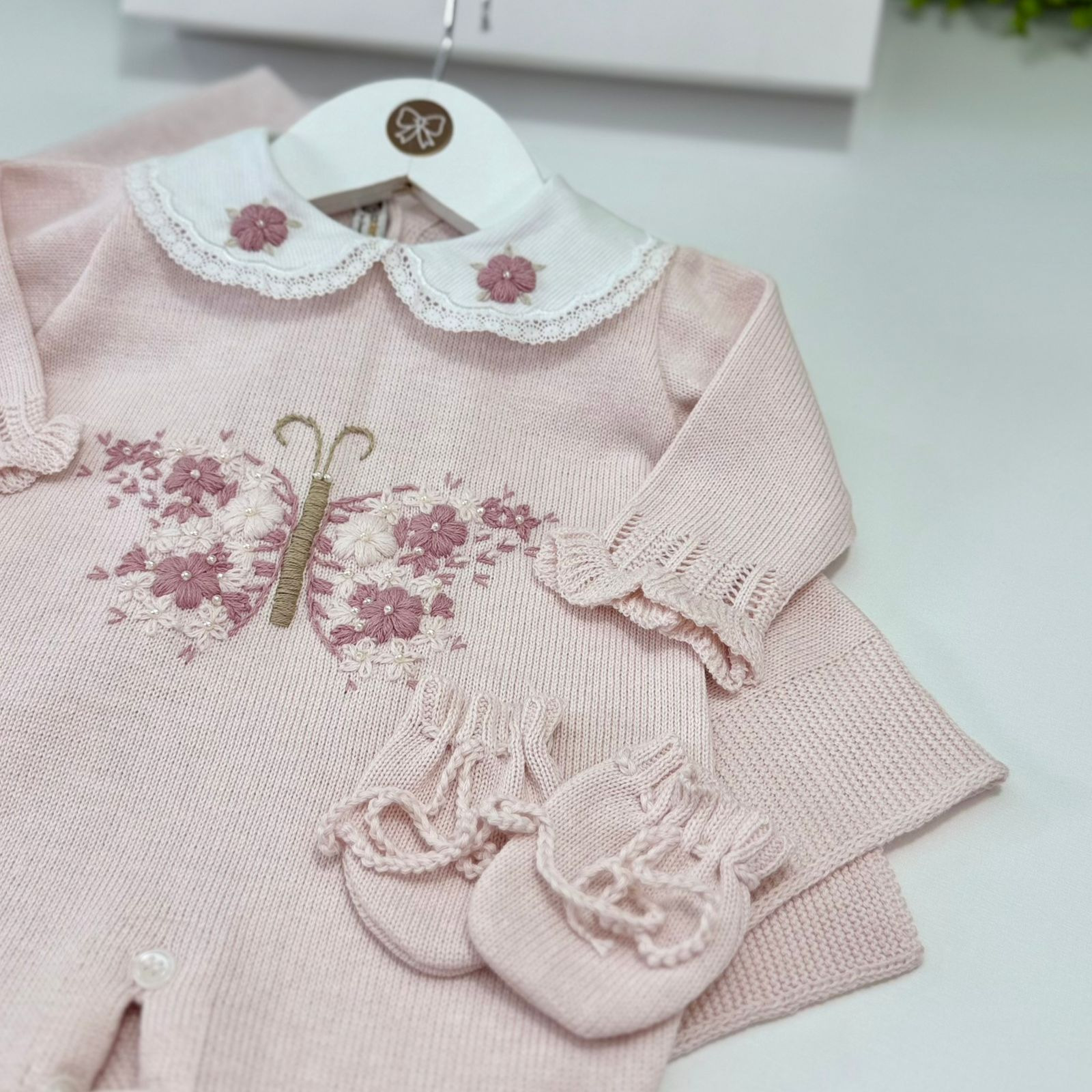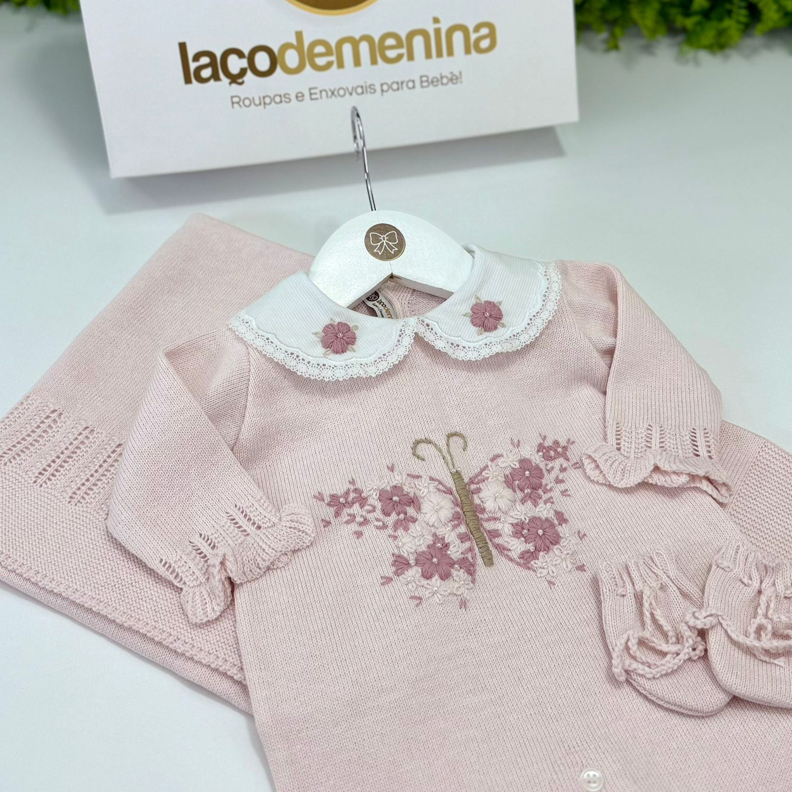 Conjunto de saída maternidade bordada em linha de tricô antialérgica 50% algodão 50% acrílico na cor rosa claro.