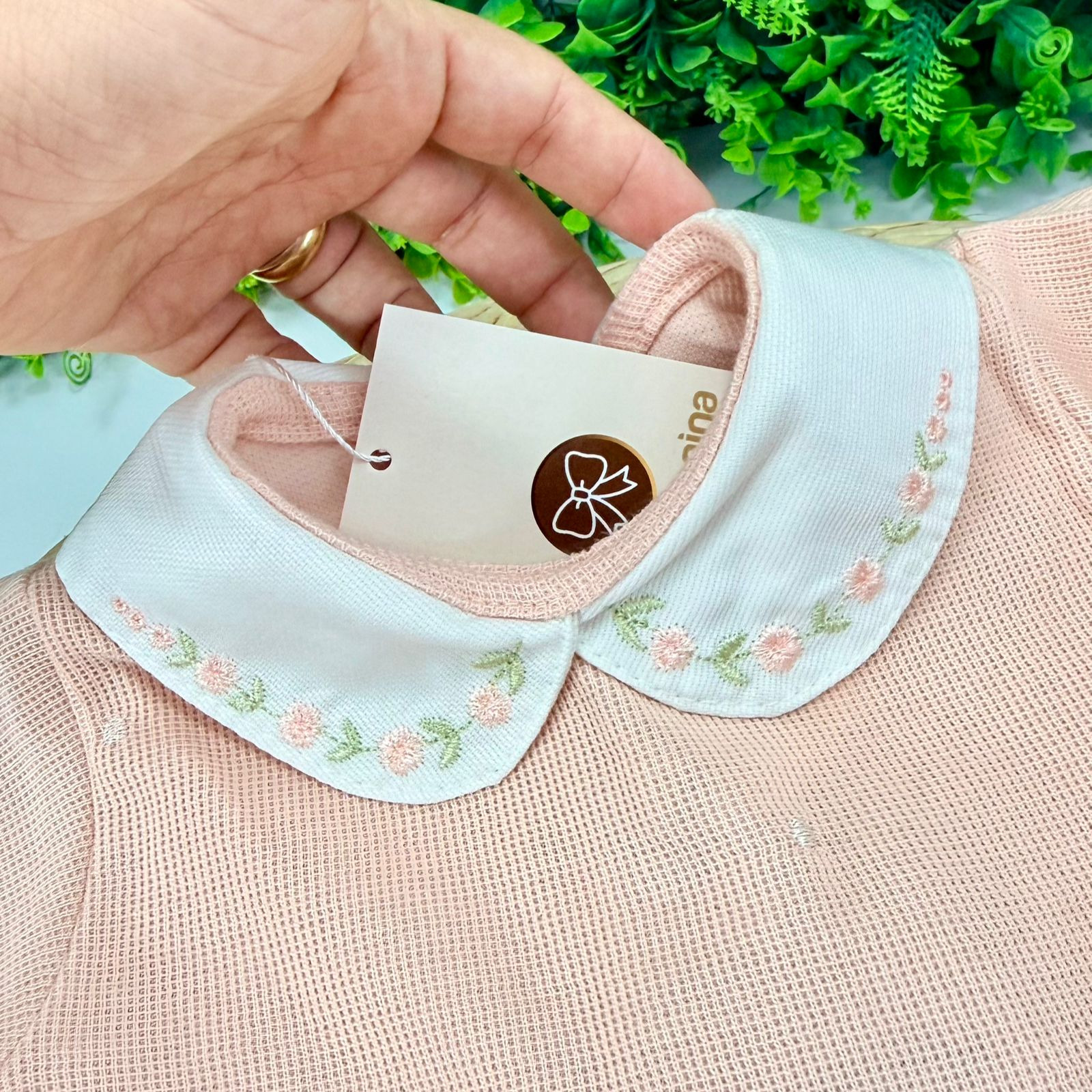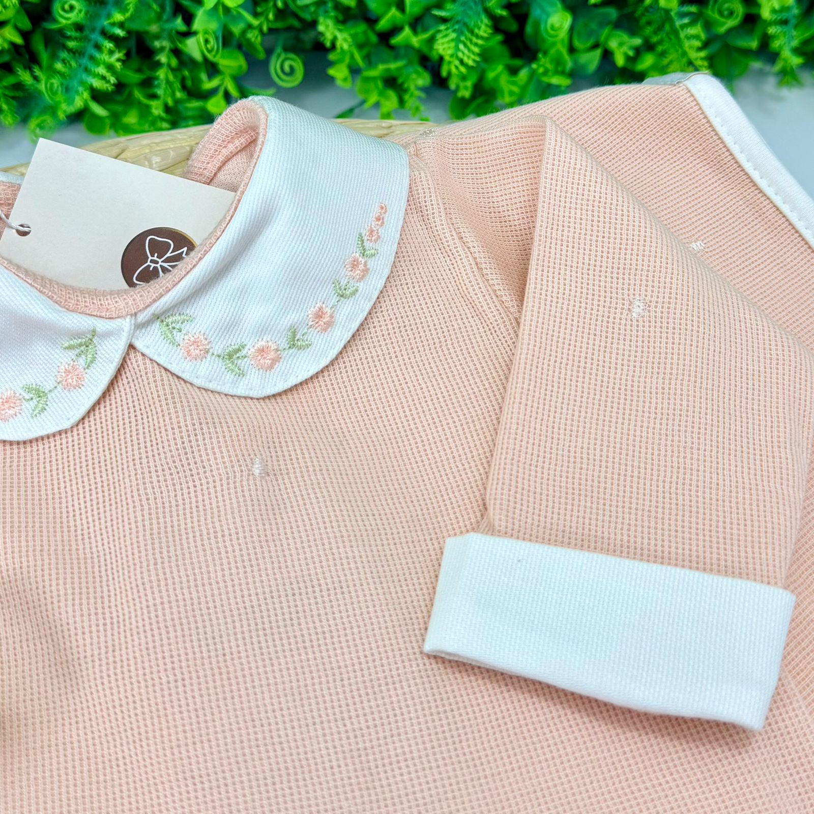 - Saída Maternidade feminina confeccionada em tecido texturizado com pequenos detalhes delicados. Possui gola branca com acabamento bordado floral em tons pastel, punhos brancos dobráveis e fechamento por botões de pressão na parte inferior, facilitando a troca de fraldas. O modelo conta com pezinho fechado, oferecendo mais conforto e proteção ao bebê. A peça acompanha uma mantinha combinando, com o mesmo tecido e acabamento branco nas bordas, ideal para um visual delicado e elegante.