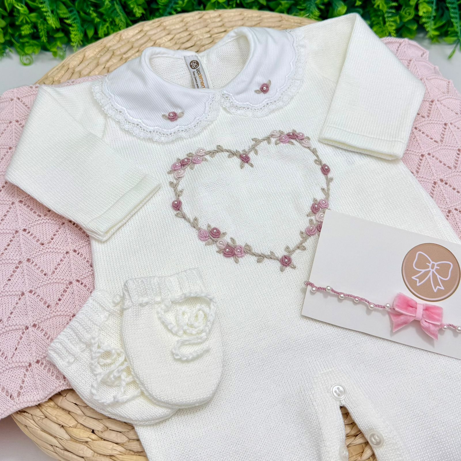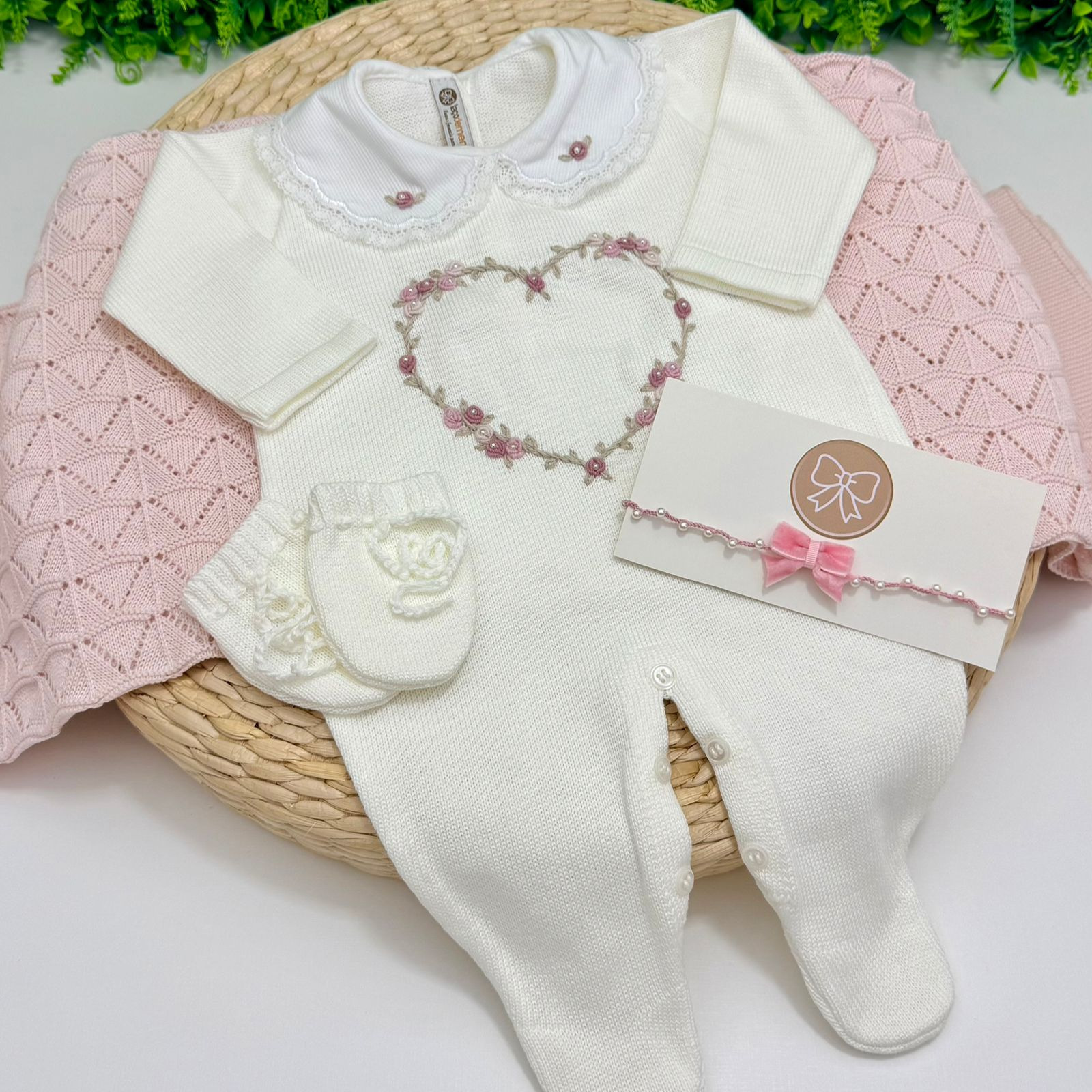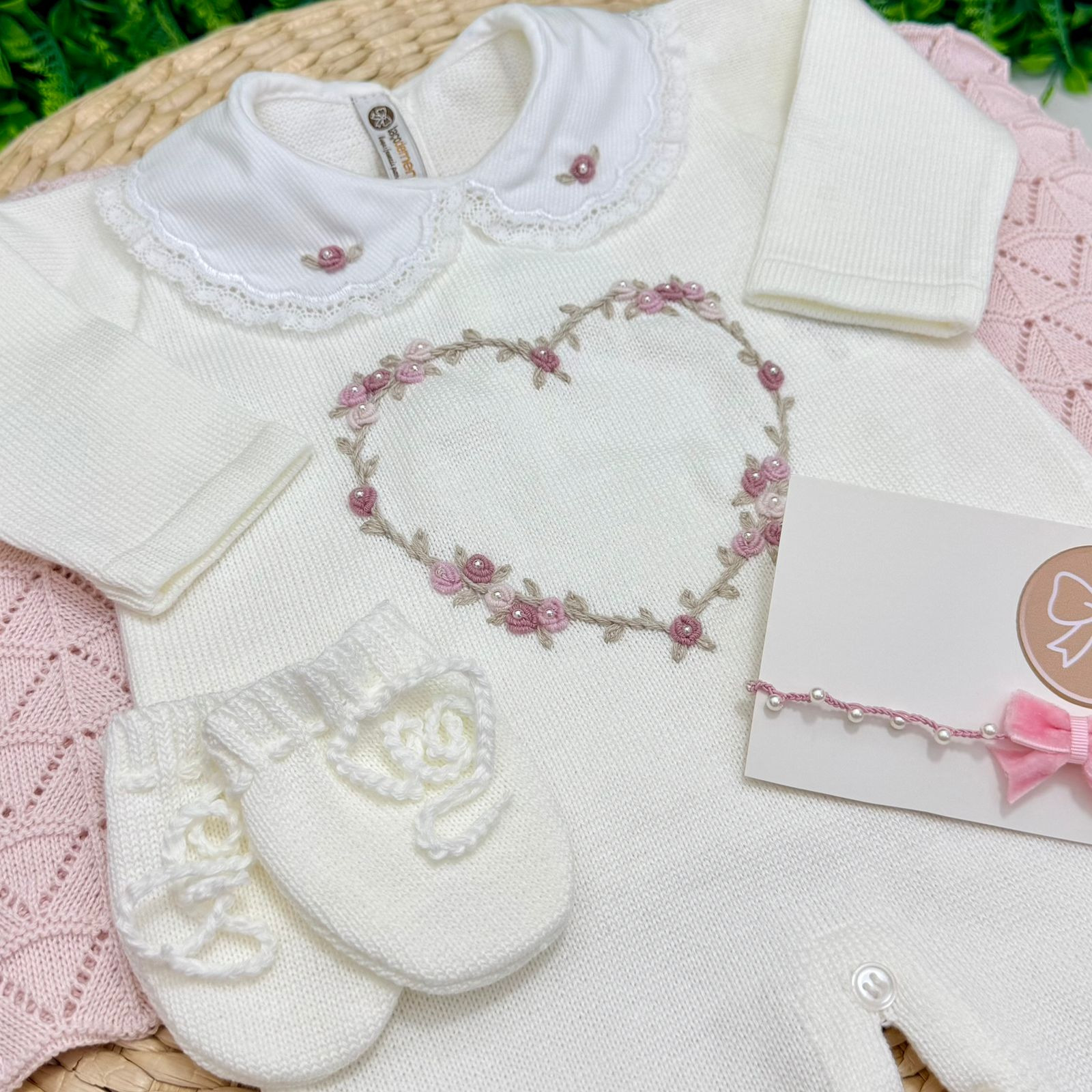 Saída maternidade em tricô, em tom off-white, elegante e delicada. O macacão possui mangas longas, pezinho fechado e fechamento por botões na parte inferior, garantindo conforto e praticidade para os primeiros dias do bebê. A peça traz um lindo bordado artesanal em formato de coração com flores em tons suaves de rosa, que adiciona charme e sofisticação. A gola branca com acabamento em renda e pequenos detalhes florais completa o visual clássico. Manta em tricô rosa claro com textura delicada, formando um conjunto harmonioso e encantador. Ideal para a primeira saída da maternidade, ensaios fotográficos e momentos especiais.