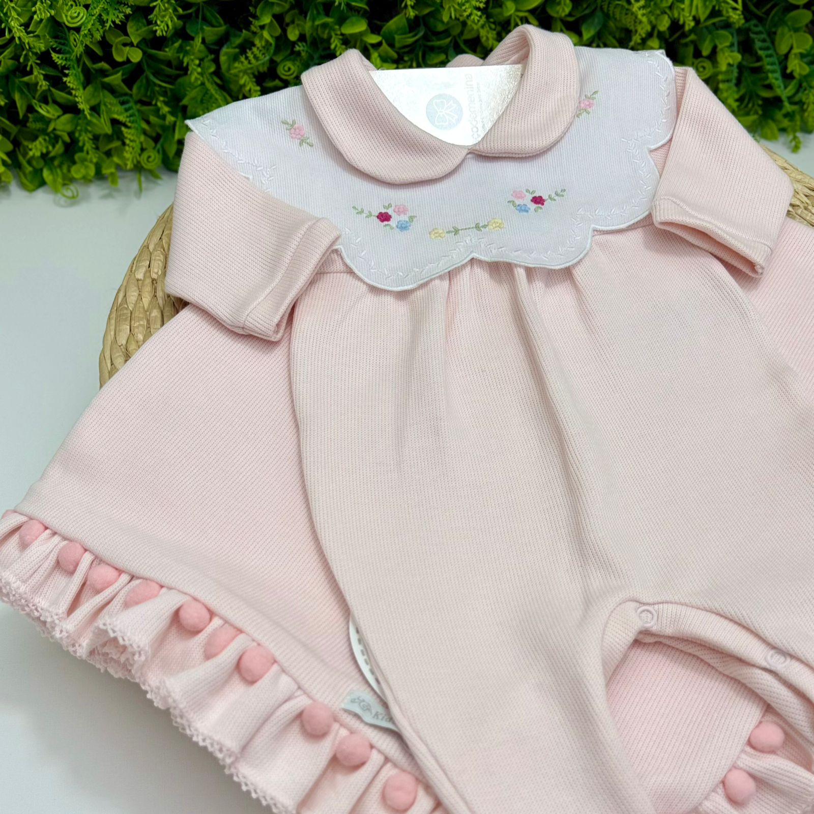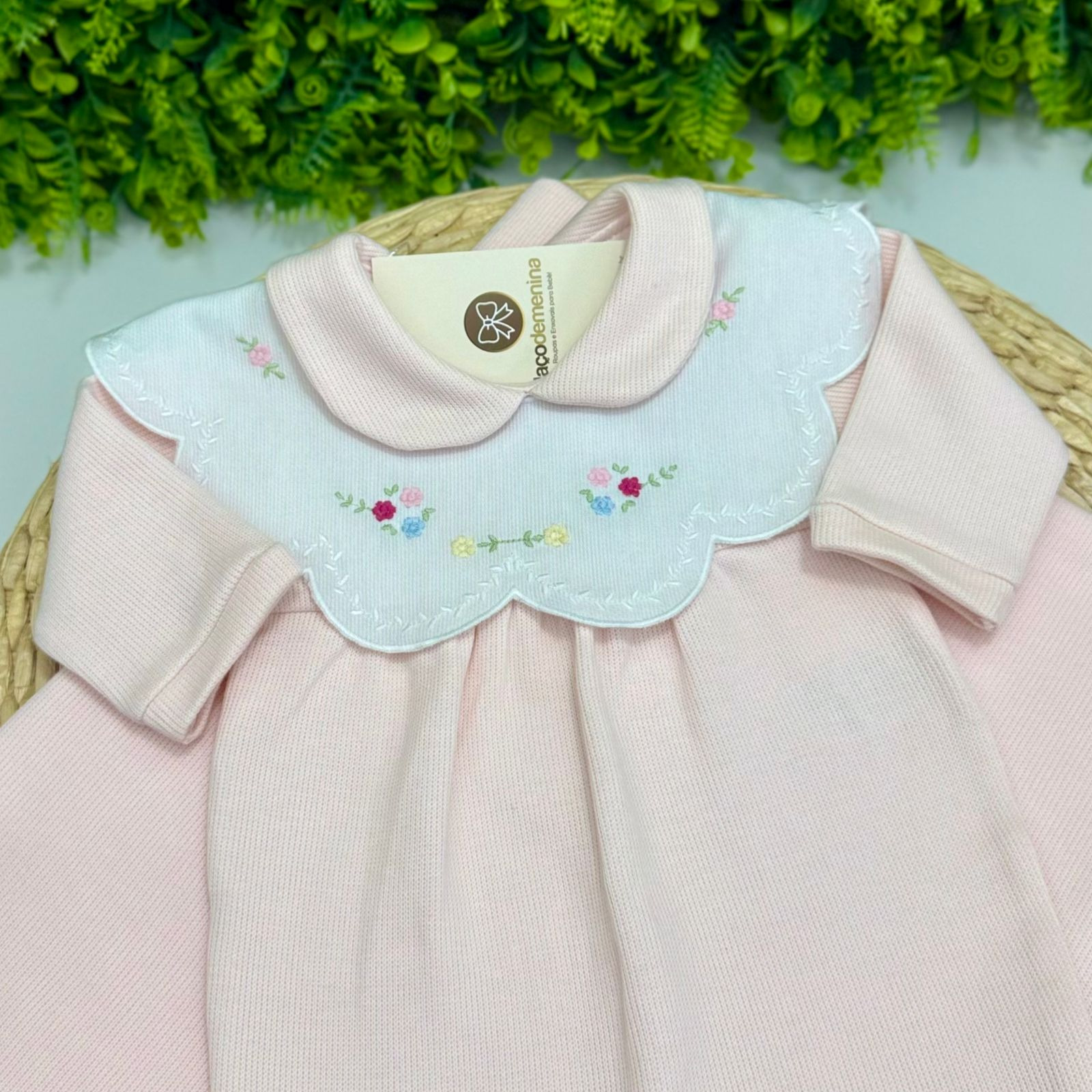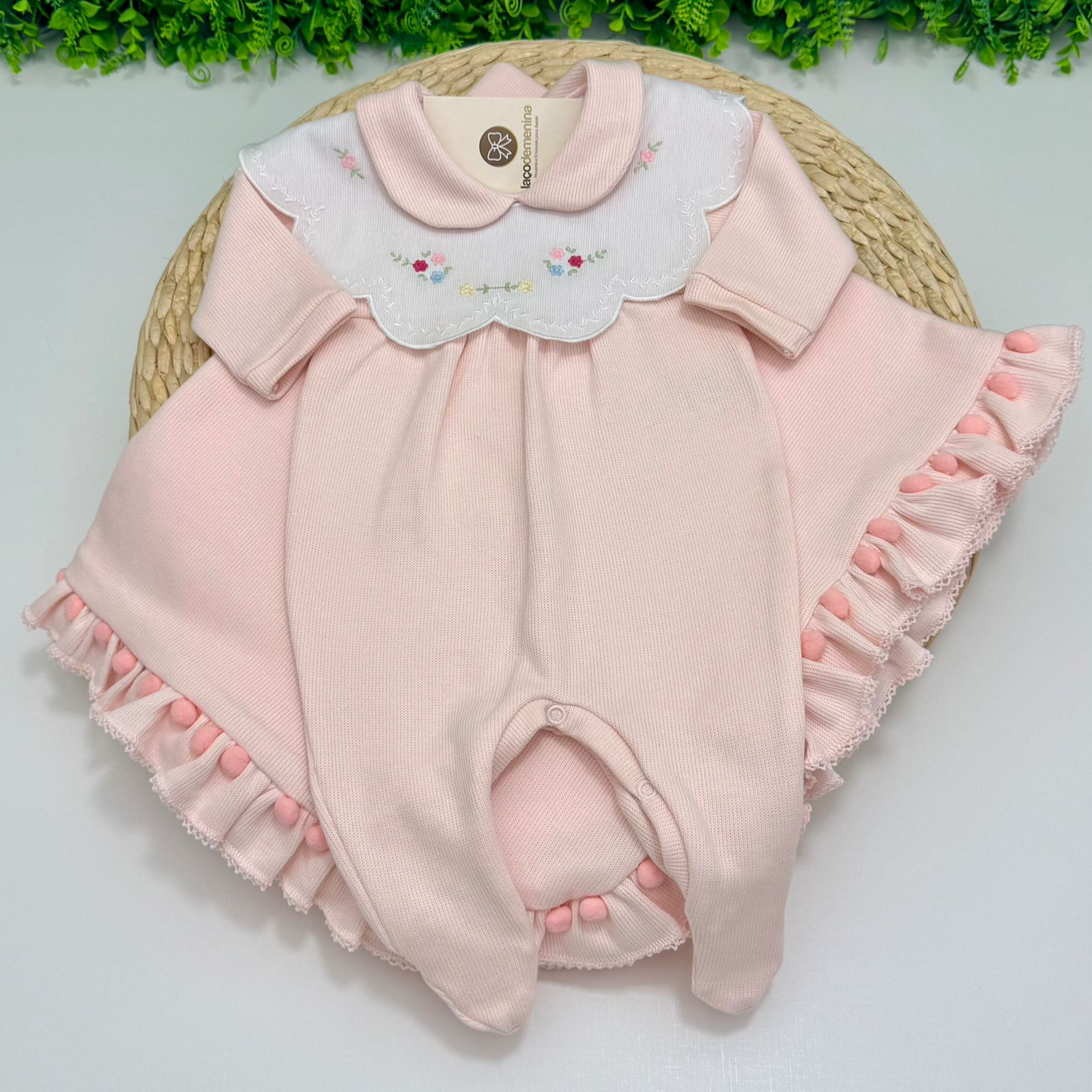 O macacão em tom rosa suave apresenta um design encantador, a gola arredondada complementa o visual com elegância, enquanto a abertura inferior com botões garante praticidade na troca de fraldas. A manta acompanha o conjunto no mesmo padrão de cor e acabamento, proporcionando aconchego, proteção térmica e muito charme para a saída da maternidade e os primeiros passeios.