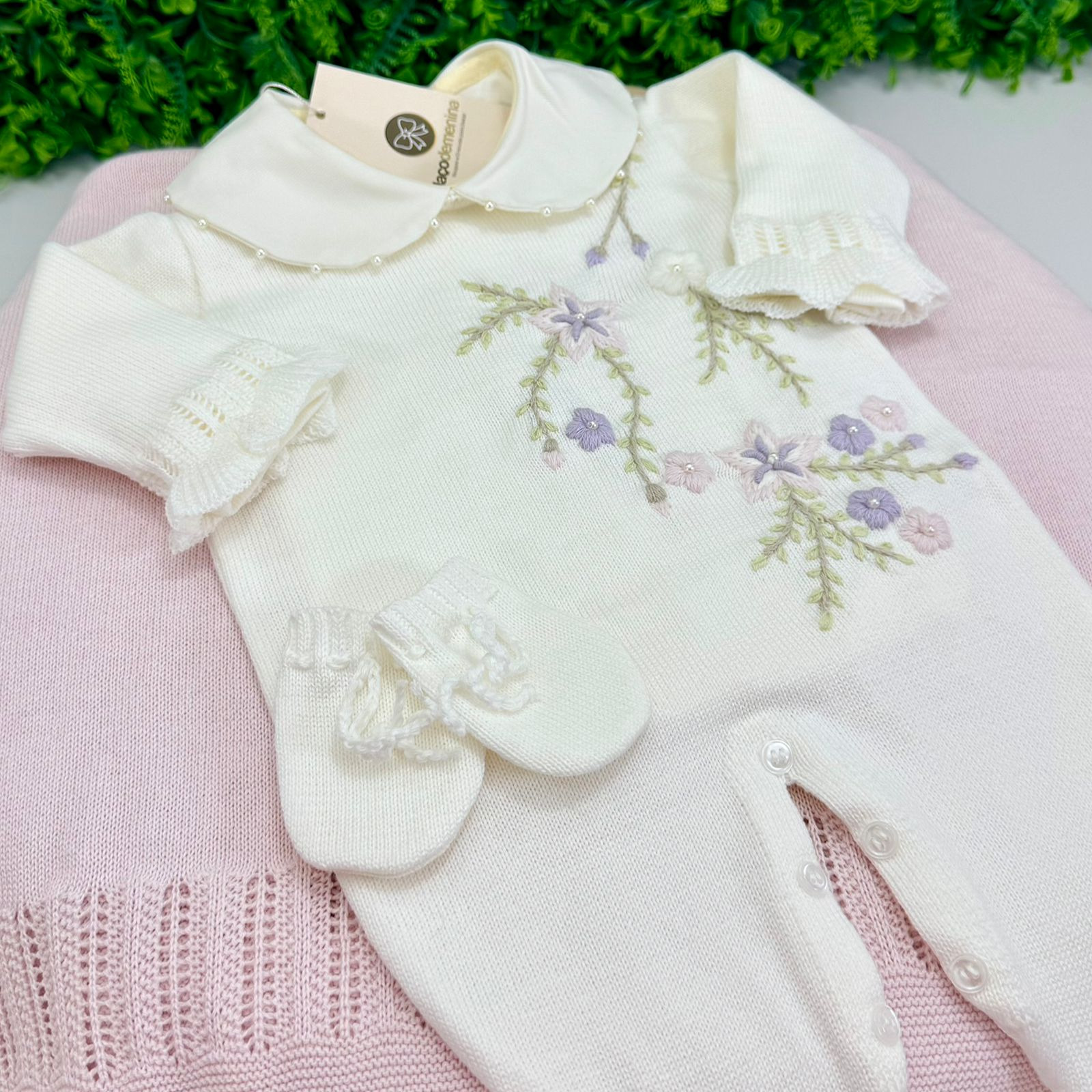 O macacão possui delicados bordados florais em tons suaves, gola charmosa e acabamento impecável, proporcionando um visual clássico e sofisticado. Confeccionado em tricô macio, oferece conforto térmico e toque suave para a pele sensível do bebê.