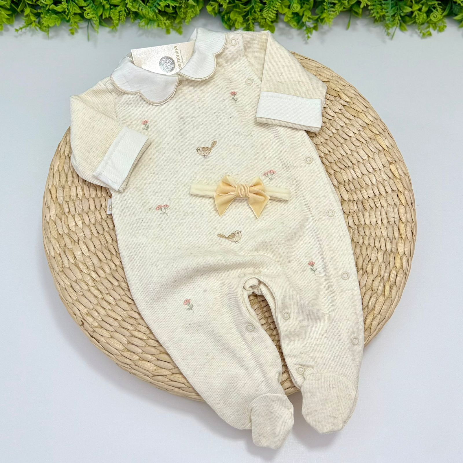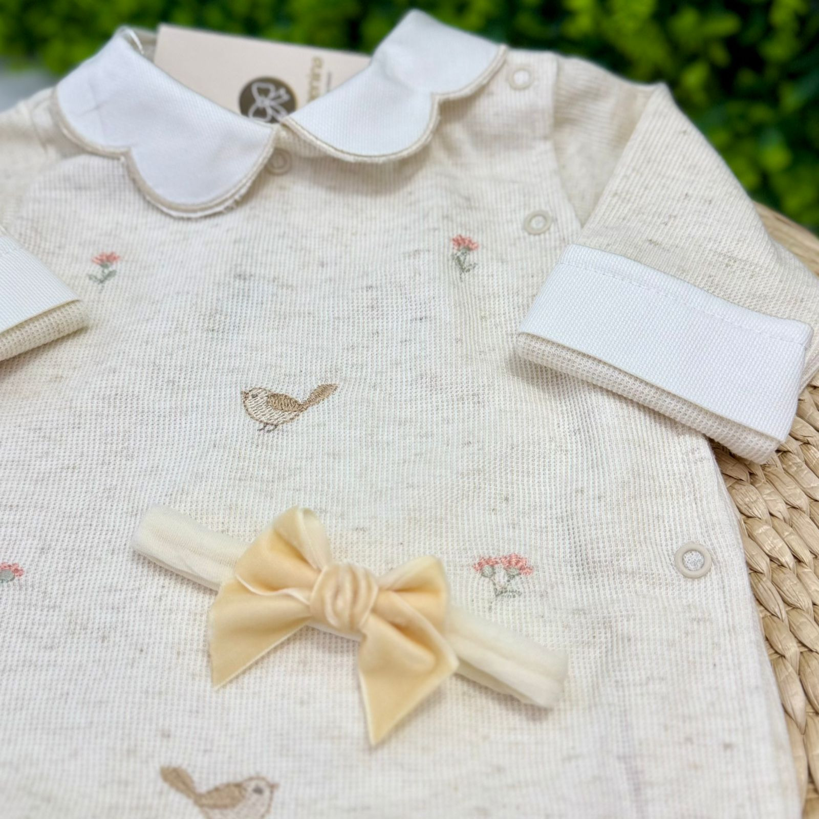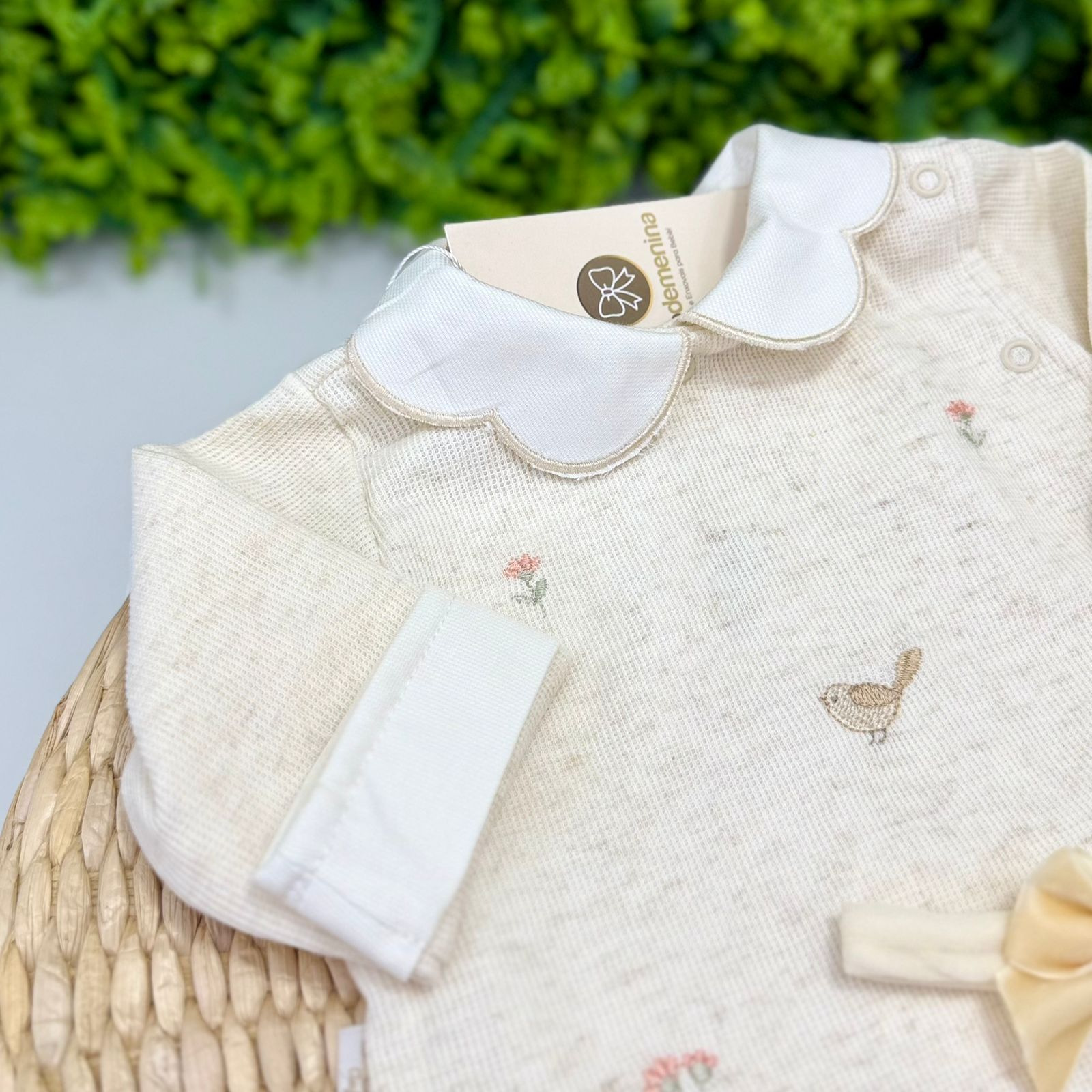 Nossa saída de maternidade feminina foi criada com muito amor para acolher sua princesinha com conforto e delicadeza. O macacão com pezinho fechado traz bordados encantadores de passarinhos e florzinhas, que simbolizam leveza, ternura e novos começos.
