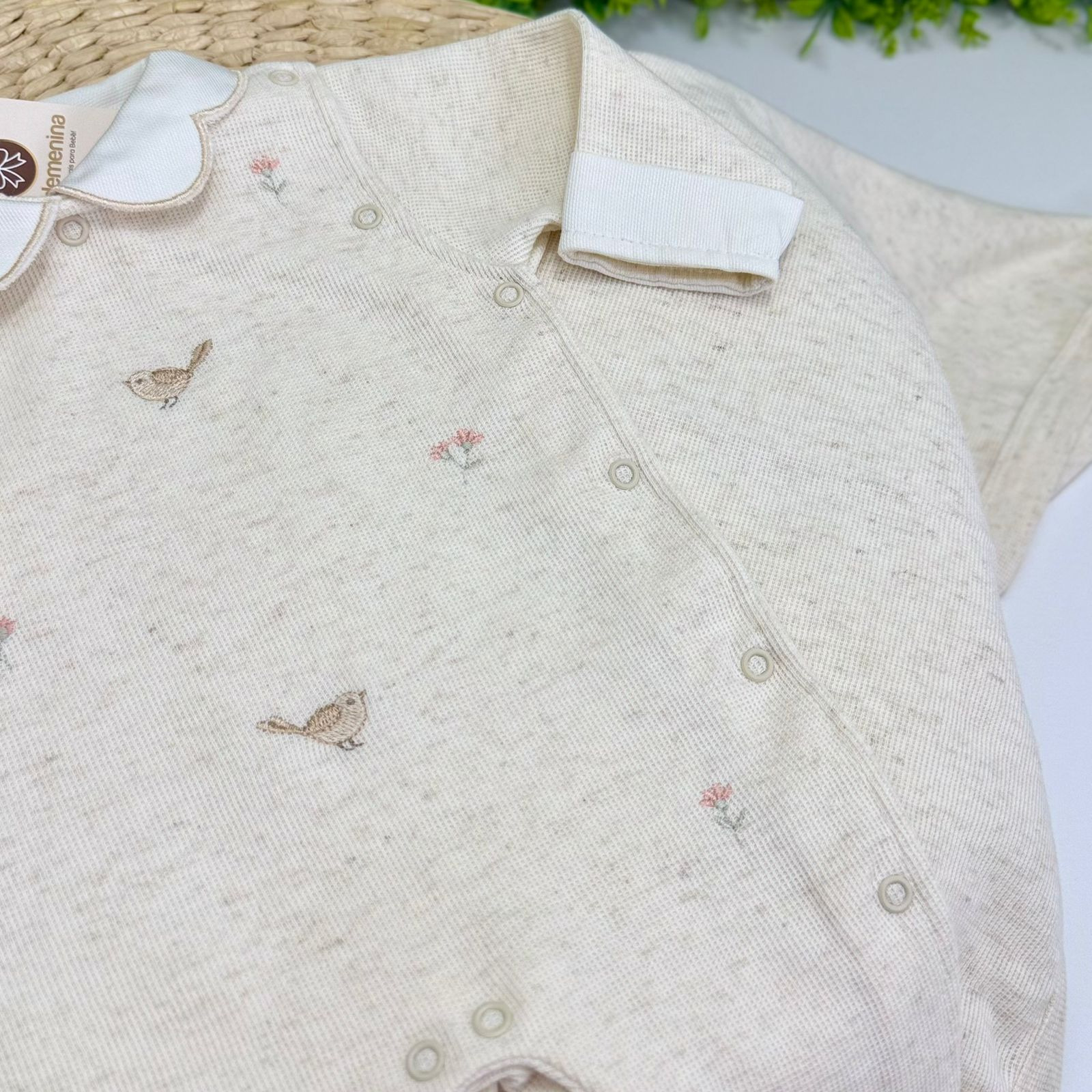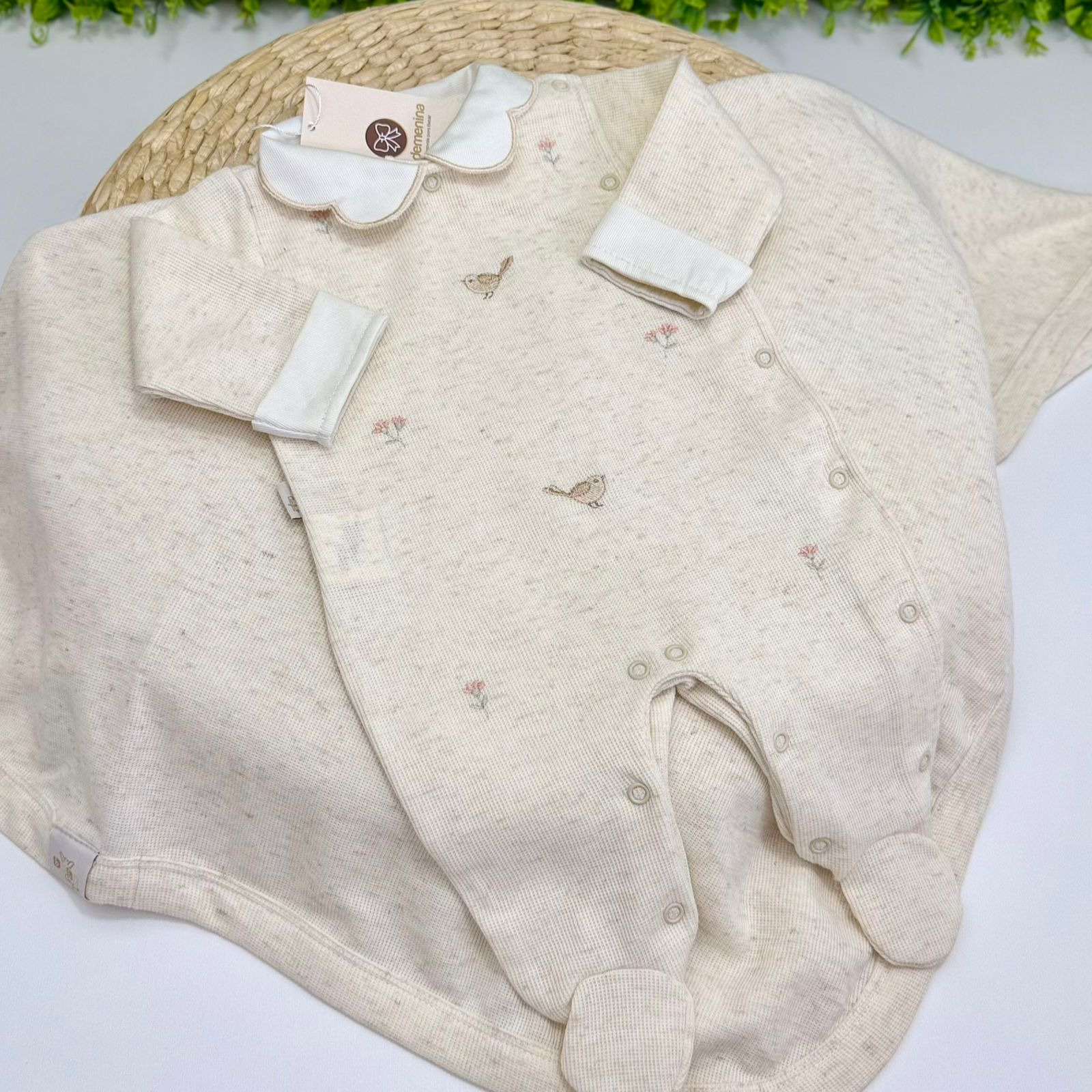 Nossa saída de maternidade feminina foi criada com muito amor para acolher sua princesinha com conforto e delicadeza. O macacão com pezinho fechado traz bordados encantadores de passarinhos e florzinhas, que simbolizam leveza, ternura e novos começos.