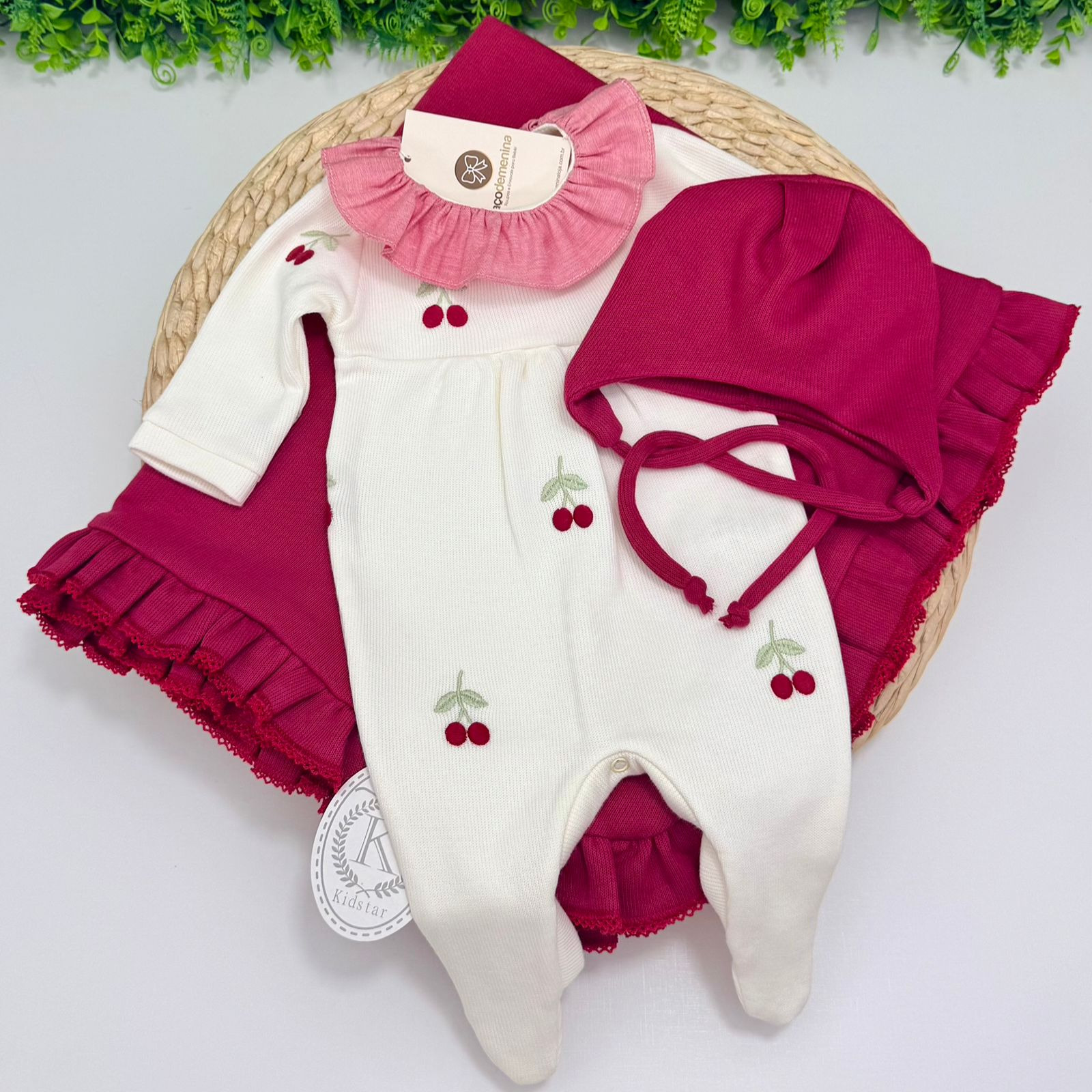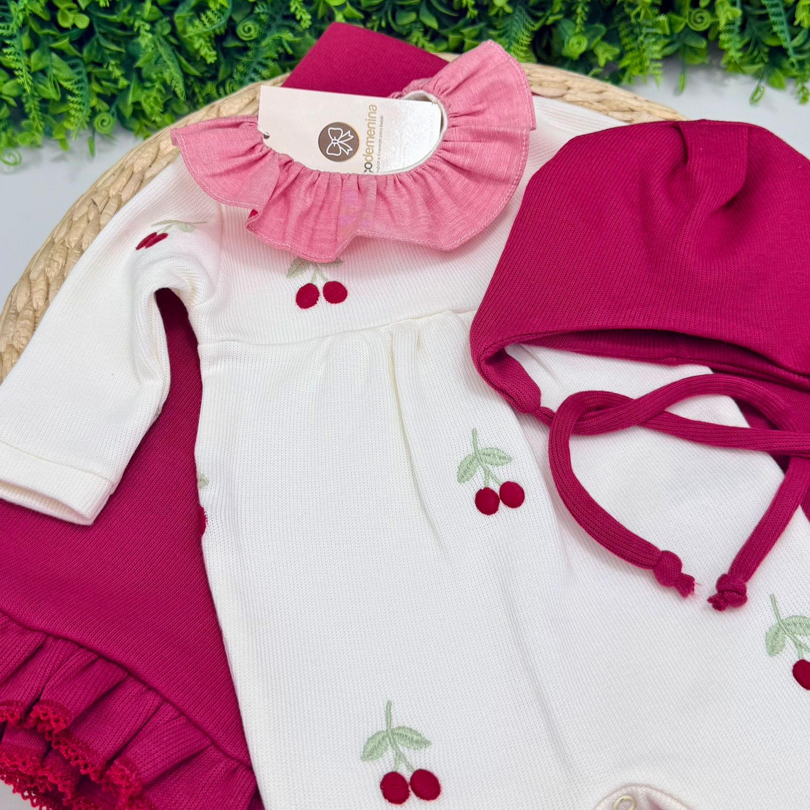 Delicada e cheia de charme, este conjunto infantil é perfeito para os primeiros momentos do bebê. O macacão é confeccionado em tecido macio e confortável, com bordados delicados de cerejinhas, que trazem um toque lúdico e sofisticado à peça. Possui gola com babado em tom contrastante e fechamento prático entre as pernas, facilitando a troca.