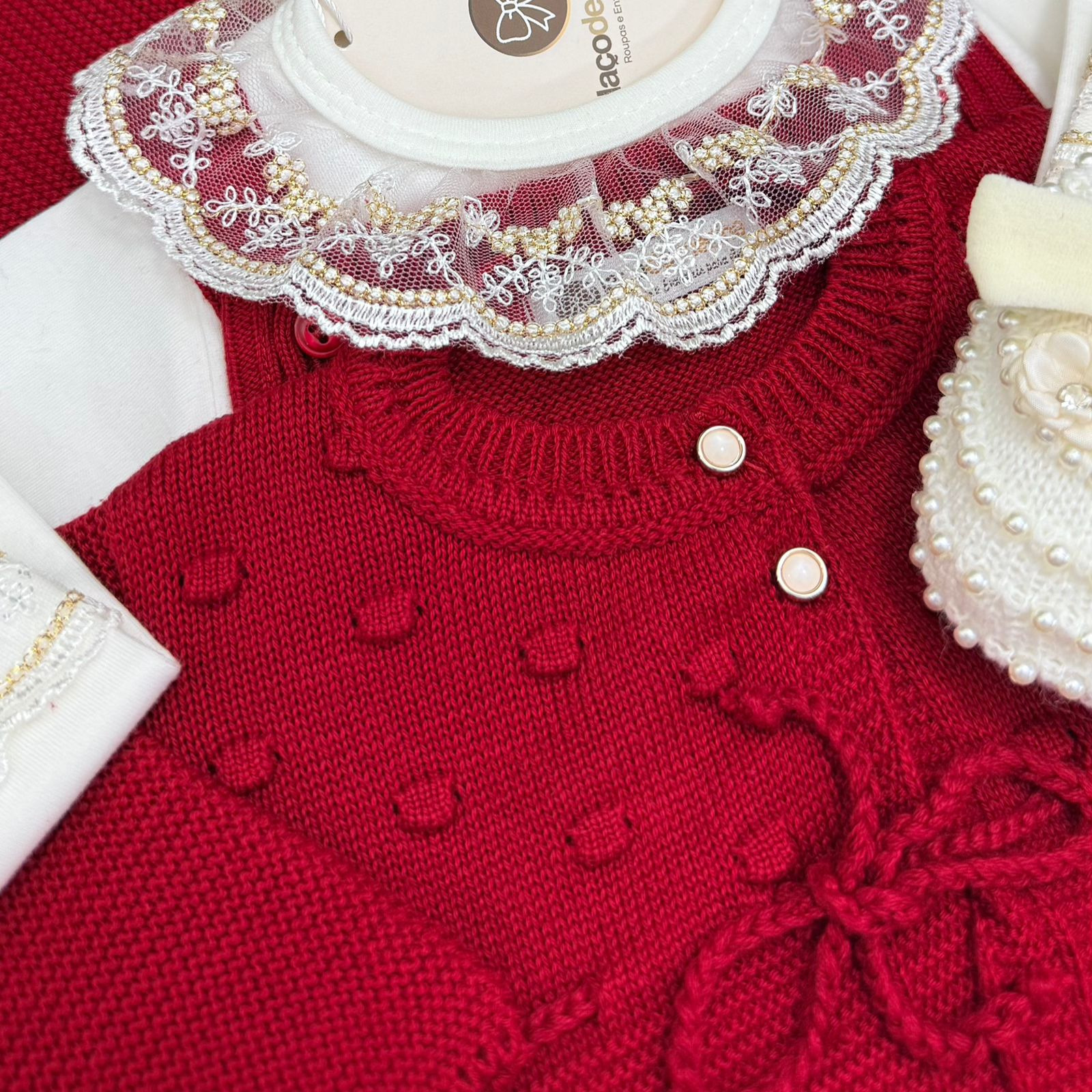 Delicada saída maternidade feminina confeccionada em tricô macio e aconchegante, ideal para os primeiros dias da bebê. O conjunto é composto por macacão, casaquinho e manta, todos em tom vermelho, trazendo elegância e conforto em cada detalhe.