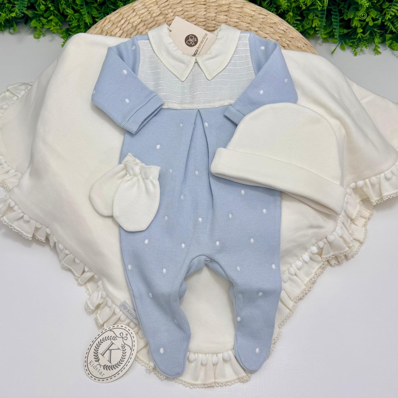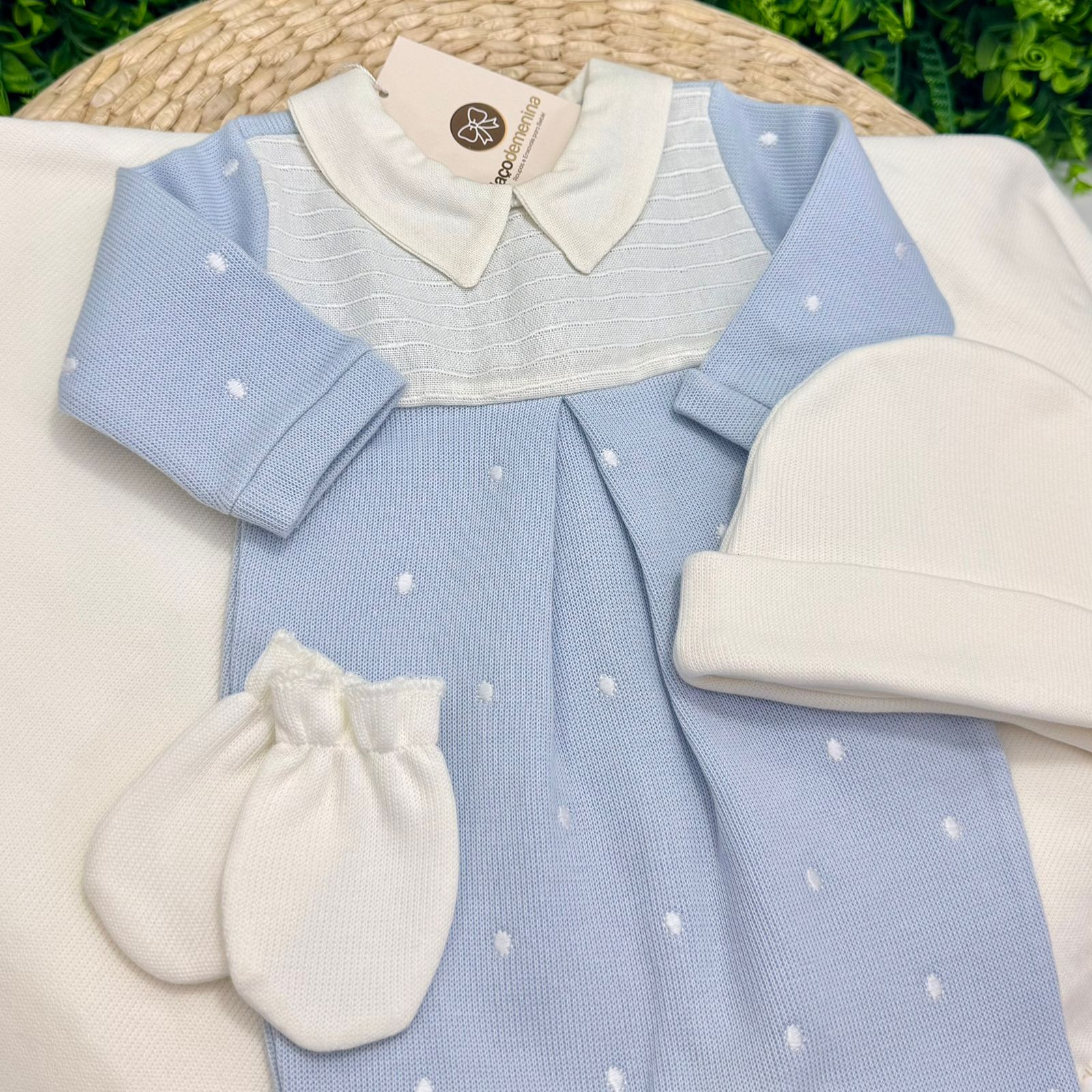 Um conjunto encantador, pensado em cada detalhe para o momento mais especial. Confeccionada em tricot macio, com toque suave e confortável para a pele delicada do bebê.