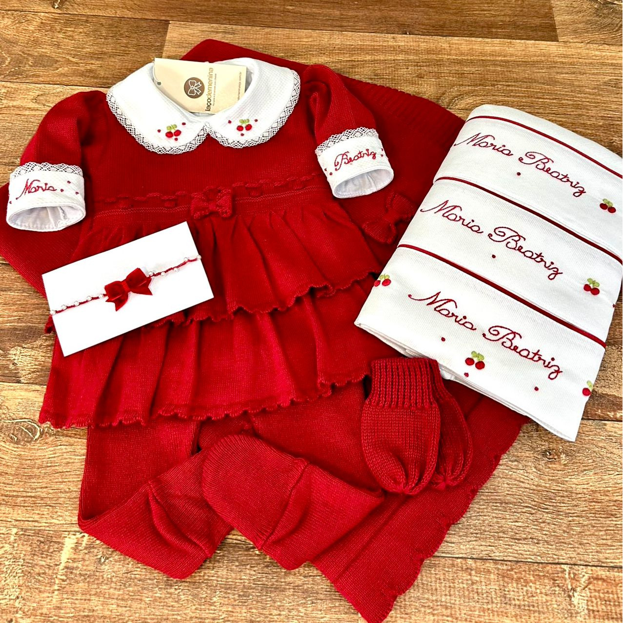 Acompanha calça em tricô com pezinho, garantindo conforto e proteção nos primeiros dias de vida, além de manta coordenada com bordados que harmonizam perfeitamente com o vestido, tornando o conjunto ainda mais especial.