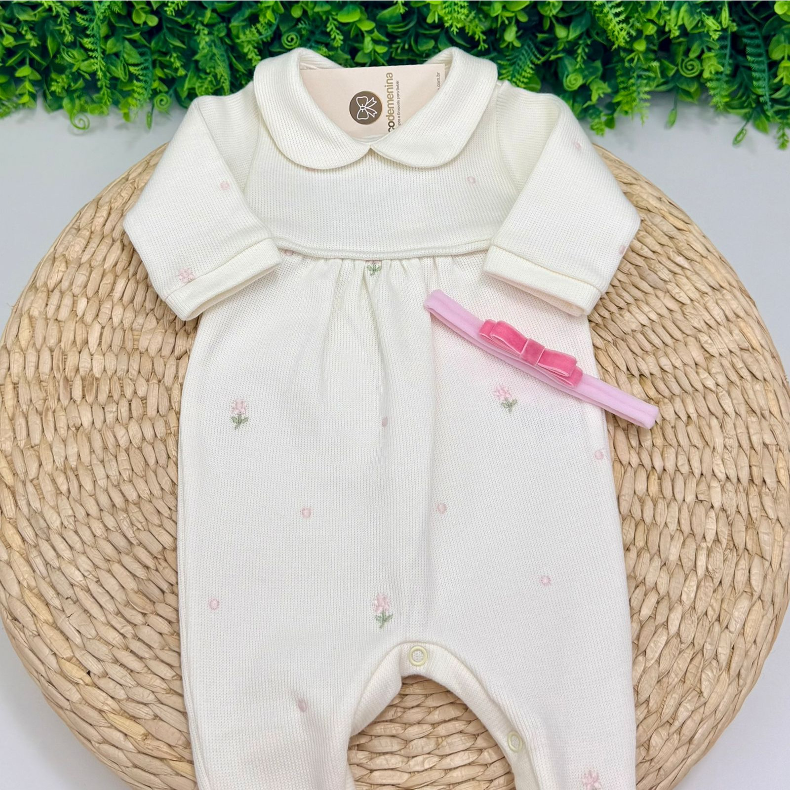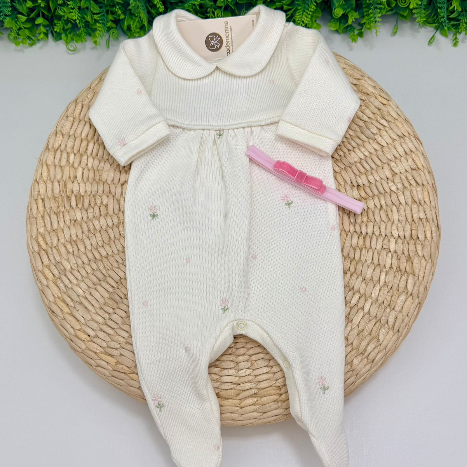 O macacão em tom claro recebe pequenos bordados florais sutis, quase como um sussurro de detalhes, criando um visual limpo e extremamente elegante. A gola arredondada traz um ar clássico e acolhedor, enquanto o fechamento inferior facilita a rotina sem interferir na estética da peça.