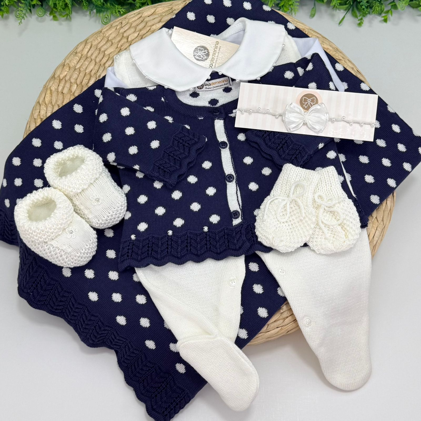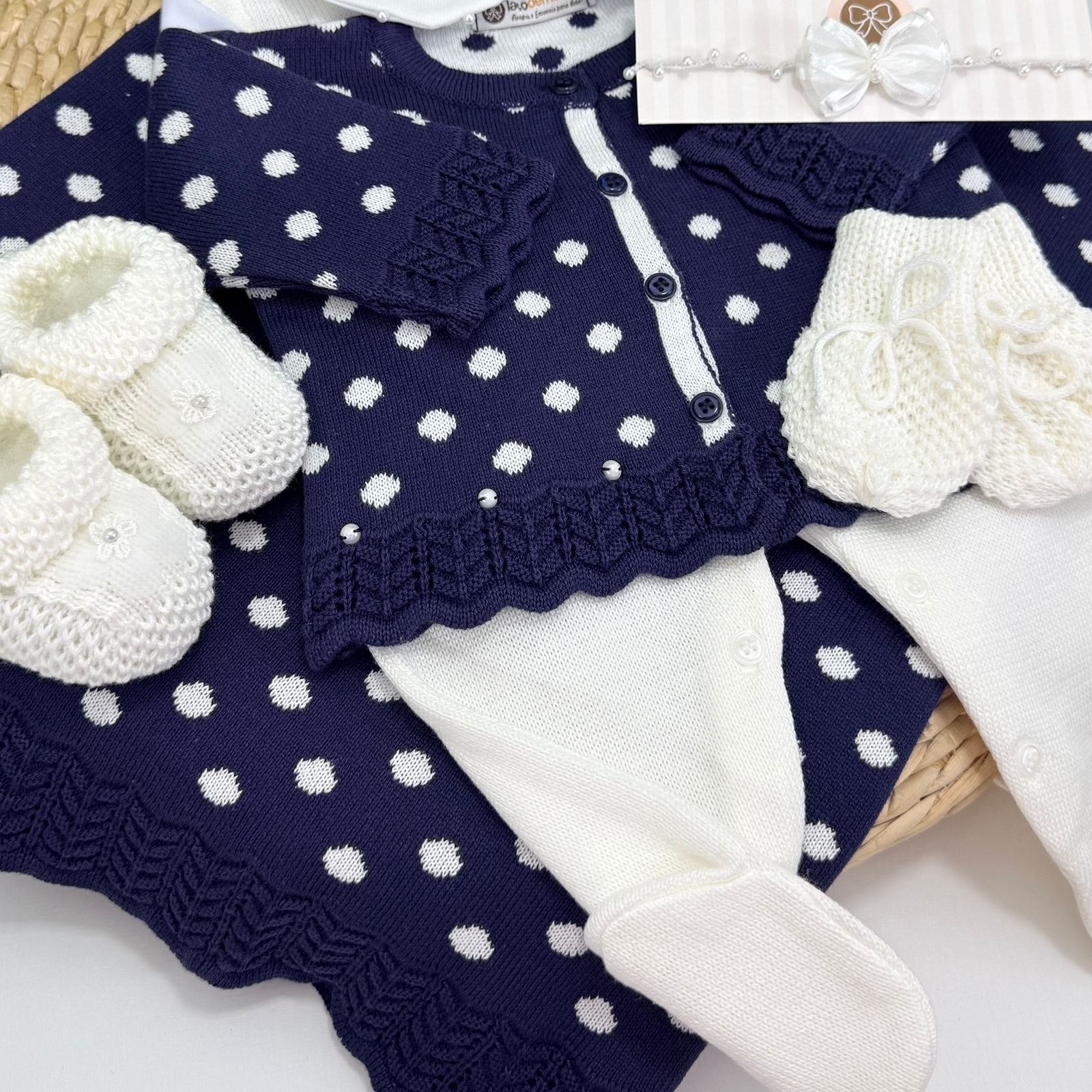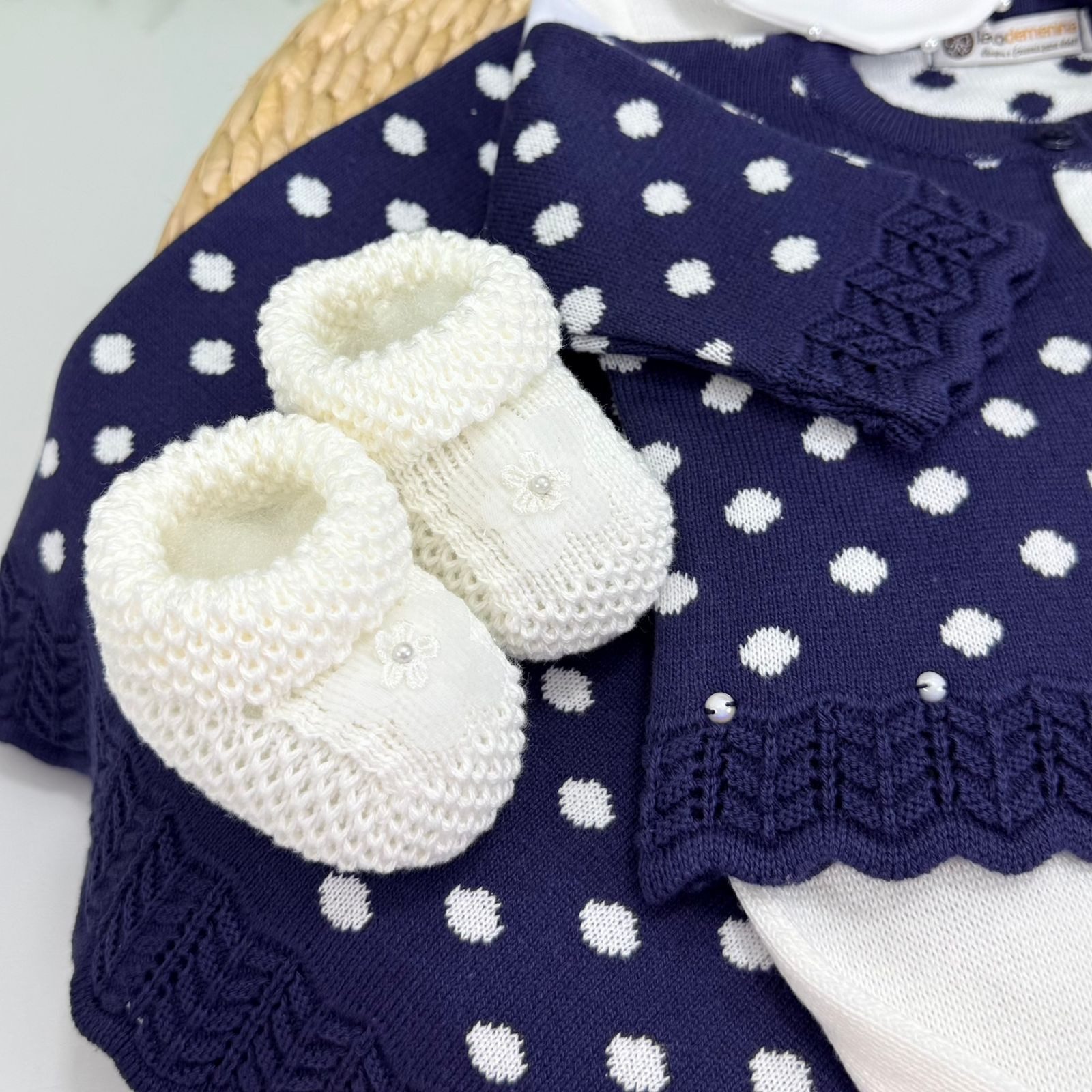 Saída maternidade confeccionada em tricot de alta qualidade, perfeita para os primeiros dias do bebê. O conjunto traz um delicado contraste entre o azul-marinho e o branco, com estampa de poá que transmite charme e sofisticação. O casaquinho possui acabamento refinado, botões frontais e detalhes trabalhados no tricot, garantindo conforto e elegância.