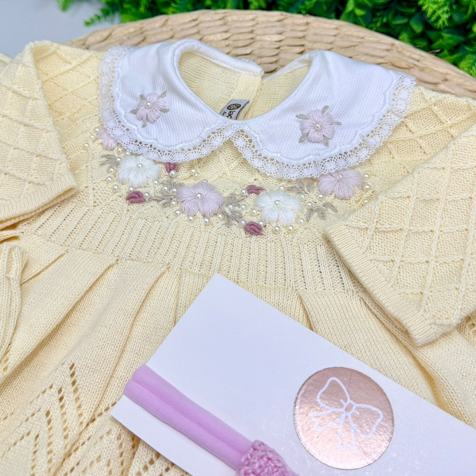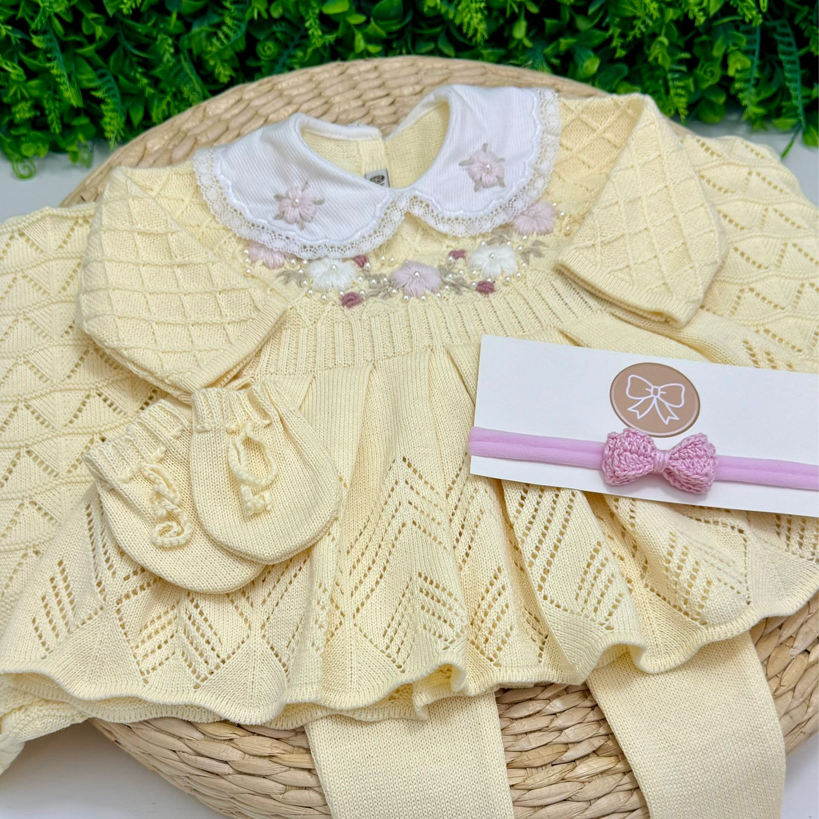 Delicado, aconchegante e cheio de charme, este conjunto foi pensado para marcar o primeiro look do bebê com muito amor. Confeccionado em tricô antialérgico (50% algodão, 50% acrílico), proporciona toque macio, conforto térmico e total segurança para a pele sensível do recém-nascido.