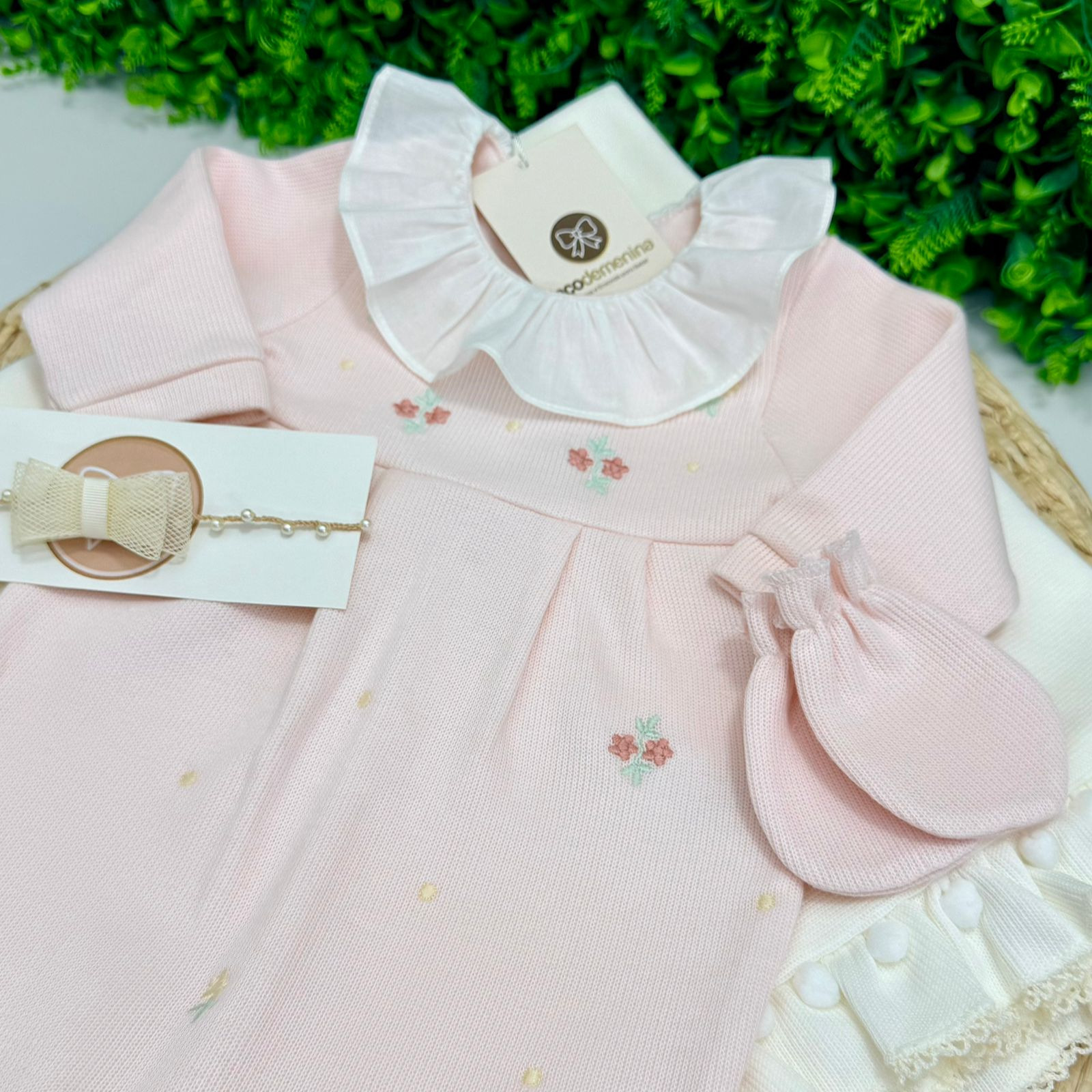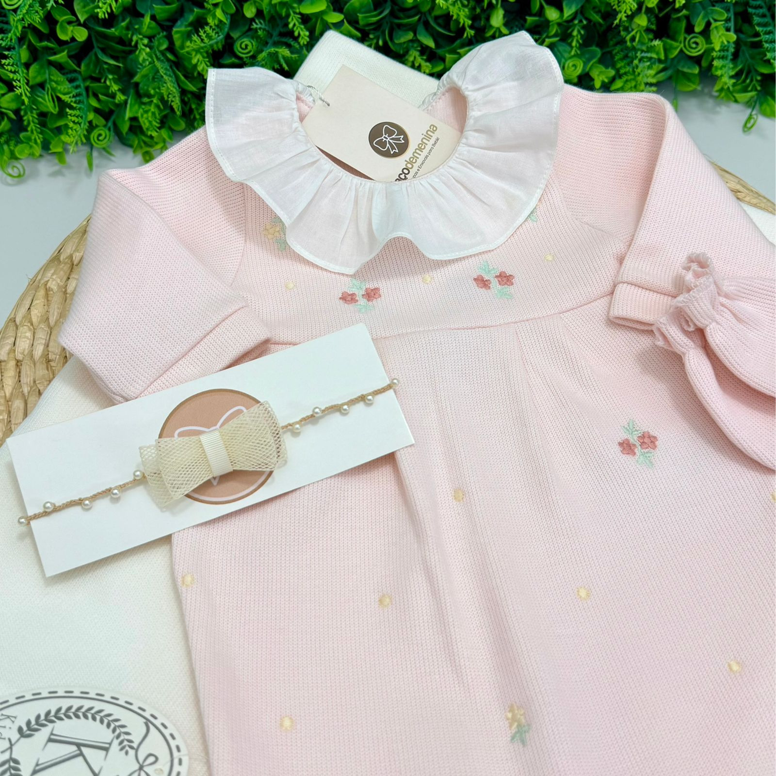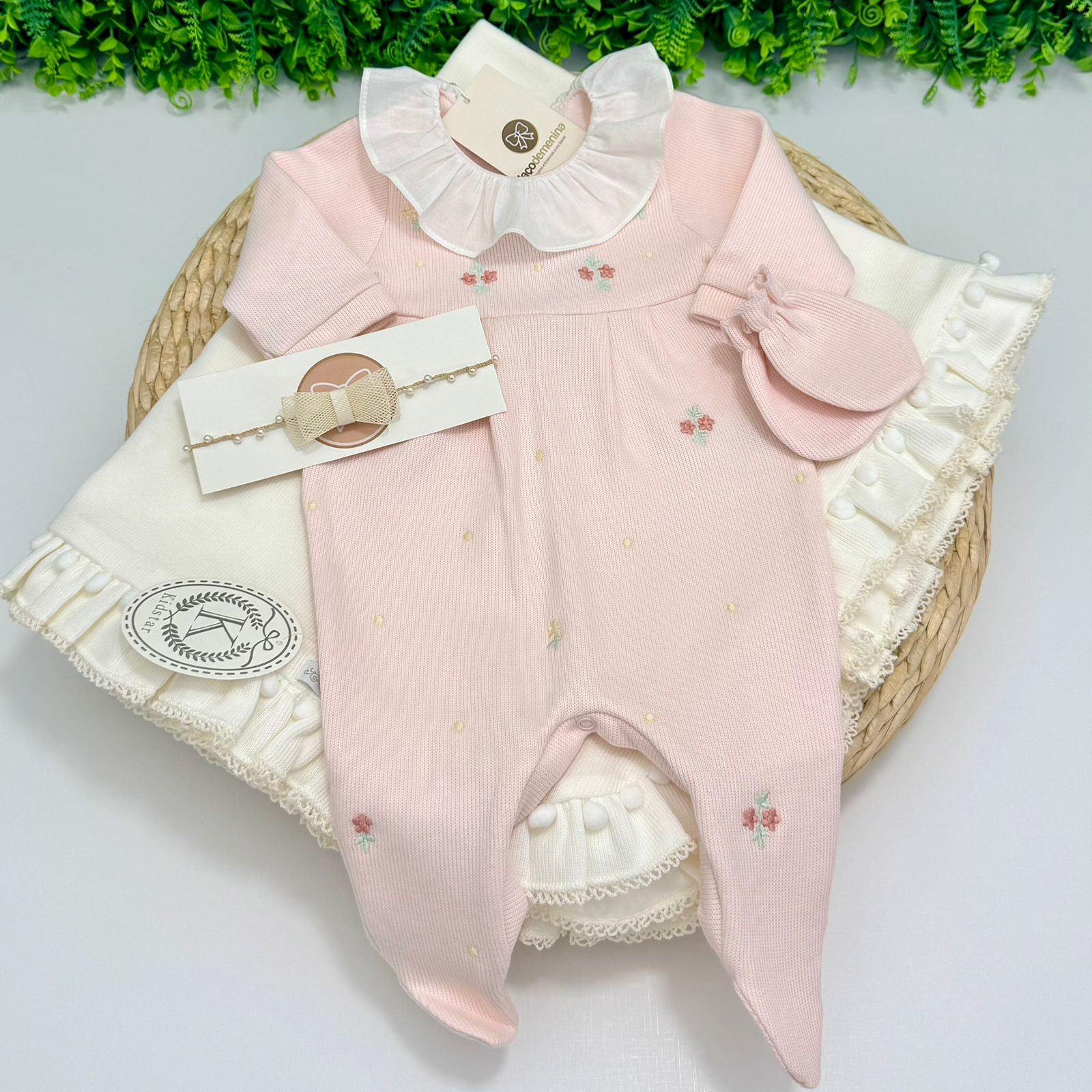O macacão possui gola branca com babadinhos, que adiciona um toque refinado ao visual, além de pés fechados para manter a bebê aquecida e aconchegada. O conjunto acompanha manta coordenada, finalizada com pompons delicados, garantindo um look completo e harmonioso para a saída da maternidade ou ocasiões especiais.