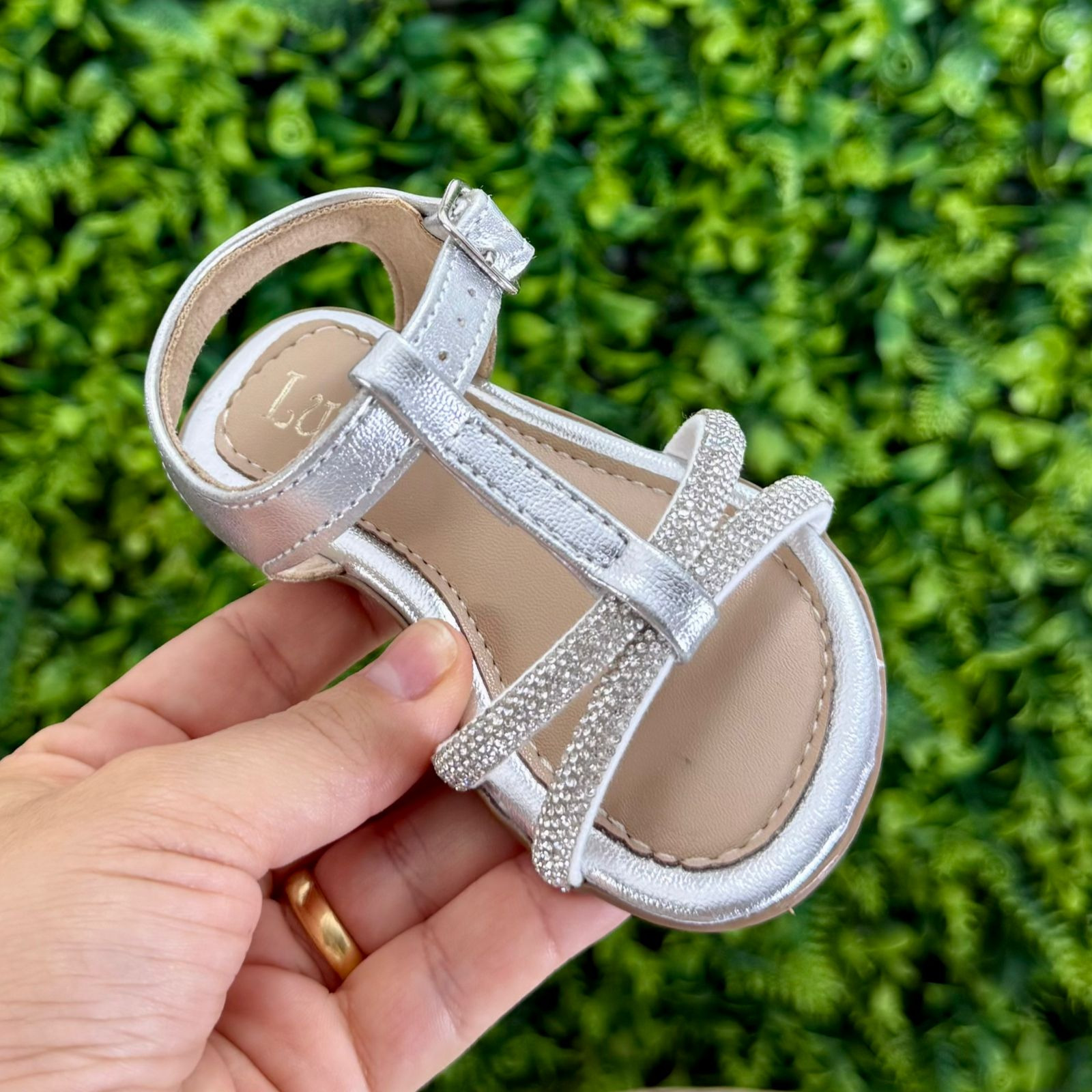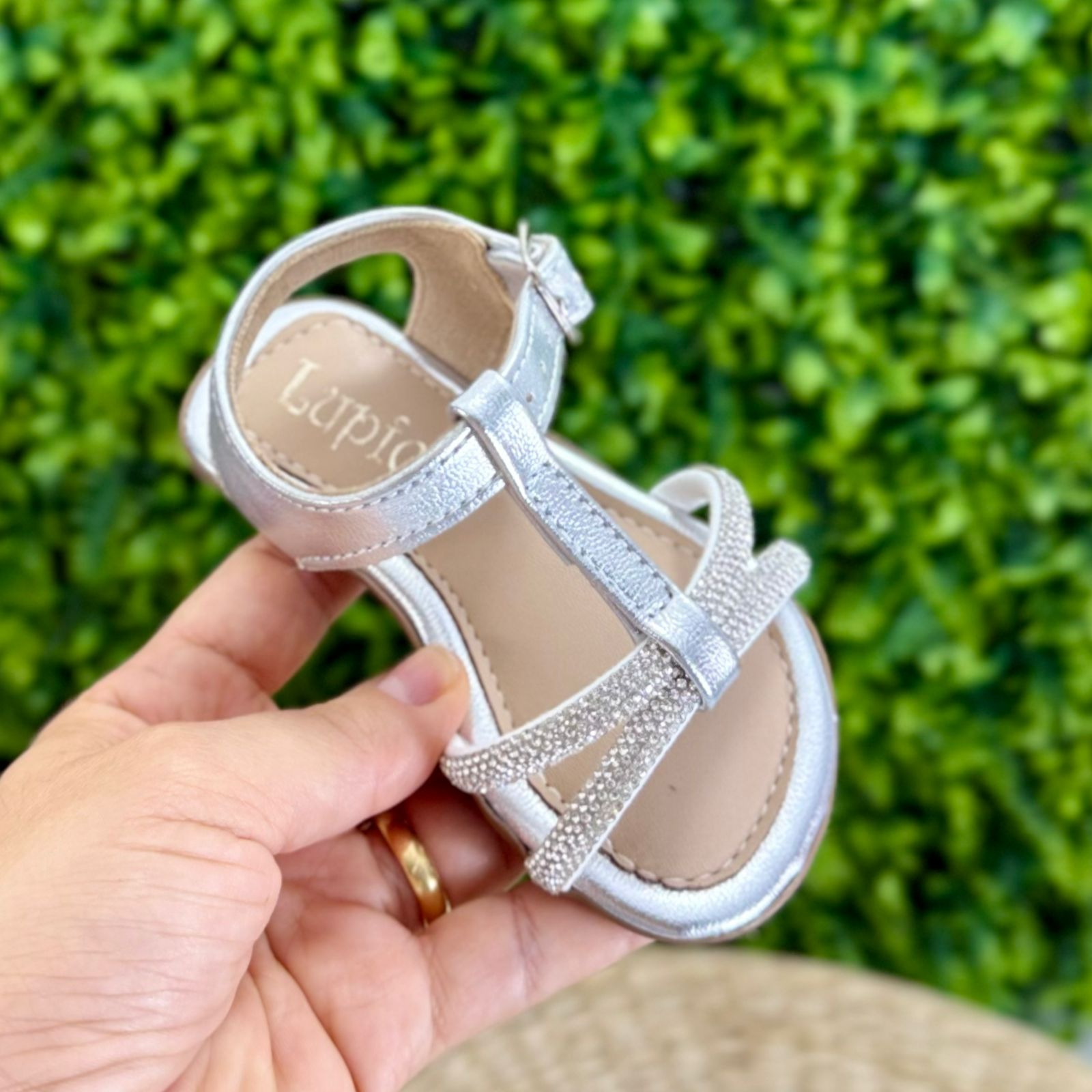 Sandália infantil Lupie® prateada, com aplicação de strass, possui o fechamento com fivela e solado antiderrapante. Seu interior macio oferece conforto onde os pés pisam, garantindo estilo e segurança.