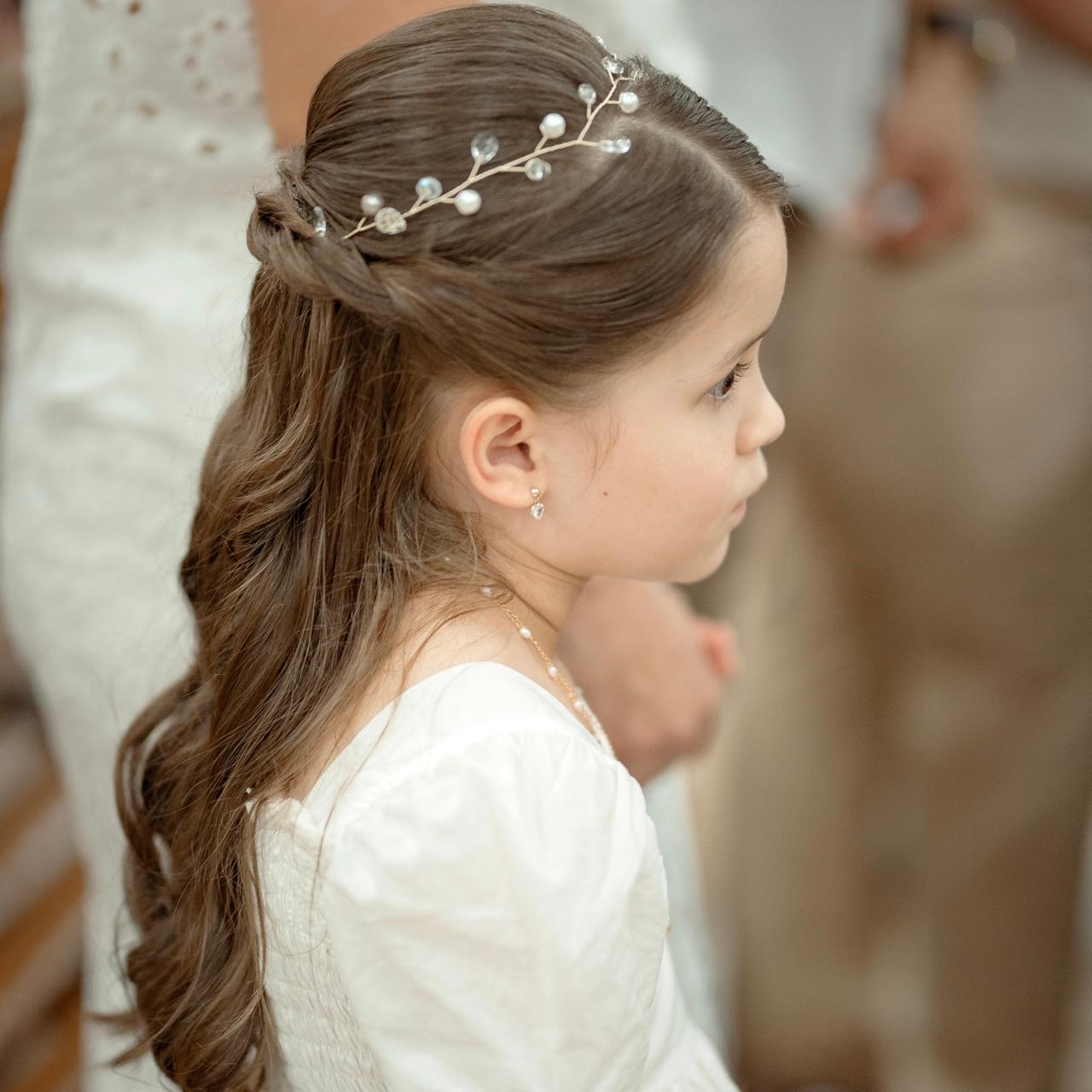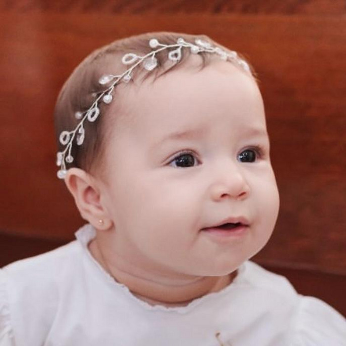 Tiara aramada confeccionada com pérolas e cristais com regulador para ajustar na cabeça da bebê.