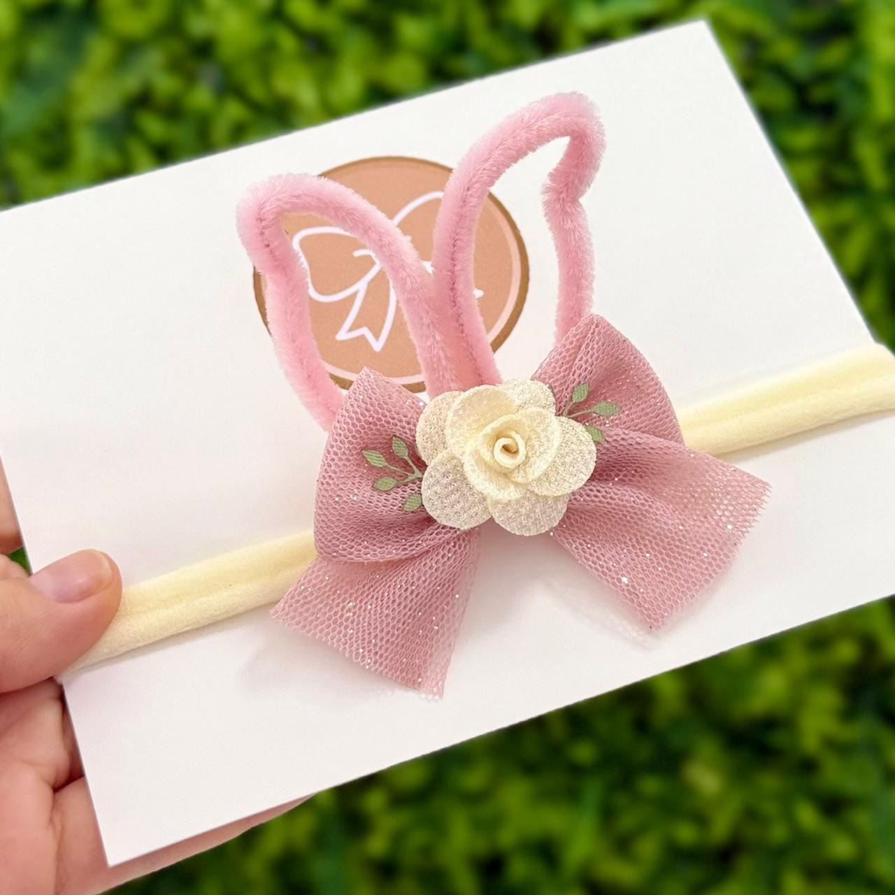- Charmosa e delicada, com orelhinhas macias e laço em tule com flor off-white. Perfeita para deixar qualquer look ainda mais encantador.
