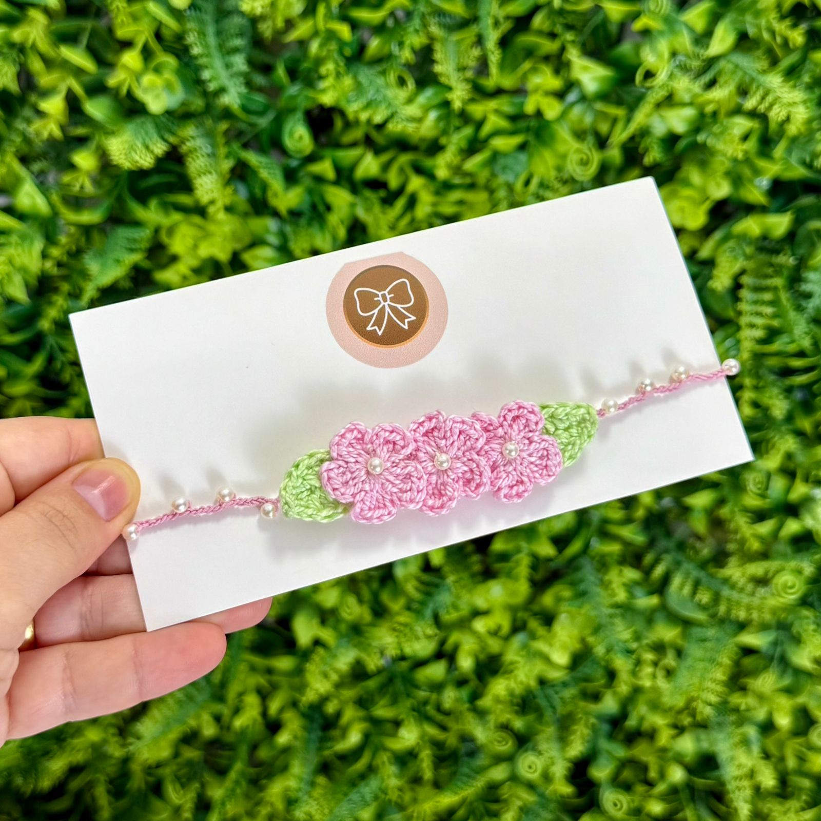 - Tiara feita em linha de elastex trançada com aplicação em pérolas e aplicação com três florzinhas confeccionadas em tricô.