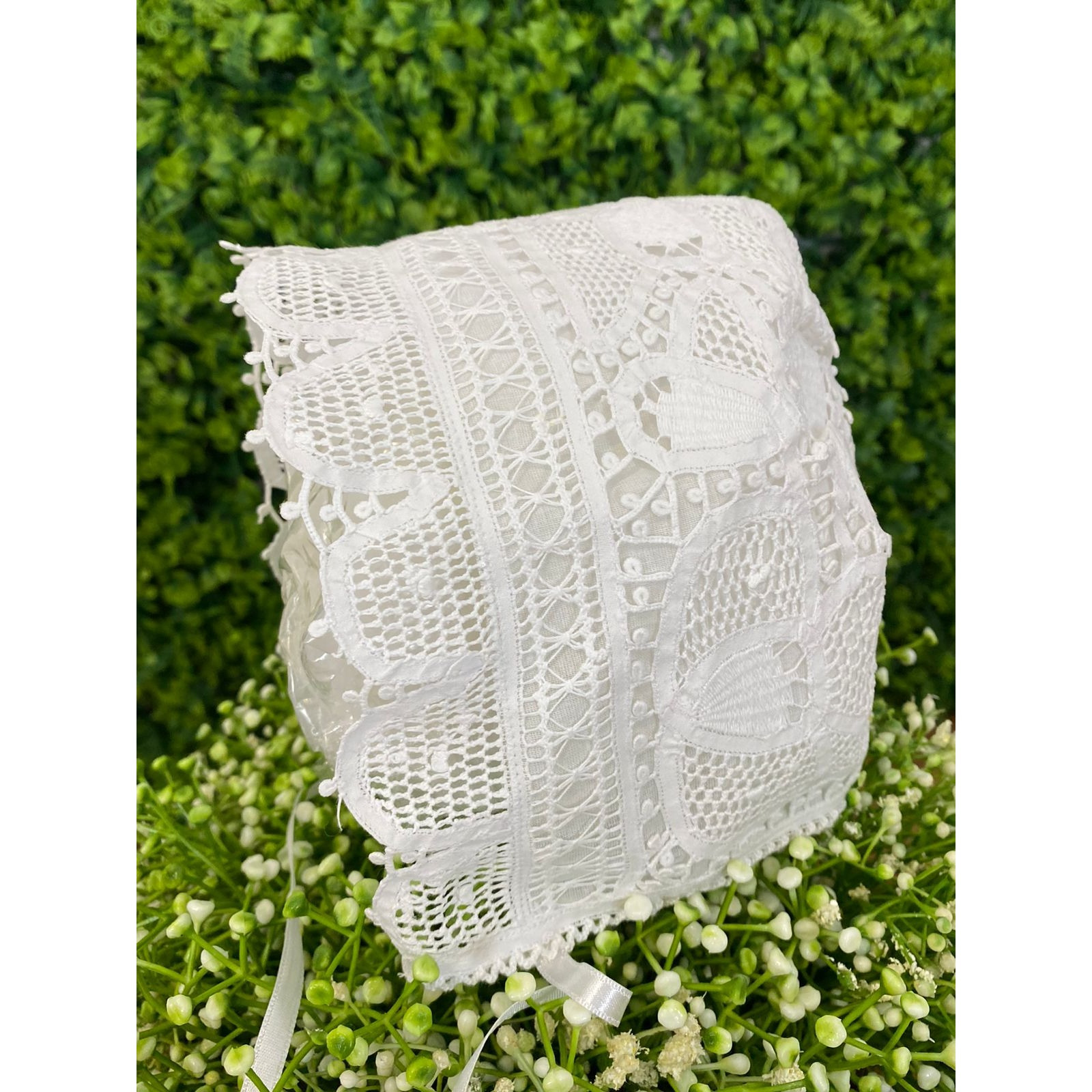 • Touca confeccionada e detalhada inteiramente em renda renascença bordada manualmente, contendo fita de cetim para amarração.