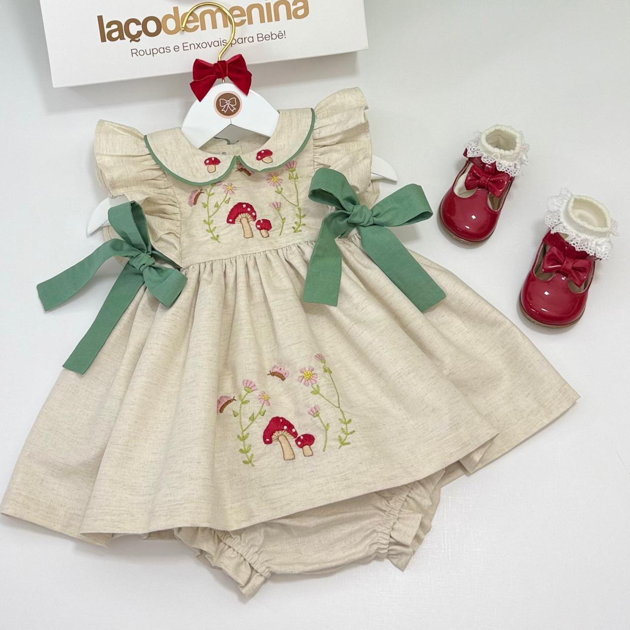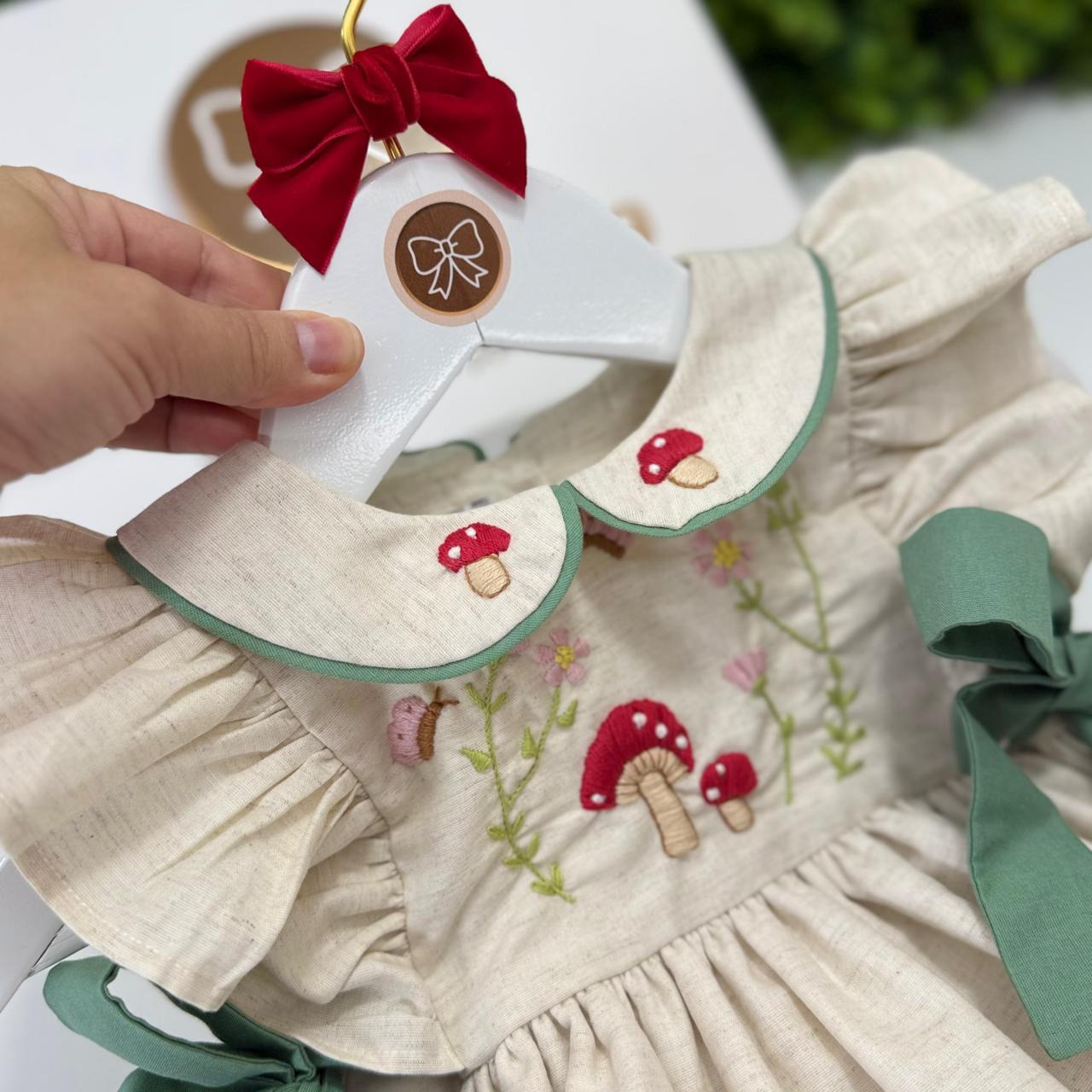 Vestido infantil confeccionado em algodão bege, com delicado bordado de cogumelos na golinha, busto e no comprimento. Laços laterais ajustáveis e forro interno, garantindo conforto e um ajuste perfeito para a criança.