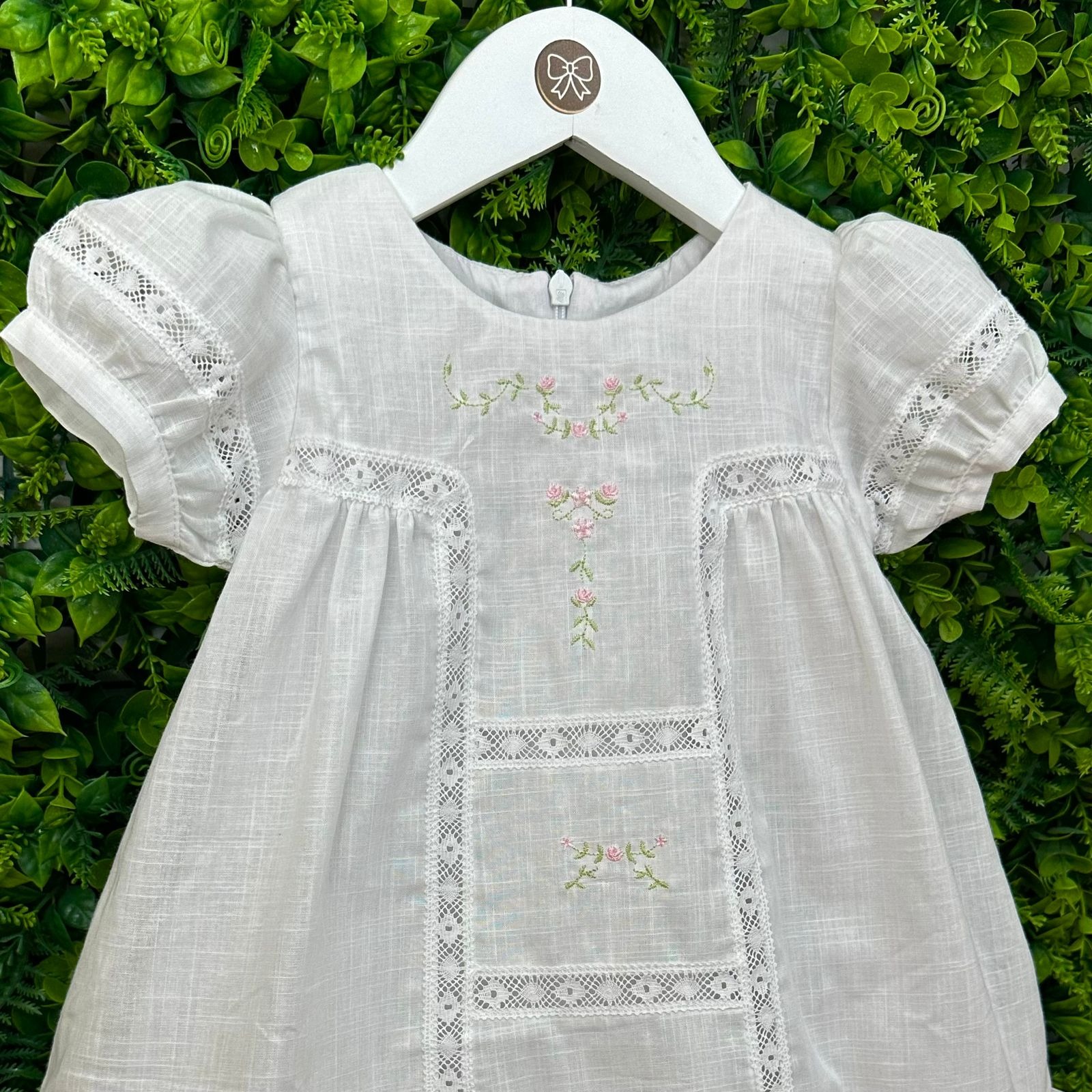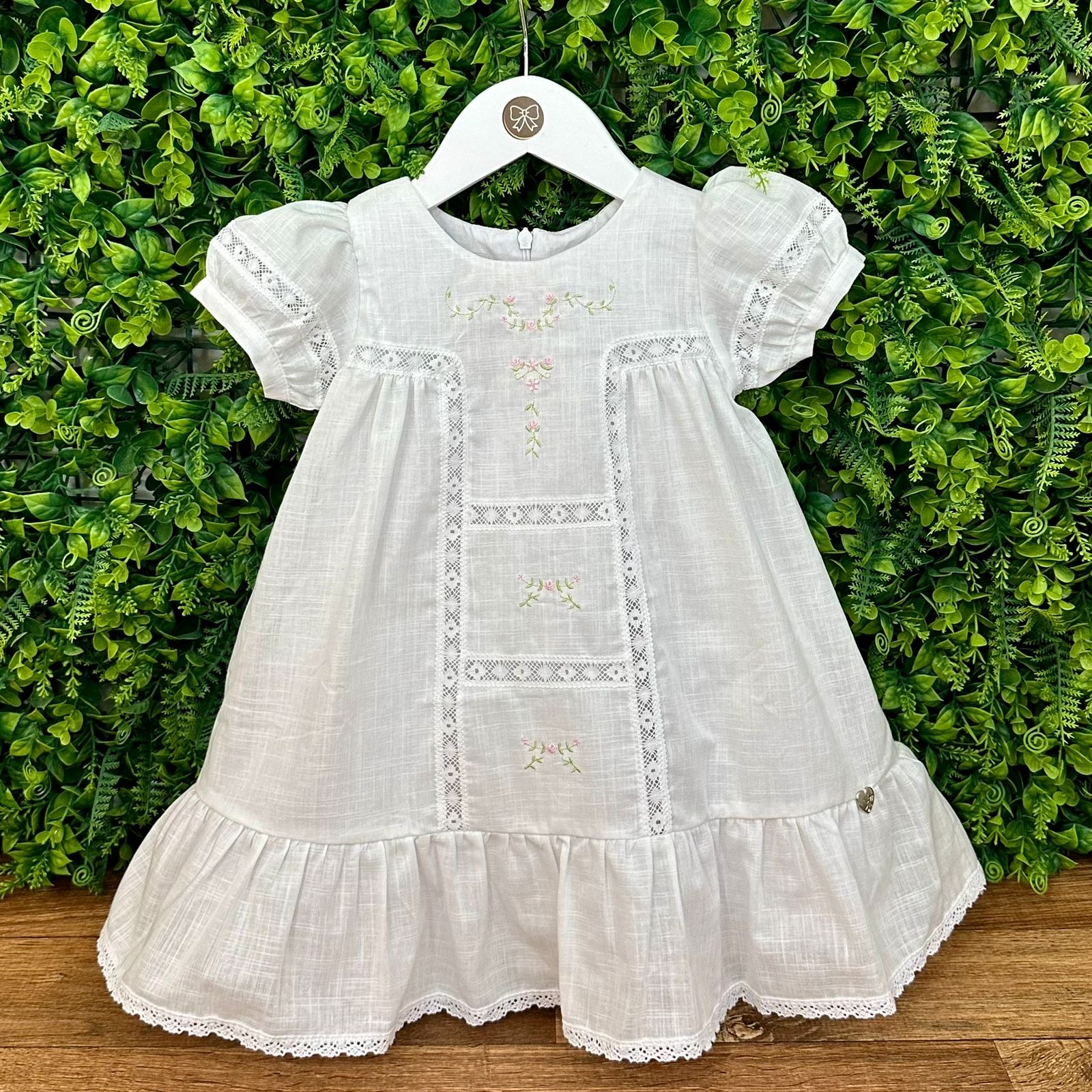 Este é um delicado vestido infantil em tecido branco leve, com um visual clássico e atemporal. A peça possui mangas curtas bufantes e detalhes em renda vazada ao longo da parte frontal, acrescentando charme e elegância. No centro, bordados sutis em tons de rosa e verde formam pequenos raminhos florais, trazendo um toque romântico. A saia tem um babado amplo na barra, finalizado com acabamento em renda, que dá movimento e suavidade ao vestido.
