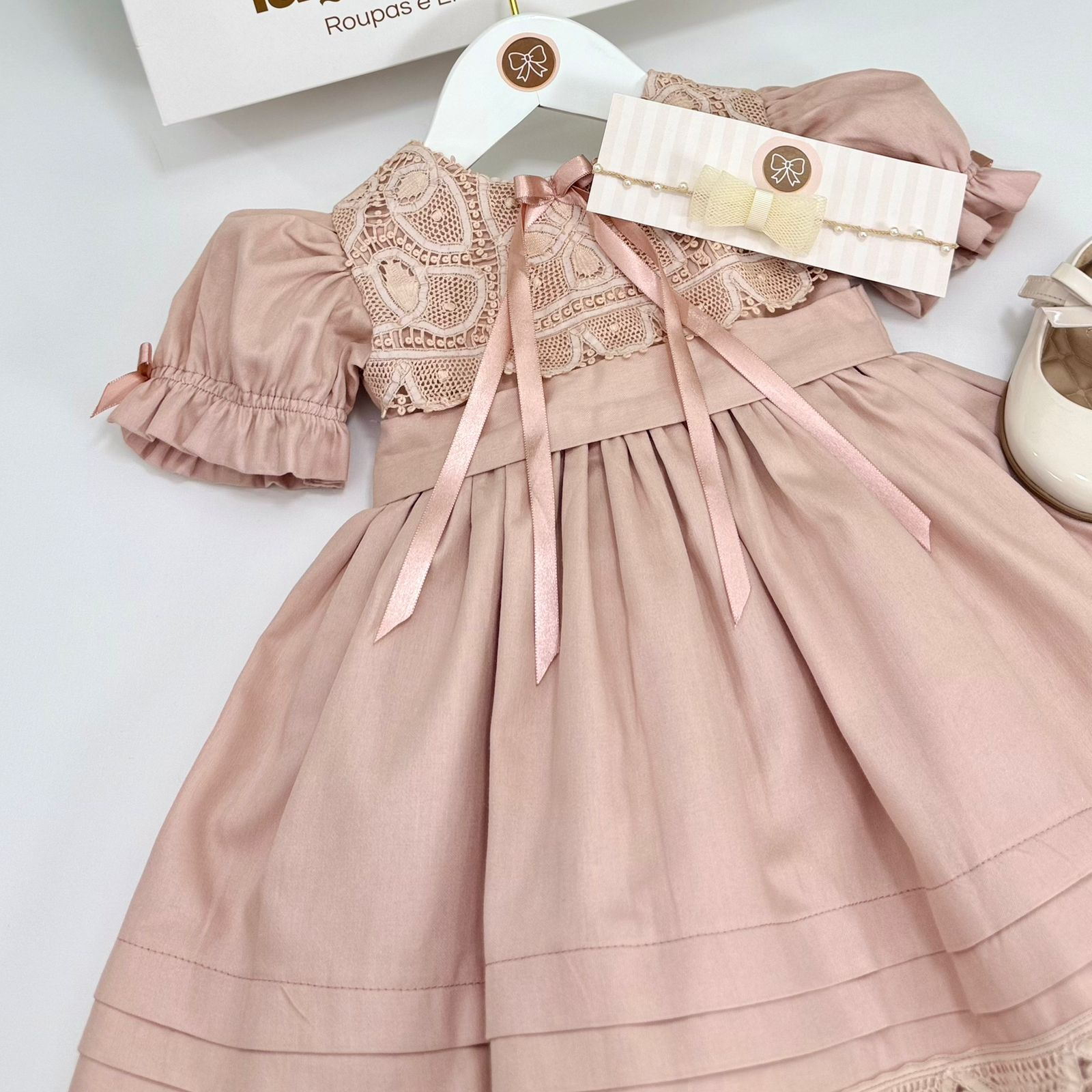 Vestido delicado em tom rosa chá, com pala em renda renascença no busto e mangas curtas levemente bufantes com acabamento franzido. Possui laço frontal e saia com pregas, finalizada com detalhe em renda na barra, trazendo um visual clássico e elegante.