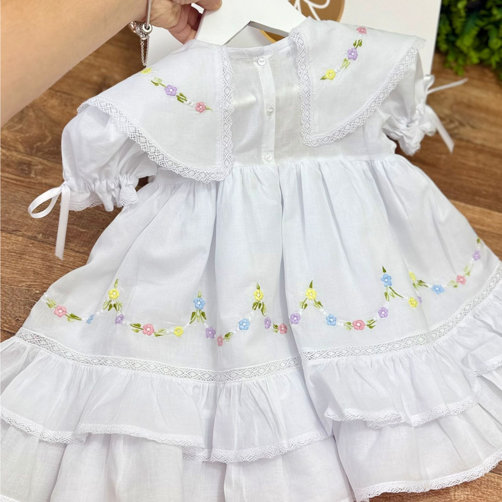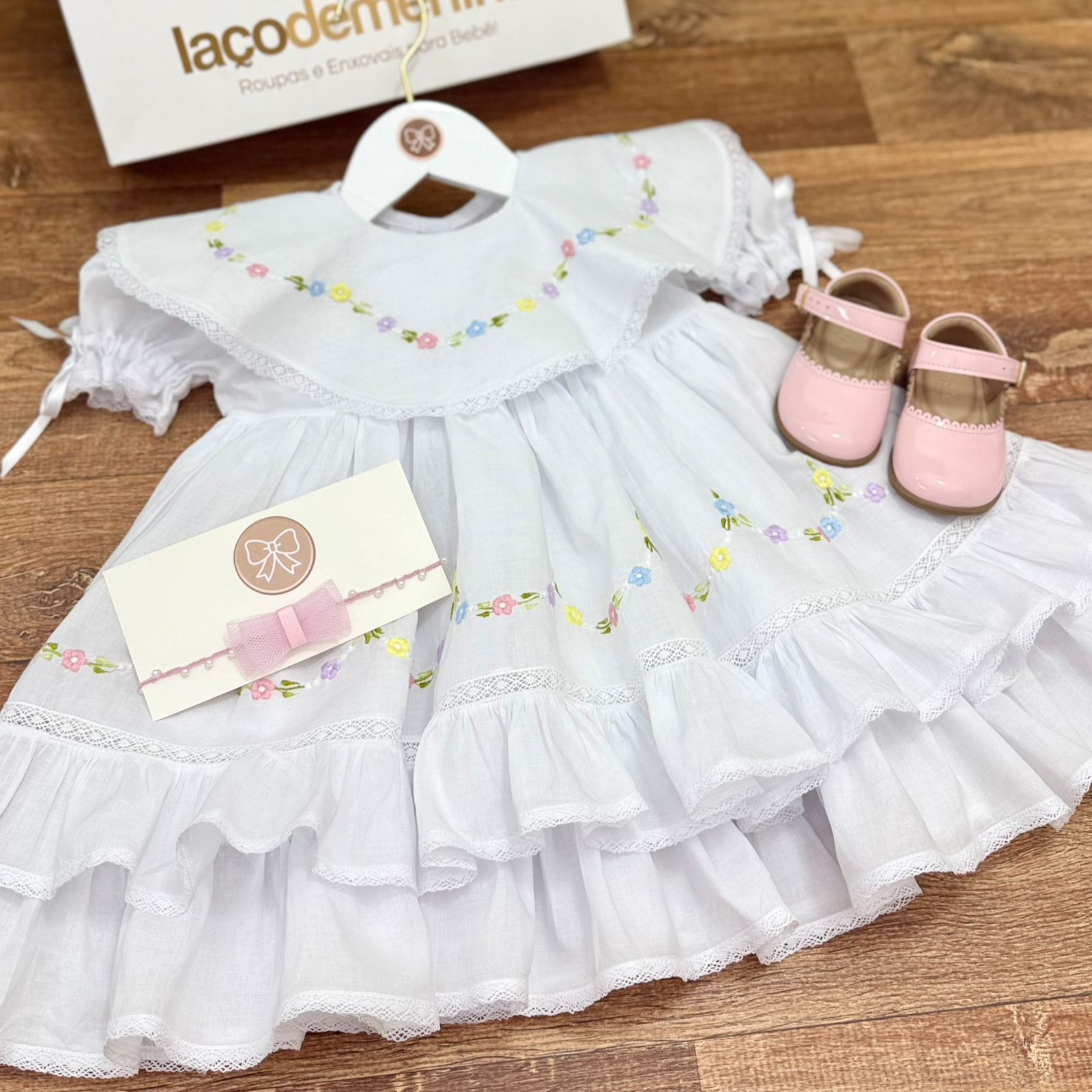 Vestido confeccionado inteiramente em cambraia de algodão, com mangas reguláveis e delicadas nesgas de renda paraibana aplicadas na gola, nas mangas e na barra. Os bordados florais coloridos na gola e na barra acrescentam um toque artesanal e romântico à composição.