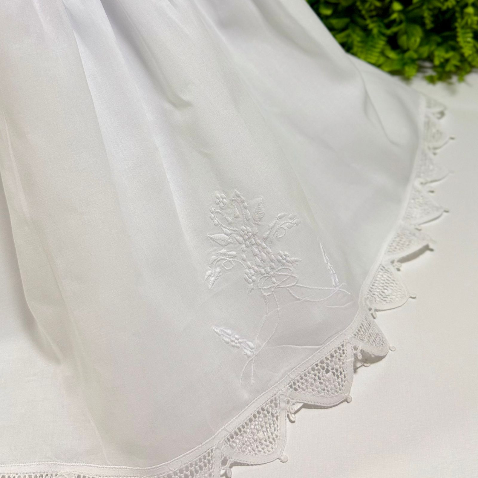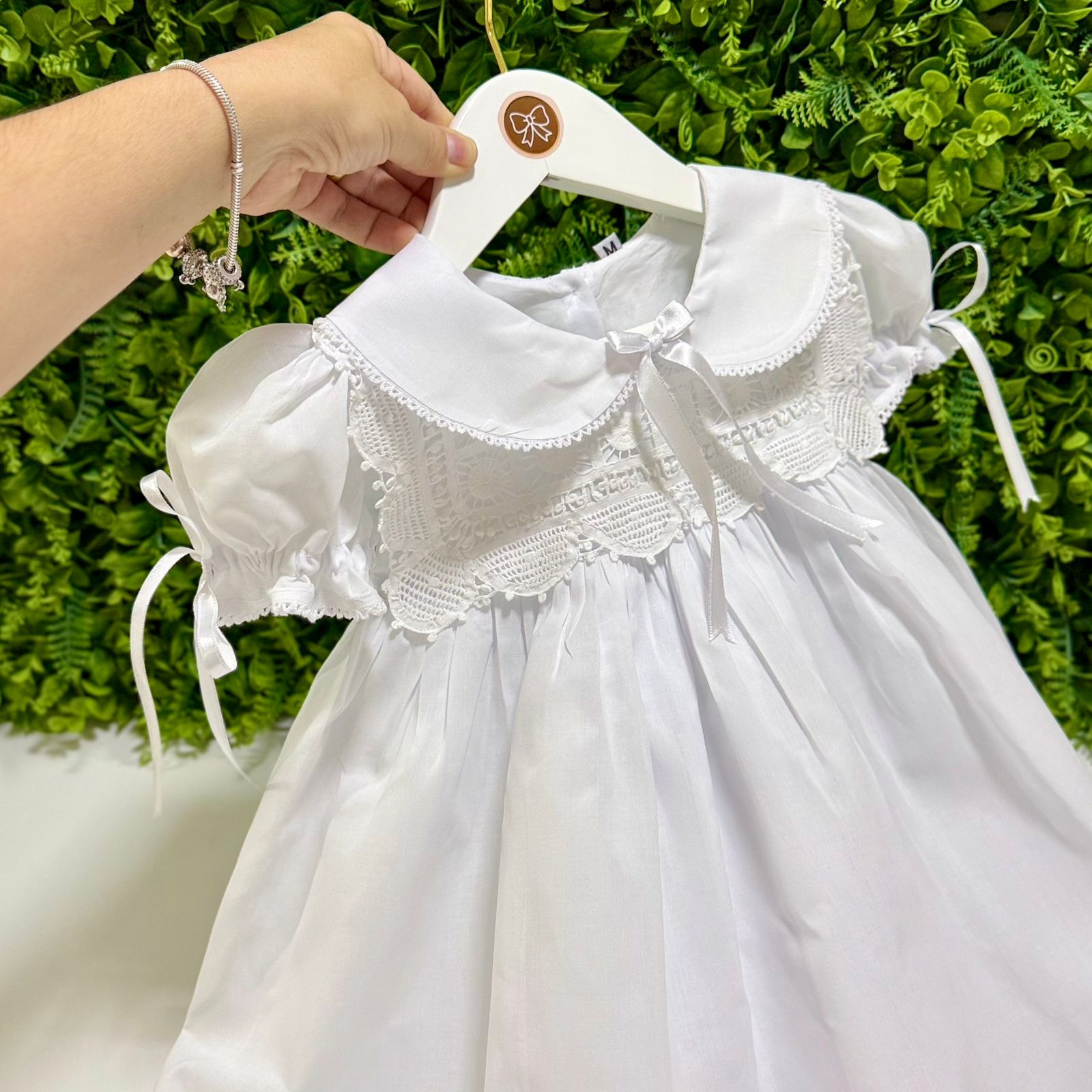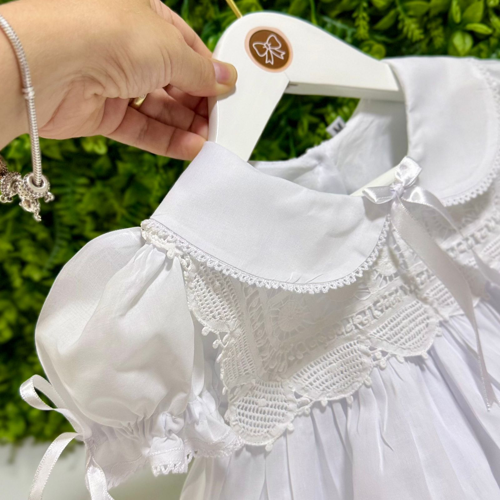 Vestido de batismo delicado, confeccionado em tecido leve, com mangas curtas bufantes e gola clássica. Destaque para a renda renascença no busto, rica em detalhes artesanais. A saia possui caimento fluido e acabamento em renda na barra, garantindo elegância e conforto para a ocasião especial.
