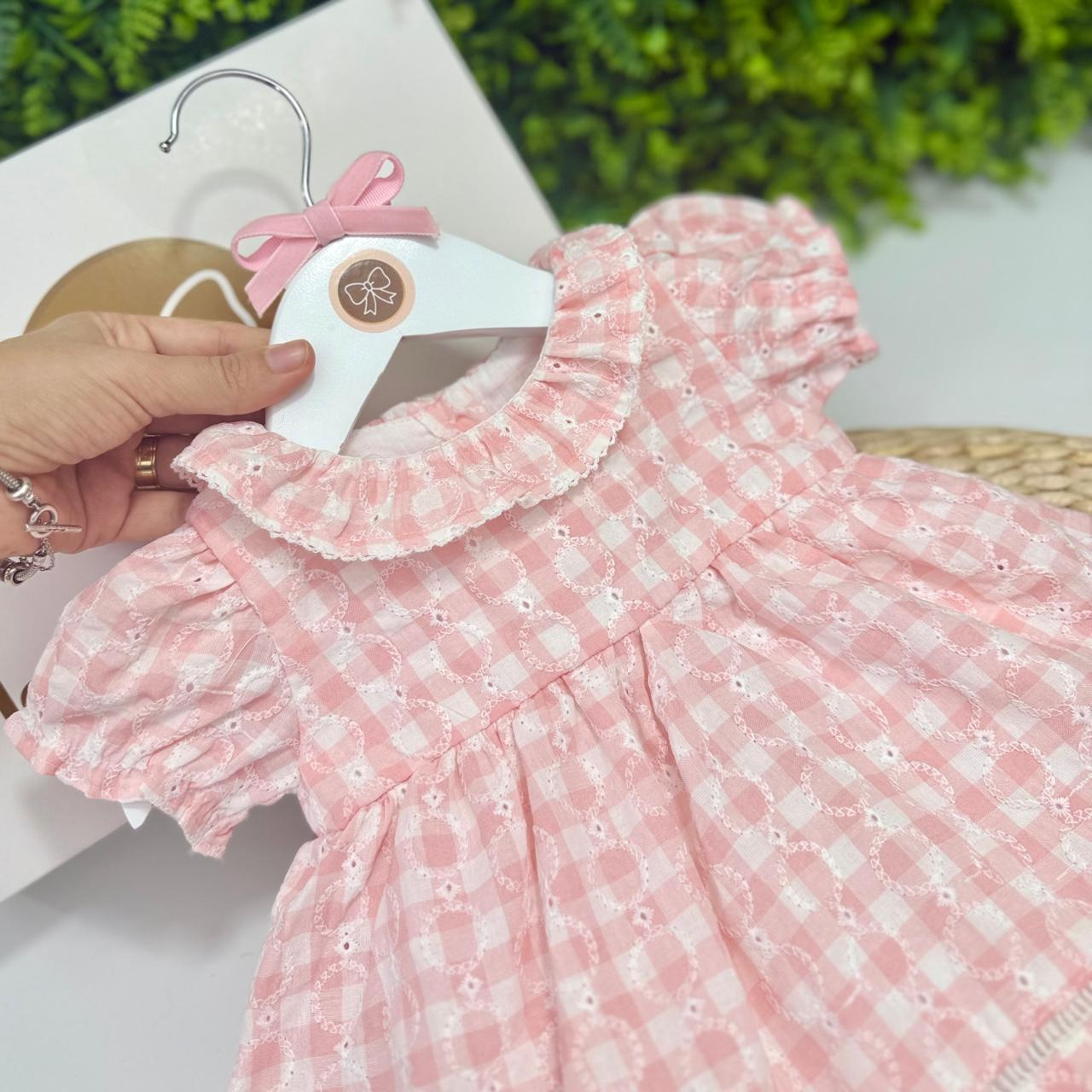 Um verdadeiro encanto em forma de vestido! Com estampa xadrez rosa super delicada, este modelinho é confeccionado em tecido macio com toque suave, composto por 55% algodão e 45% poliéster, garantindo conforto e liberdade para os movimentos da sua pequena. Possui fechamento por botão nas costas, facilitando na hora de vestir.