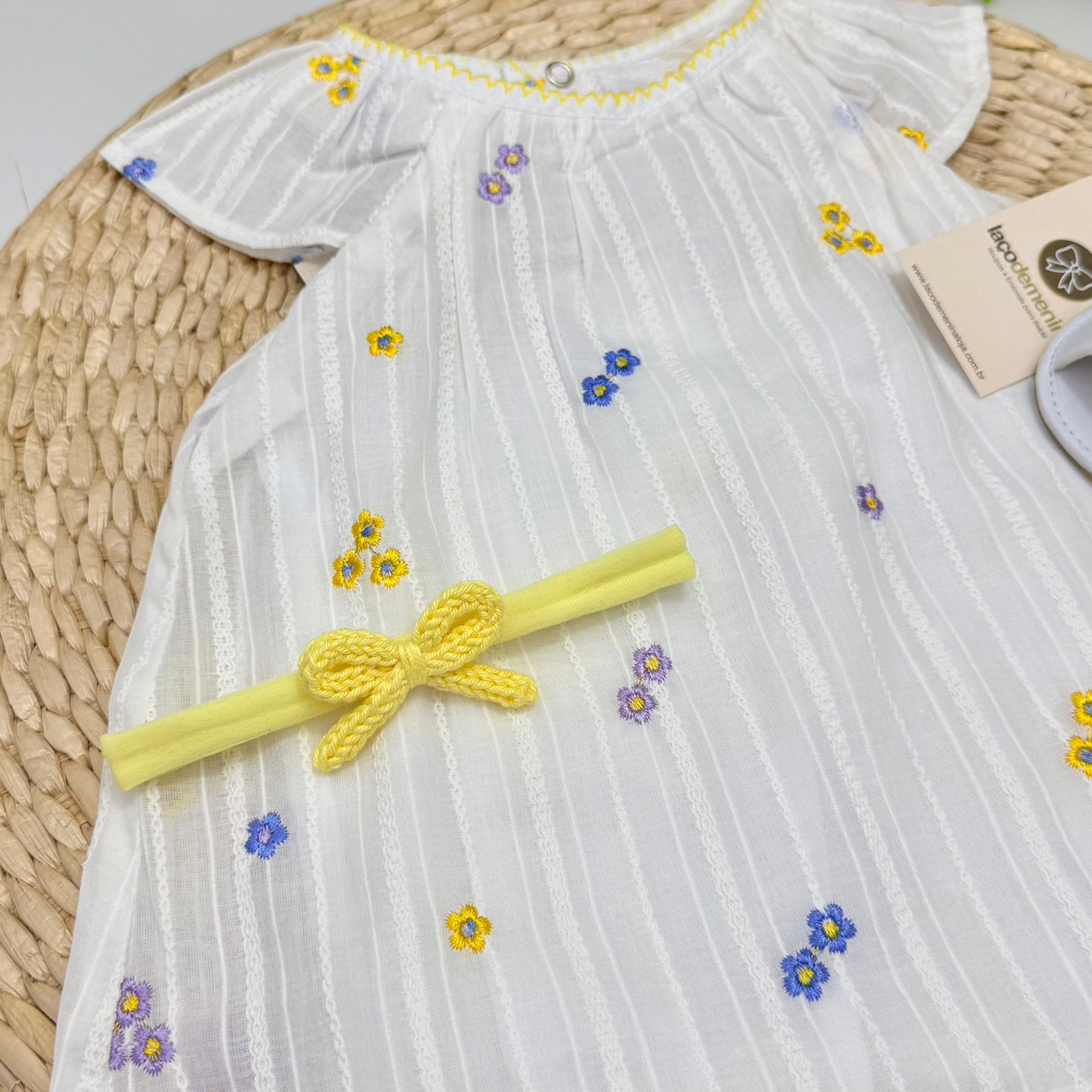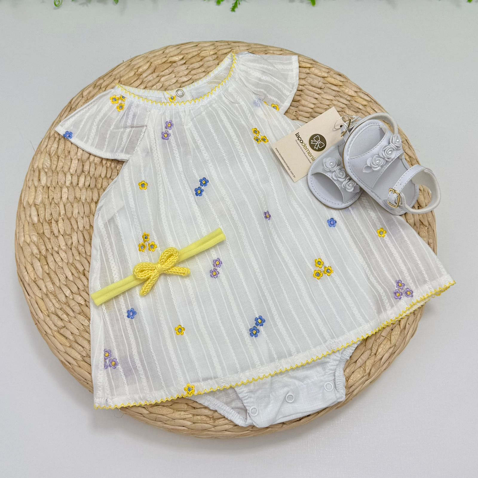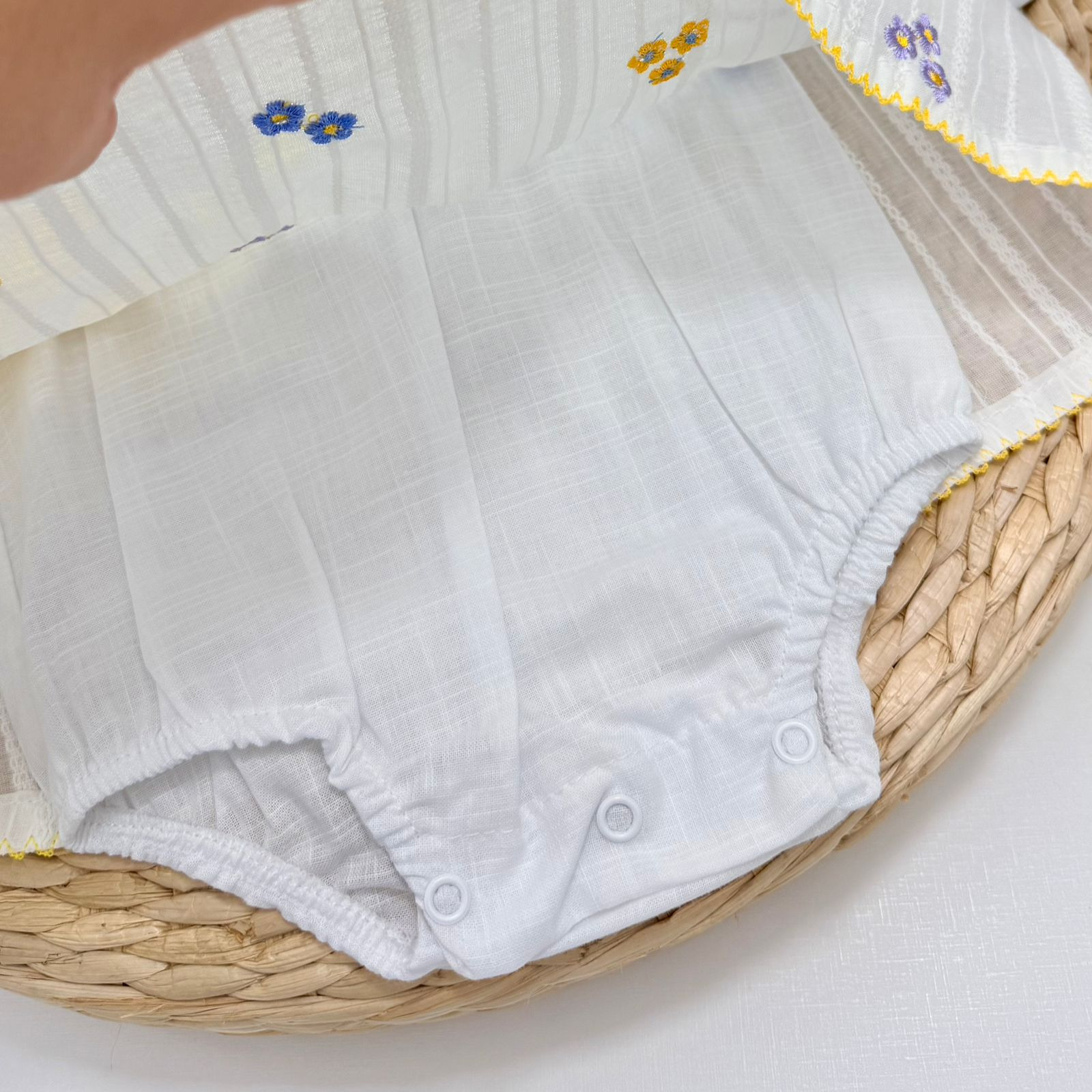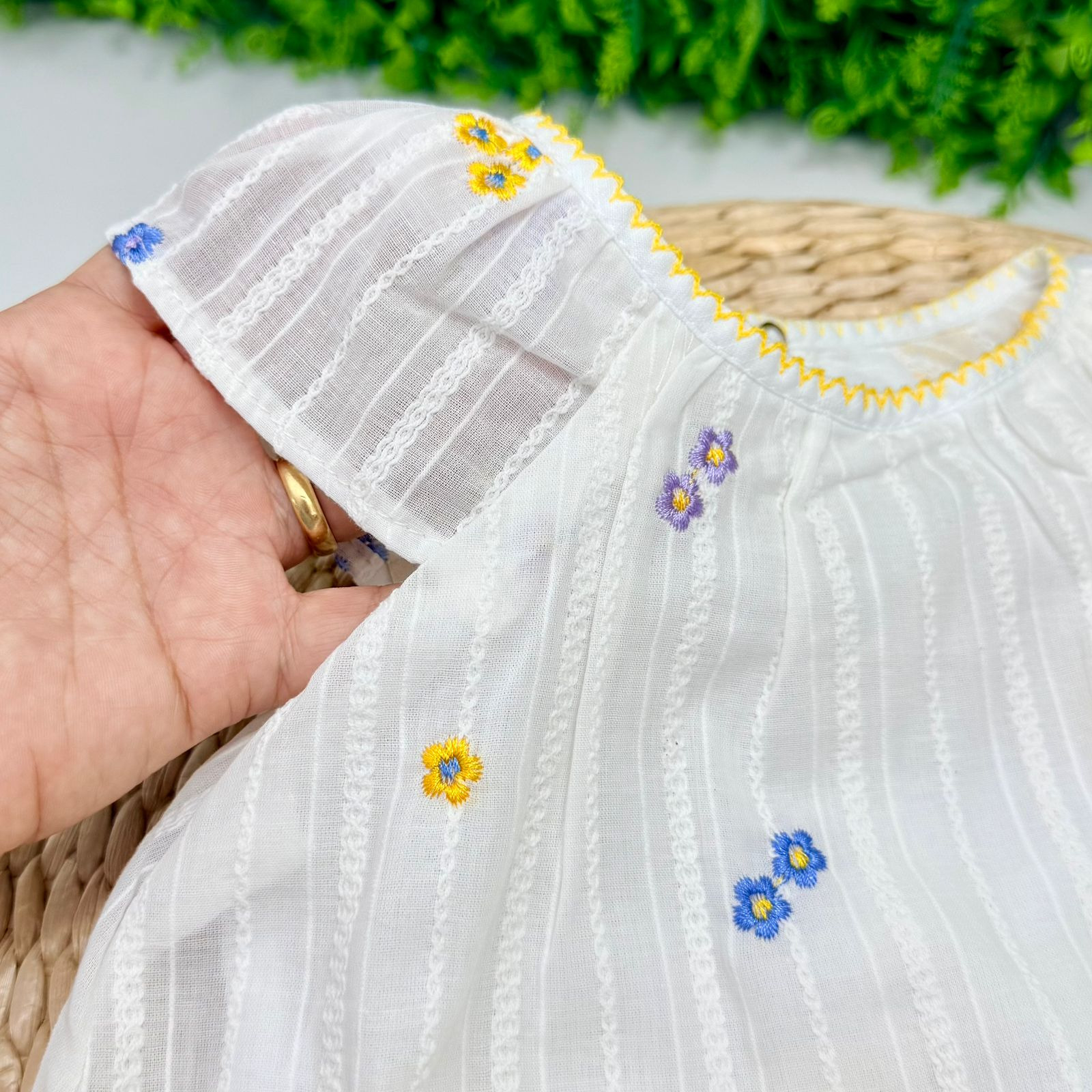 Vestido body confeccionado em tecido 100% algodão, oferecendo conforto e respirabilidade para a pele delicada da bebê. O modelo apresenta estampa de flores delicadas por todo o comprimento, manguinhas encantadoras e um caimento leve. Na parte de trás, o fechamento em botões facilita na hora de vestir, enquanto o body integrado conta com botões de pressão no fundo, garantindo praticidade durante as trocas. Uma peça charmosa, confortável e perfeita para qualquer ocasião especial.