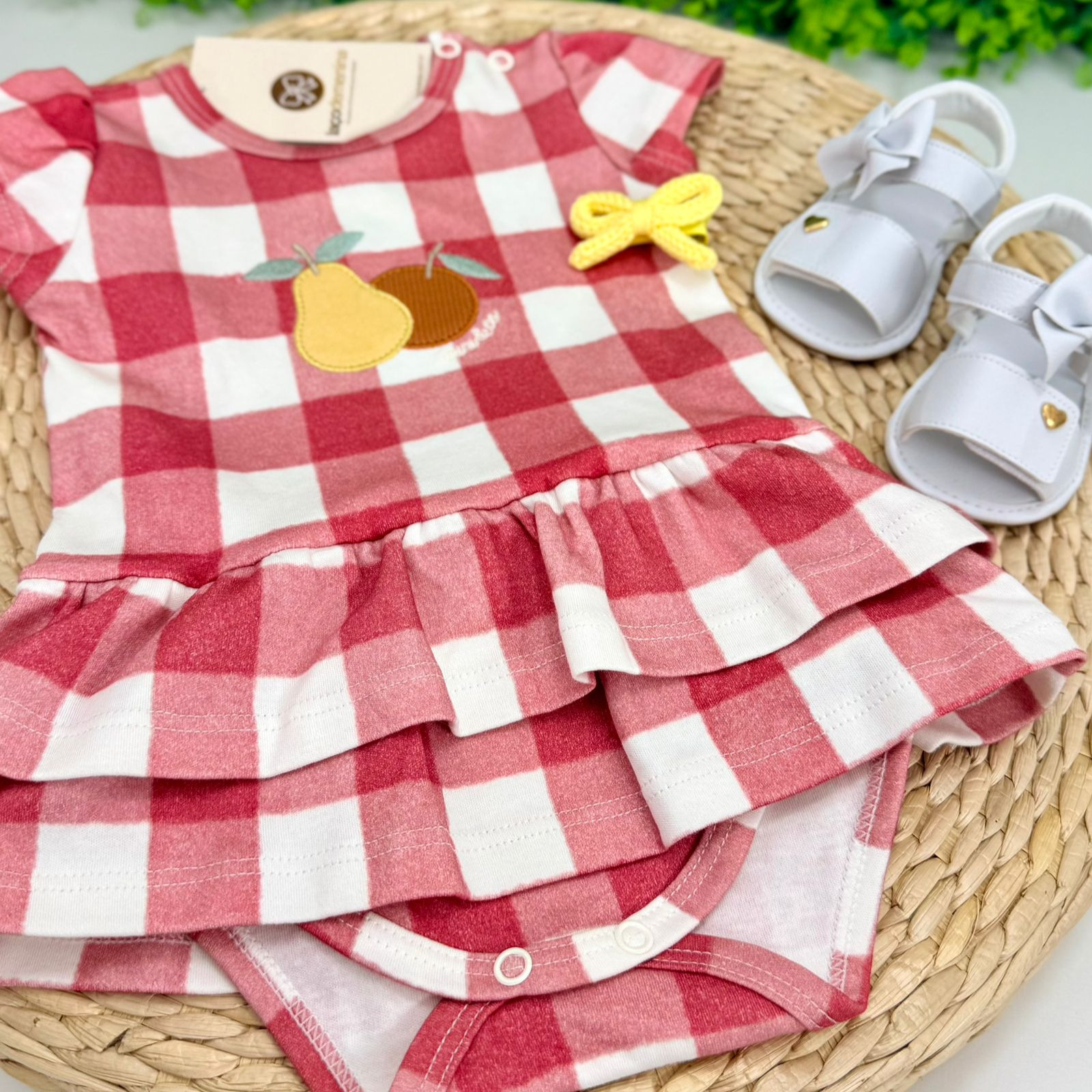 Vestido body infantil confeccionado em malha 100% algodão, ideal para o dia a dia das pequenas. Possui estampa xadrez em tons de vermelho e branco, trazendo um visual alegre e delicado. O destaque fica por conta do bordado frontal com frutinhas, que adiciona um charme especial à peça. Conta com modelagem prática estilo body, com botões de pressão na parte inferior que facilitam a troca, além de babado na saia que deixa o look ainda mais fofo.