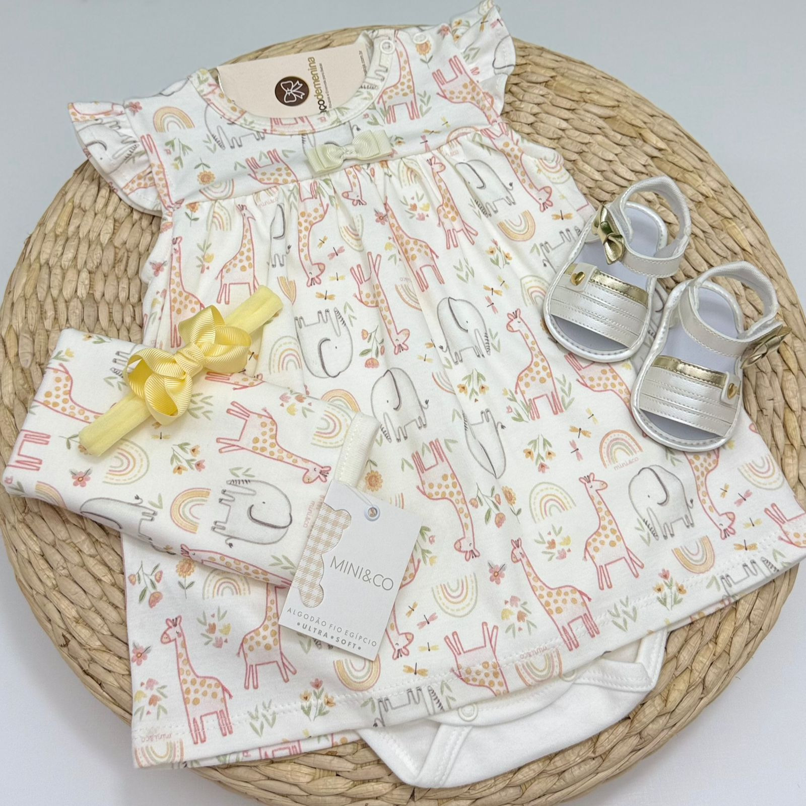 Conjunto delicado e confortável para bebê, confeccionado em algodão egípcio de alta qualidade, garantindo toque macio e suavidade para a pele sensível. O vestido body possui estampa encantadora com animais e detalhes delicados, trazendo charme e leveza para o look.