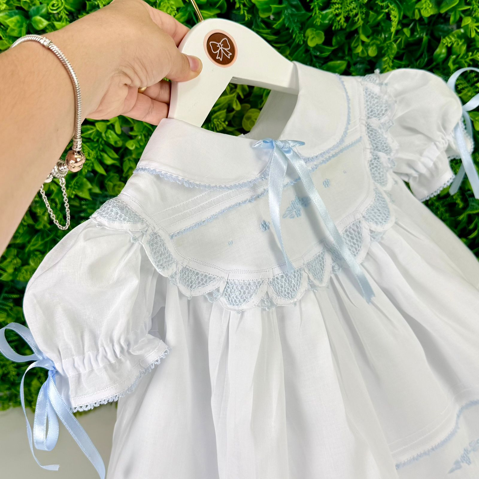 Vestido em cambraia de algodão, bordado manualmente com bico em renda renascença azul. Acompanha Calcinha.