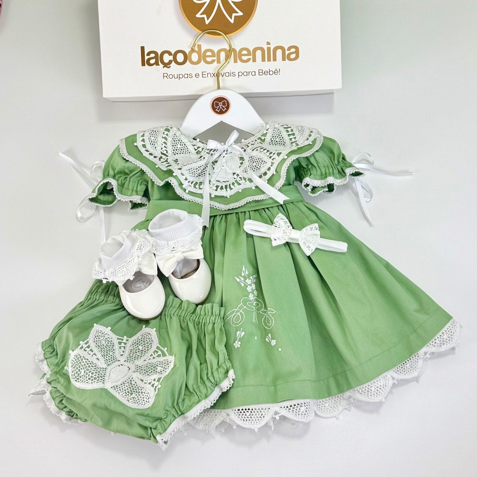Vestido em cambraia de algodão verde, com gola delicada em duas camadas uma de algodão e outra de renda renascença, e laço ajustável na cintura. A peça conta com forro interno também em cambraia de algodão, finalizado com elegantes detalhes em bordado de linha nas extremidades.