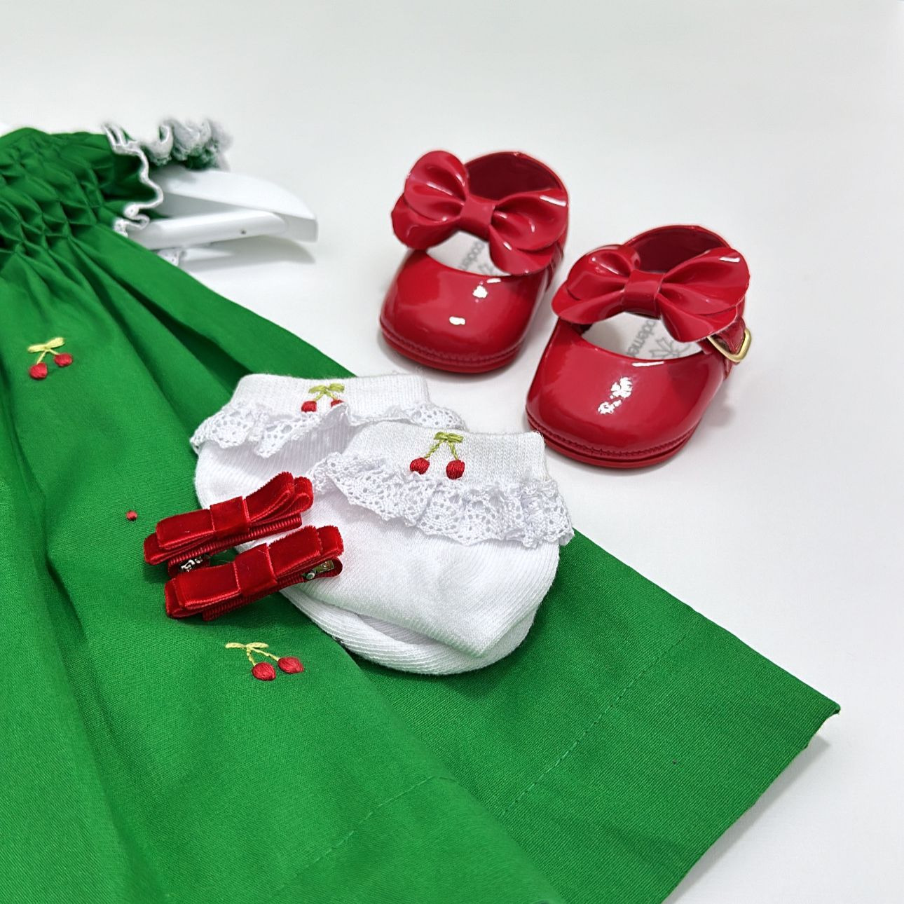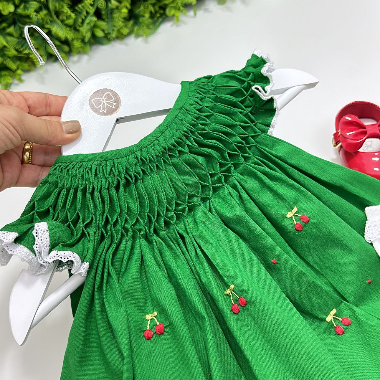 Vestido confeccionado em fustão 100% algodão na cor verde, com bordados manuais de cerejinhas em seu comprimento e bico de cambraia na manguinha.