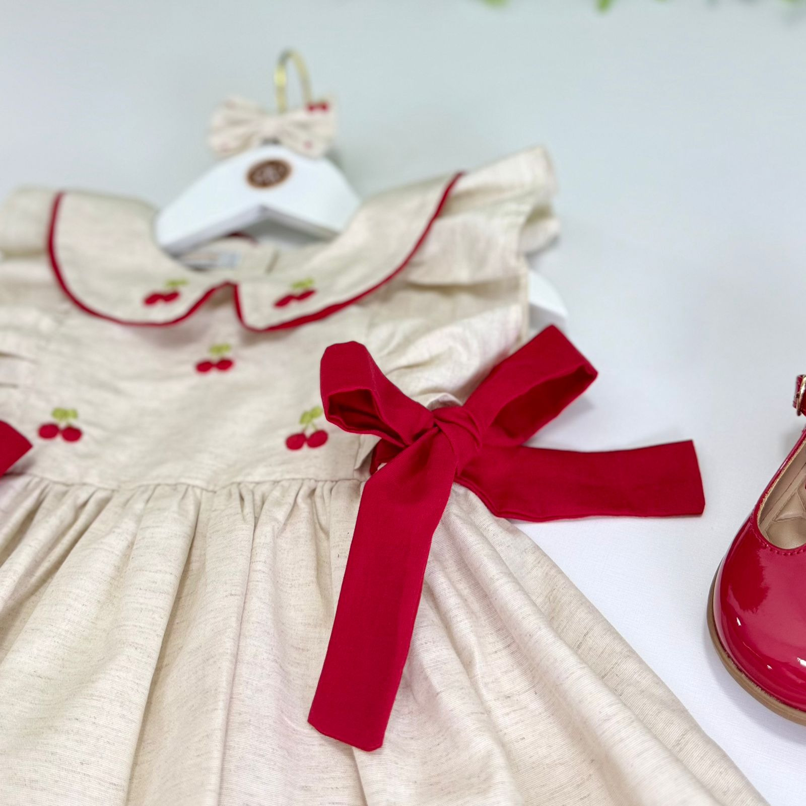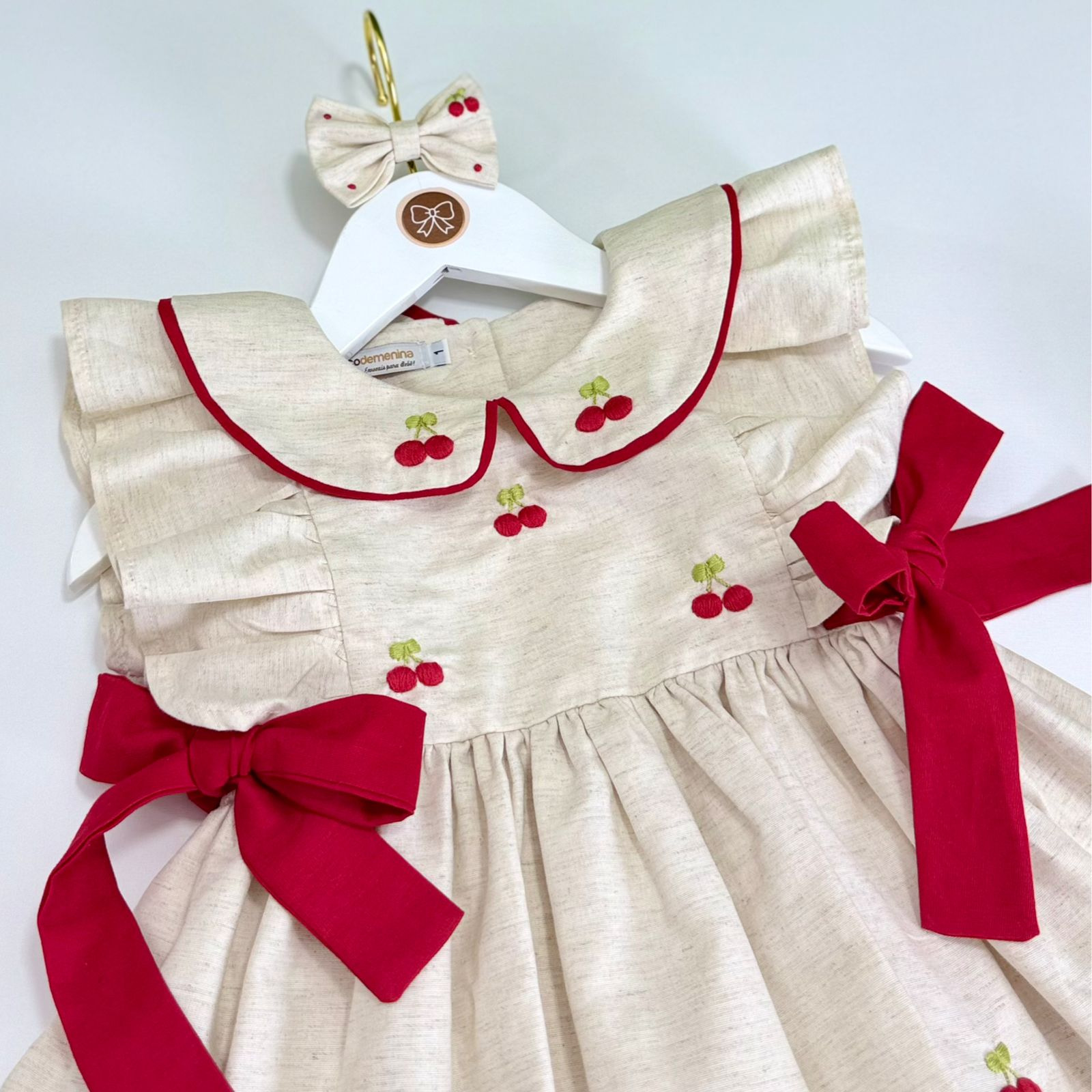 Vestido infantil em algodão bege, com bordado de cerejinha no comprimento. Possui laços laterais ajustáveis e forro interno, garantindo charme e conforto.