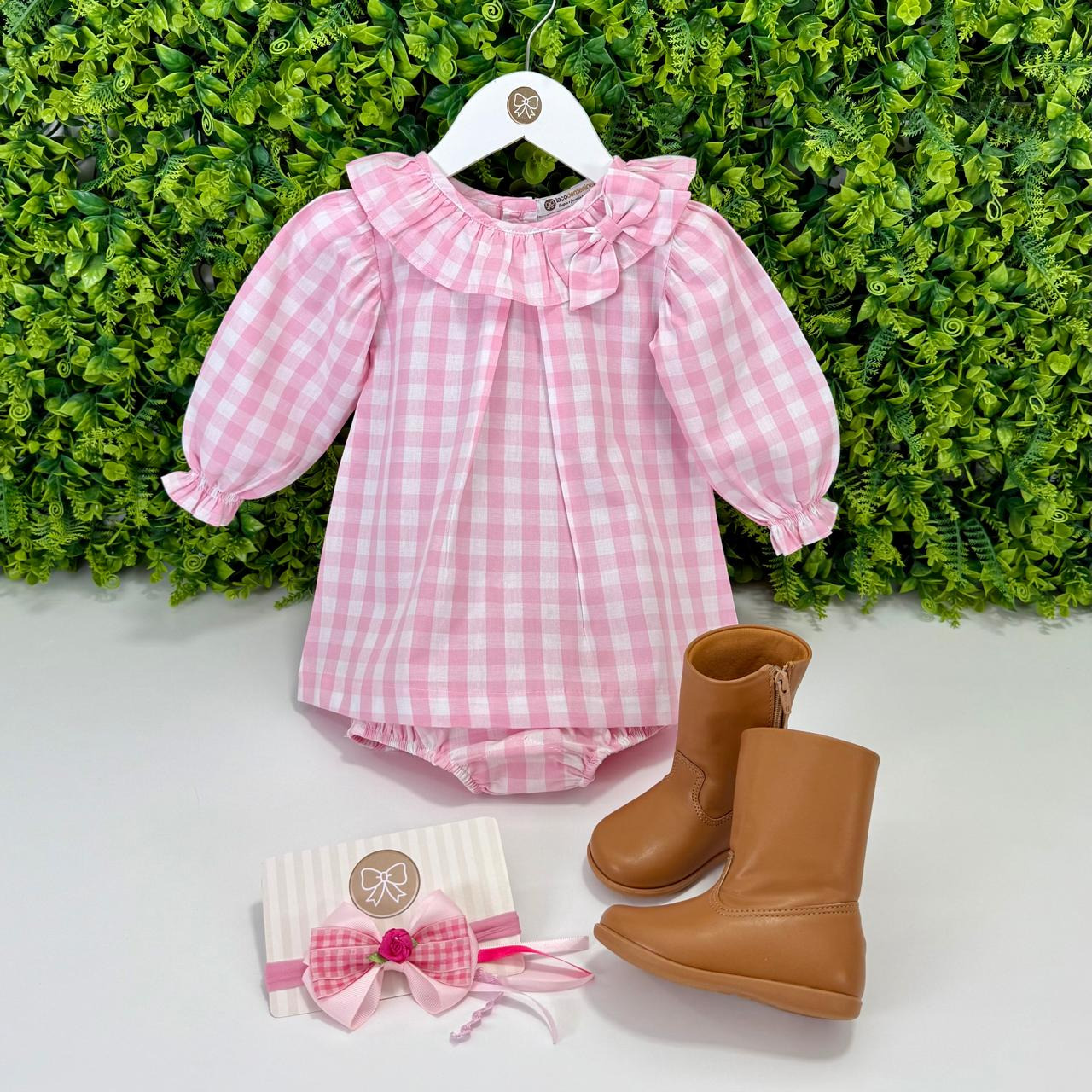 Vestido confeccionado em tecido 100% algodão, na estampa xadrez na cor rosa claro. Vestido possui botões na parte de trás para facilitar na hora da troca e vai acompanhado com calcinha na mesma estampa e tonalidade do vestido.