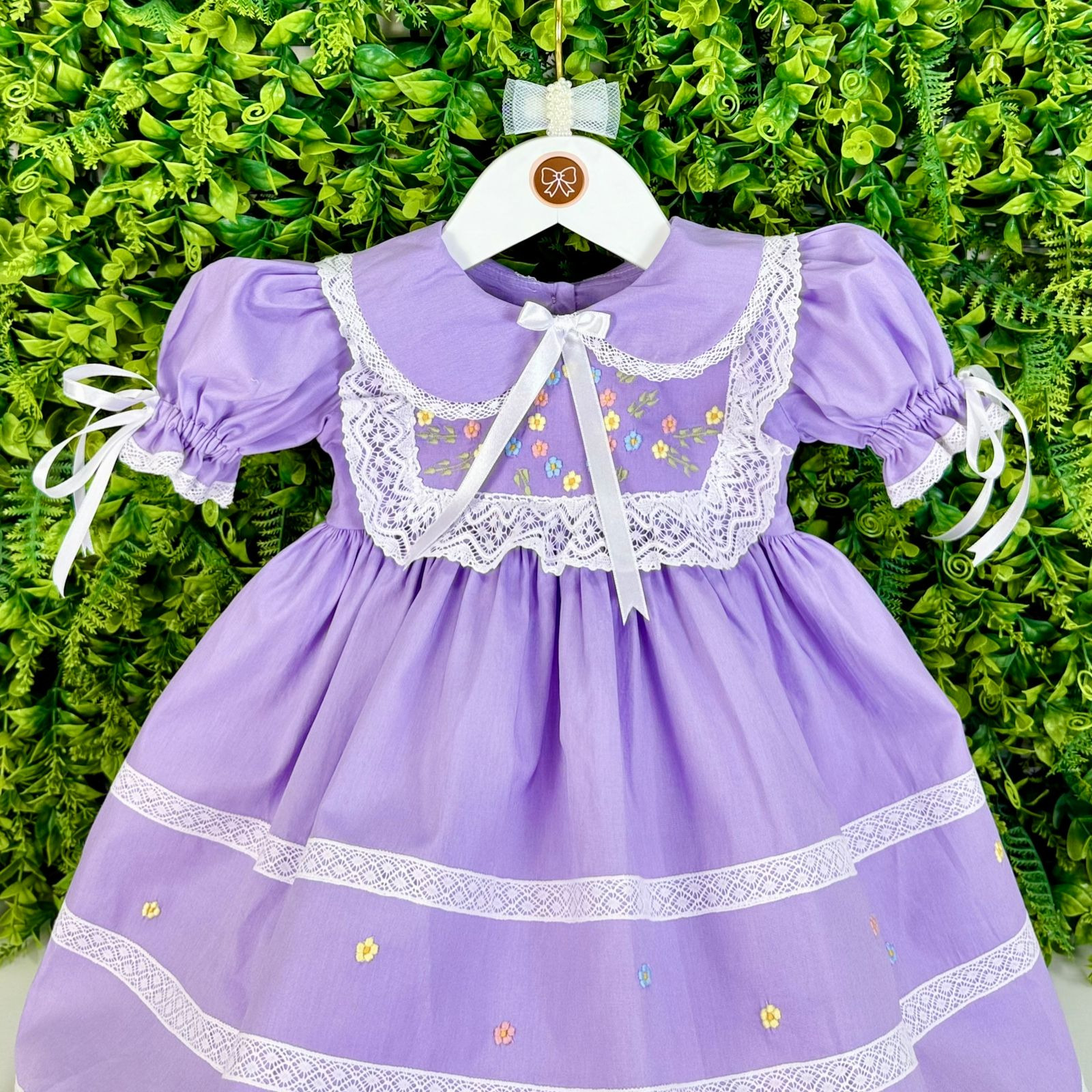 Delicado e encantador, este vestido infantil em tecido 100% algodão na cor lavanda traz bordado floral no busto e acabamento com bico de renda paraibana. As manguinhas com ajuste em fitas de cetim adicionam um charme especial, enquanto o forro interno garante conforto. Fechamento por botões nas costas.