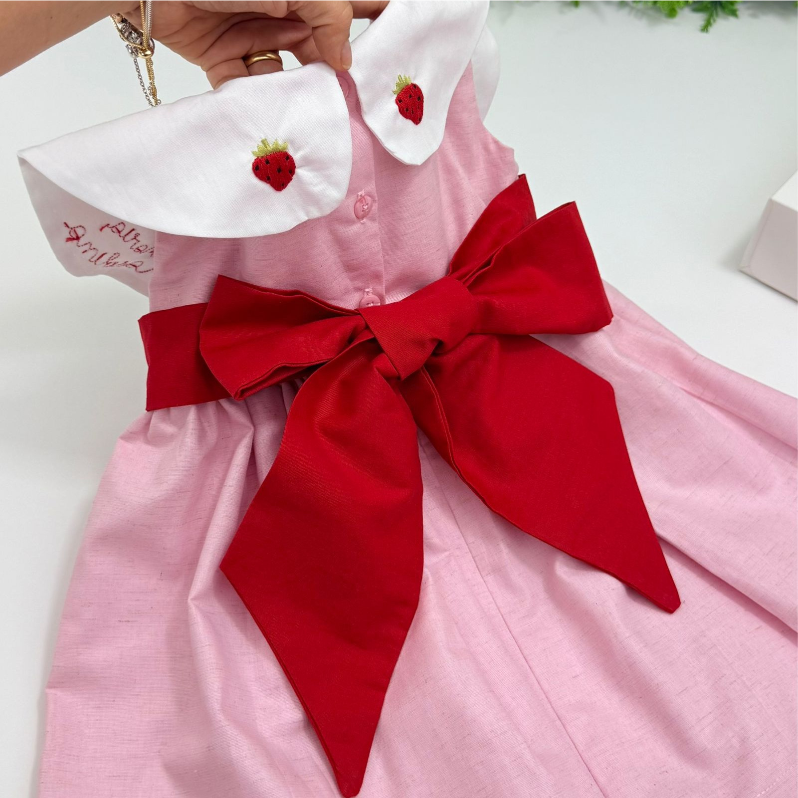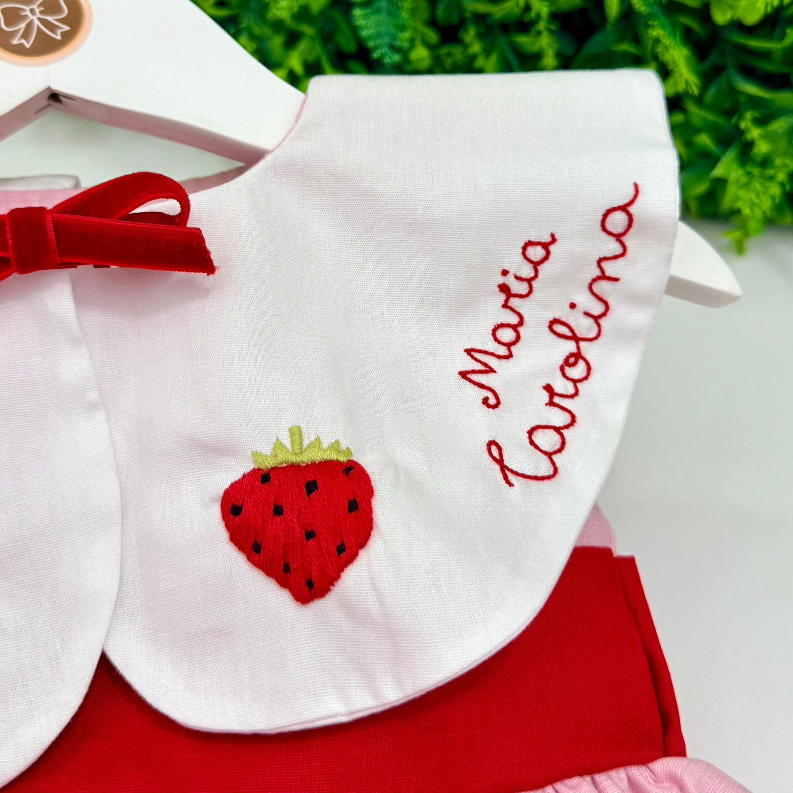 Confeccionado em tecido de linho confortável, o modelo traz uma combinação apaixonante de rosa suave com faixa vermelha na cintura, que valoriza ainda mais o visual. O grande destaque fica por conta da gola bordada à mão com detalhes de moranguinhos e aplicação personalizada com nome, deixando a peça exclusiva e cheia de charme. O lacinho vermelho no centro da gola complementa o look com um toque clássico e delicado.