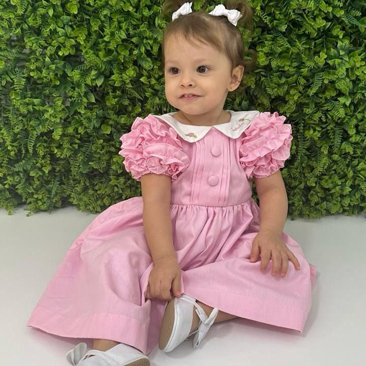 Vestido de festa sob encomenda, feito em tecido 100% algodão, com forro interno para garantir o máximo conforto à criança. Detalhe encantador: bordado manual na golinha, tornando a peça única e delicada.