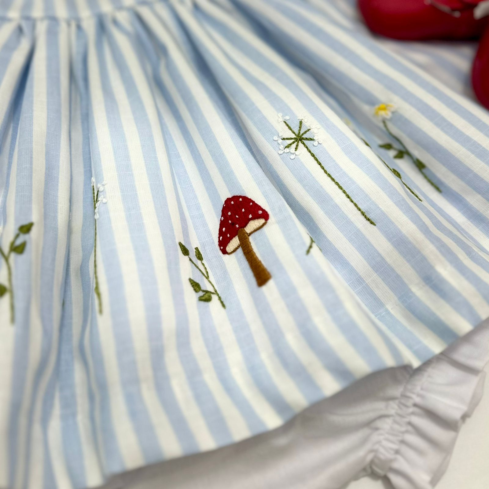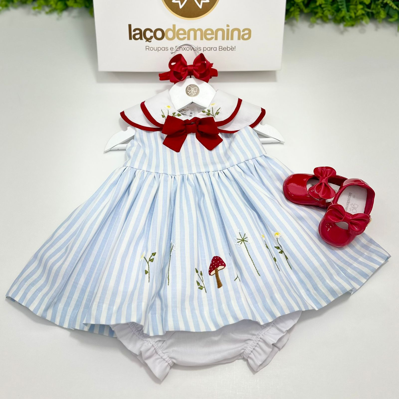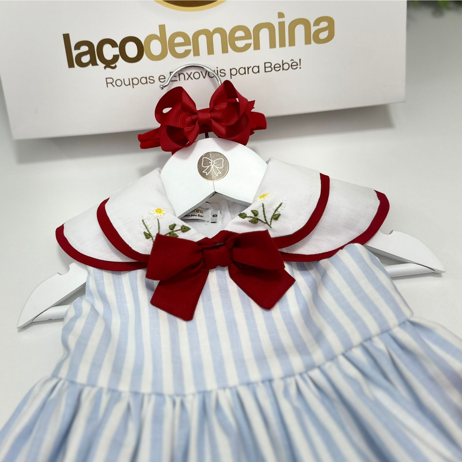 Vestido confeccionado em tecido de algodão com estampa listrada azul e branca. Ele conta com uma golinha dupla, delicadamente bordada à mão e adornada com um laço elegante. A barra do vestido também apresenta bordado artesanal, enquanto o forro interno garante máximo conforto para a sua criança.