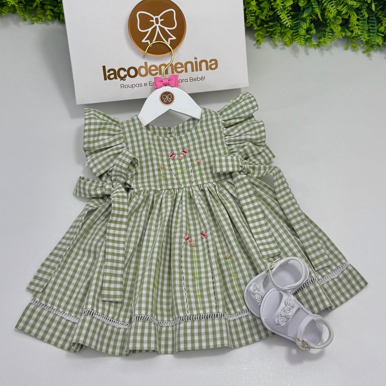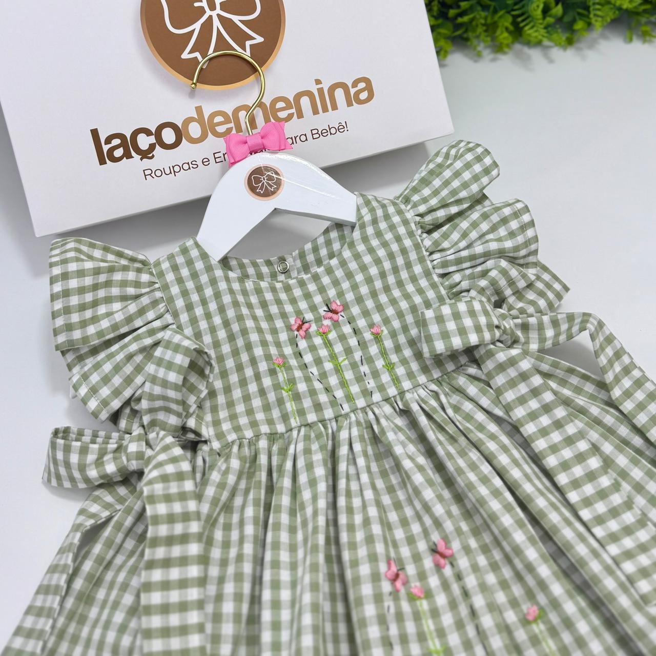 Vestido Jardim confeccionado em tecido 100% algodão, com delicados bordados manuais de flores e borboletas no busto e na barra, como ilustrado na imagem. Possui laços laterais para ajuste perfeito ao corpo e botões imantados nas costas, que garantem praticidade na hora de vestir.