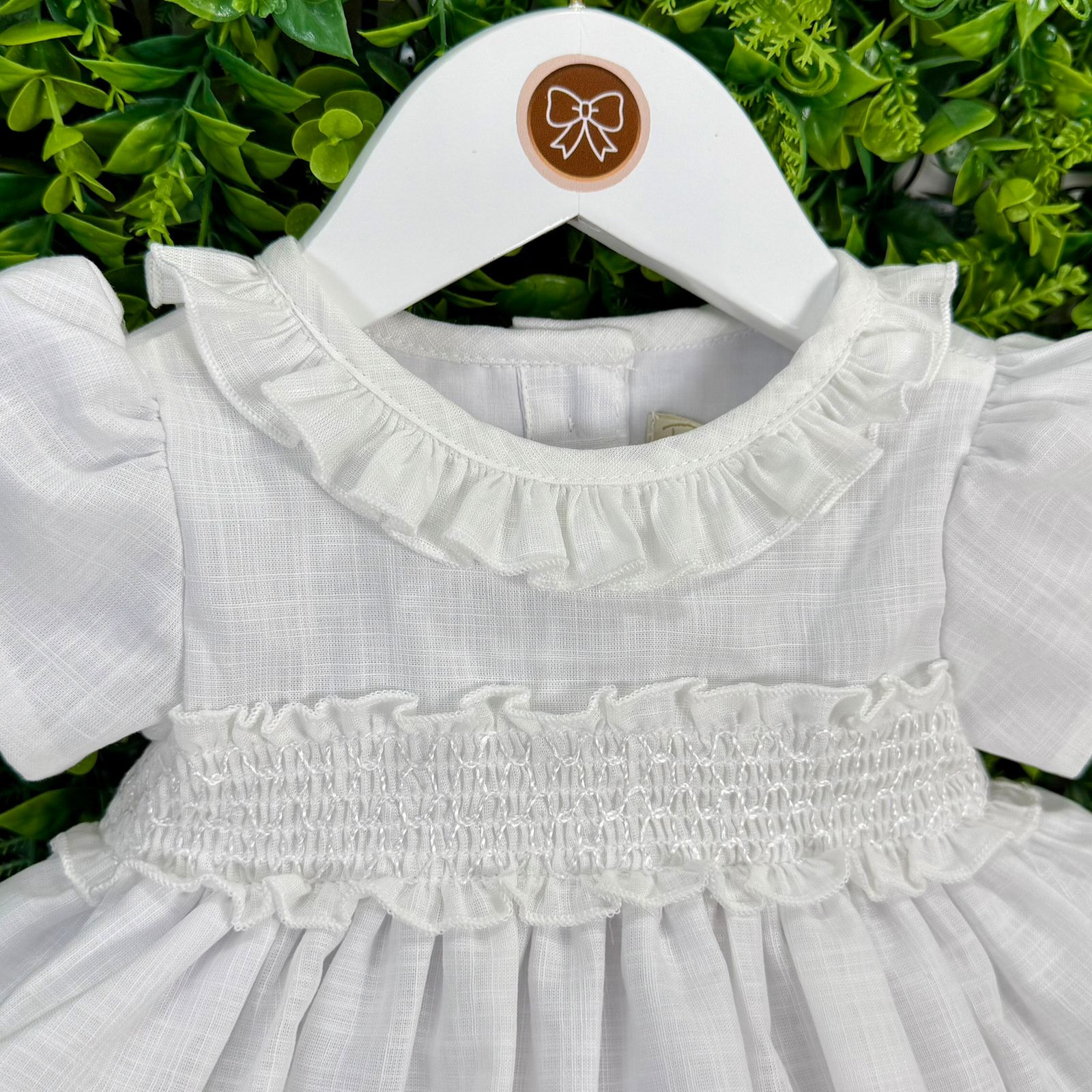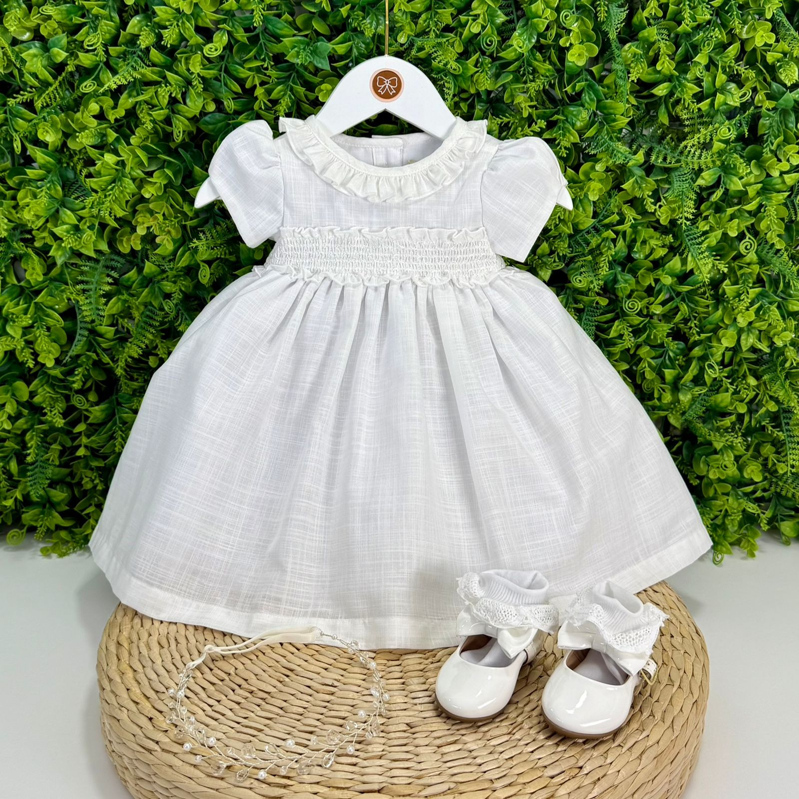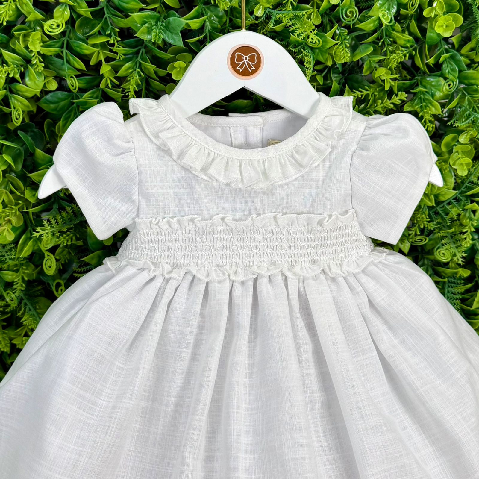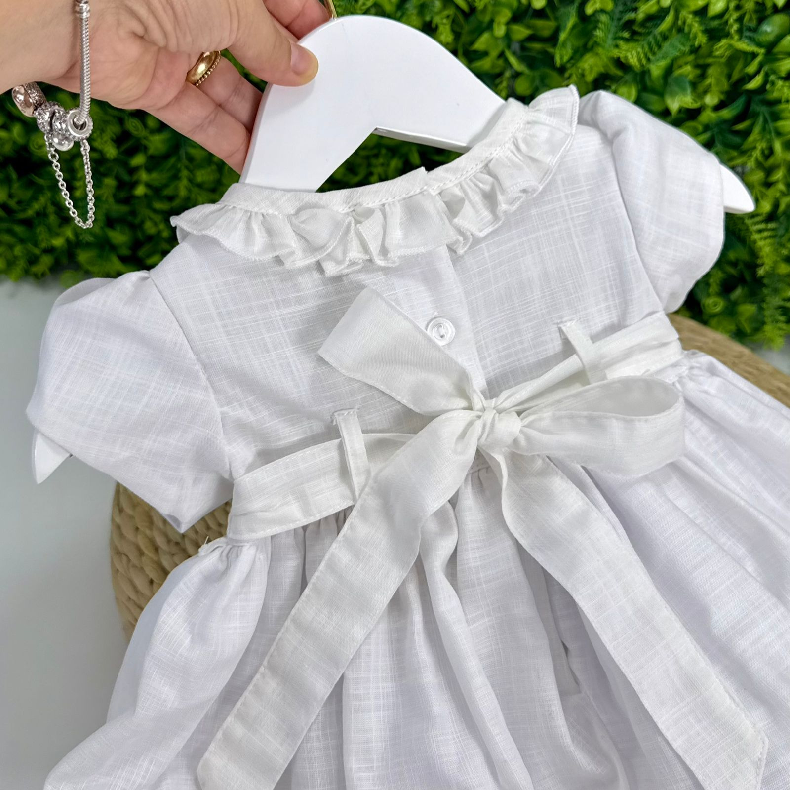 O modelo, na clássica cor branca, apresenta um design atemporal com mangas bufantes e gola com babadinhos, transmitindo pureza e elegância em cada detalhe. A parte superior conta com trabalho artesanal de smock (franzido bordado), que realça o acabamento e dá um toque de sofisticação ao visual.