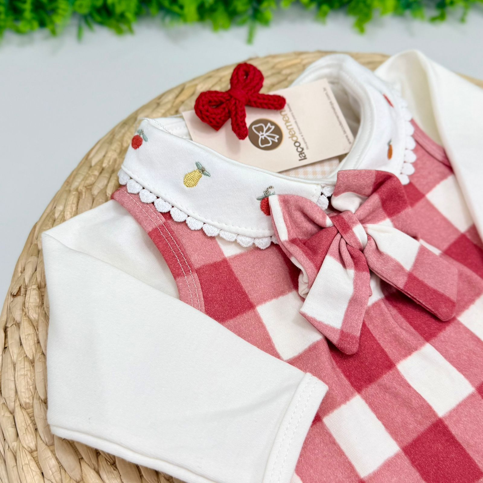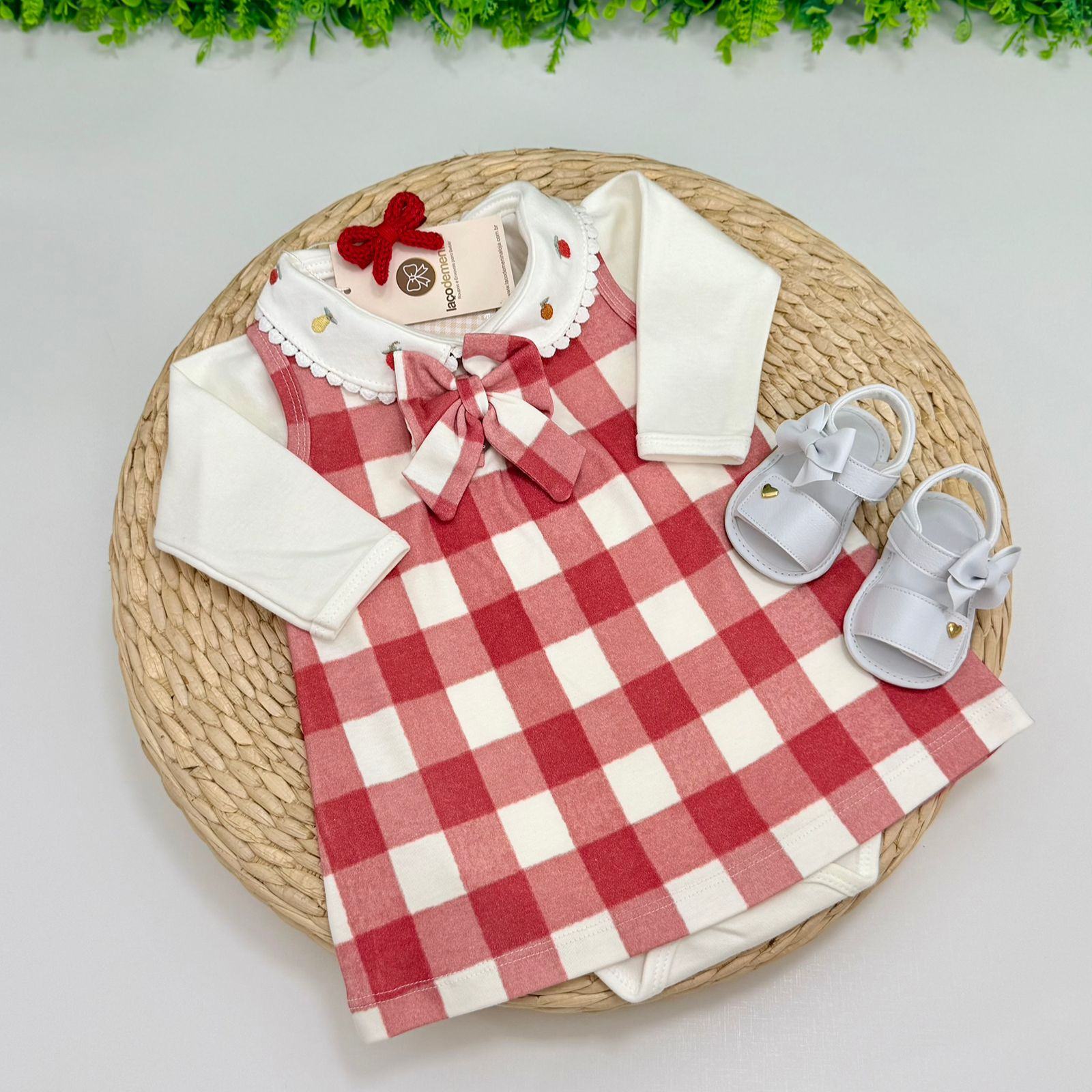 Vestido em tecido xadrez vermelho e branco, com laço frontal que traz um toque delicado. Acompanha body de manga longa branco, com gola bordada e acabamento em rendinha. Conjunto confortável e charmoso, perfeito para ocasiões especiais.