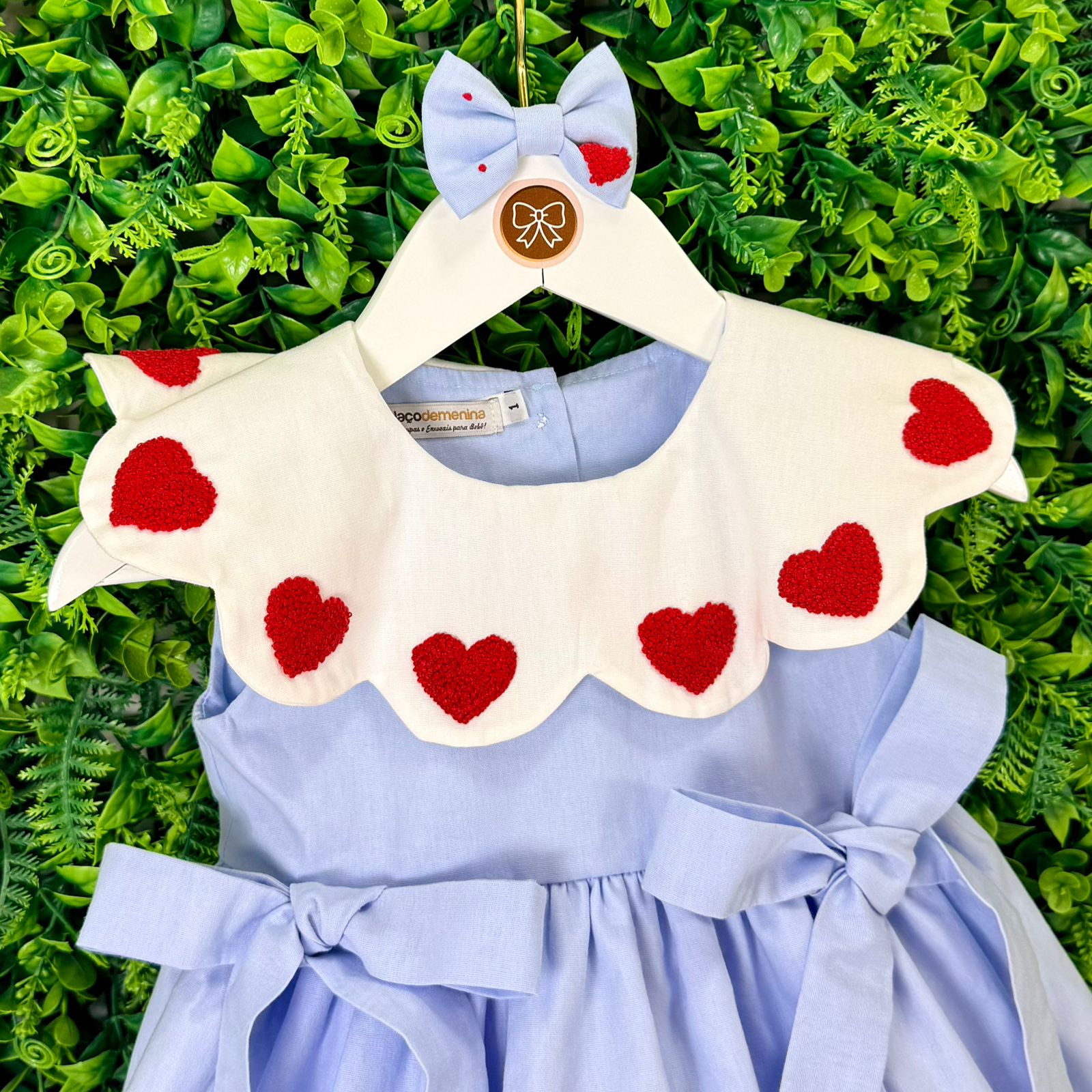 Confeccionado em tecido 100% algodão na clássica cor azul Alice, ele traz uma golinha bordada à mão com delicados corações, realçando o toque artesanal da peça. Possui forro interno macio, garantindo mais conforto à criança, e fechamento por botões na parte de trás, que facilita na hora de vestir.